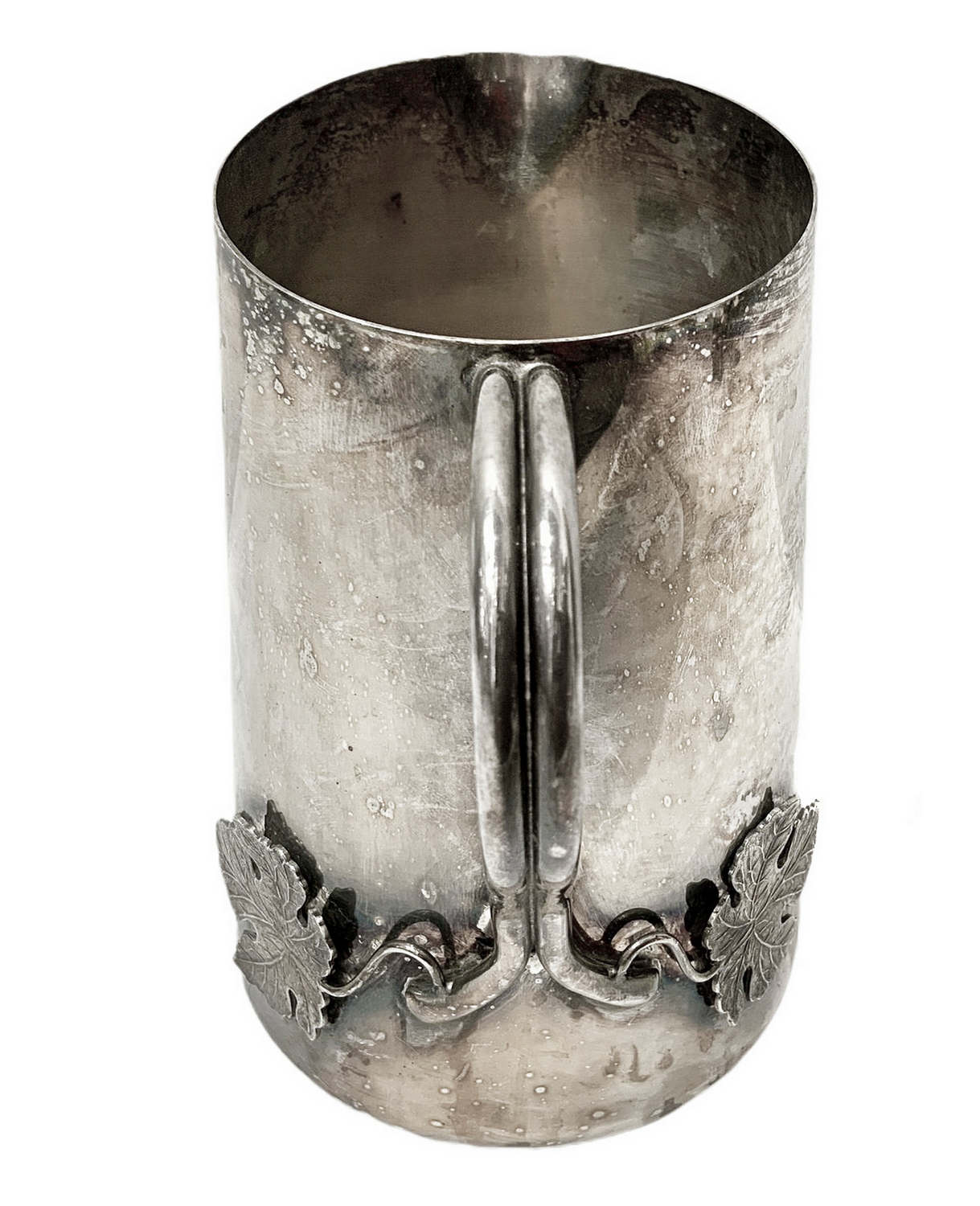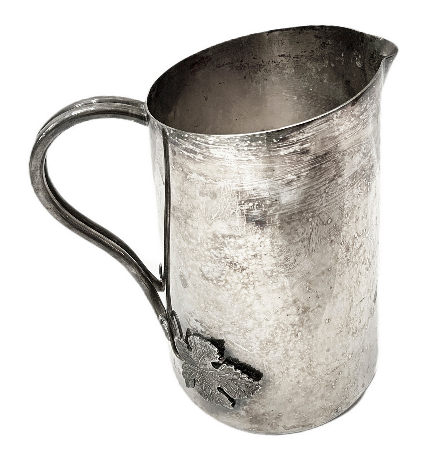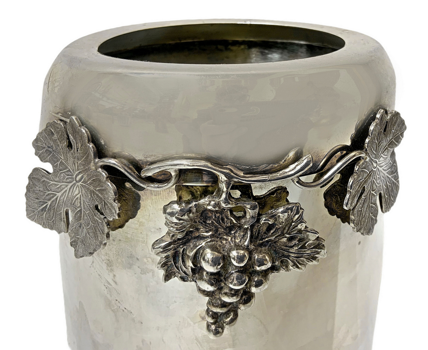 Trittico in Sheffield con applicazioni di foglie ed uva. anni '60,Composto da 2 caraffe ed un portabottiglie.