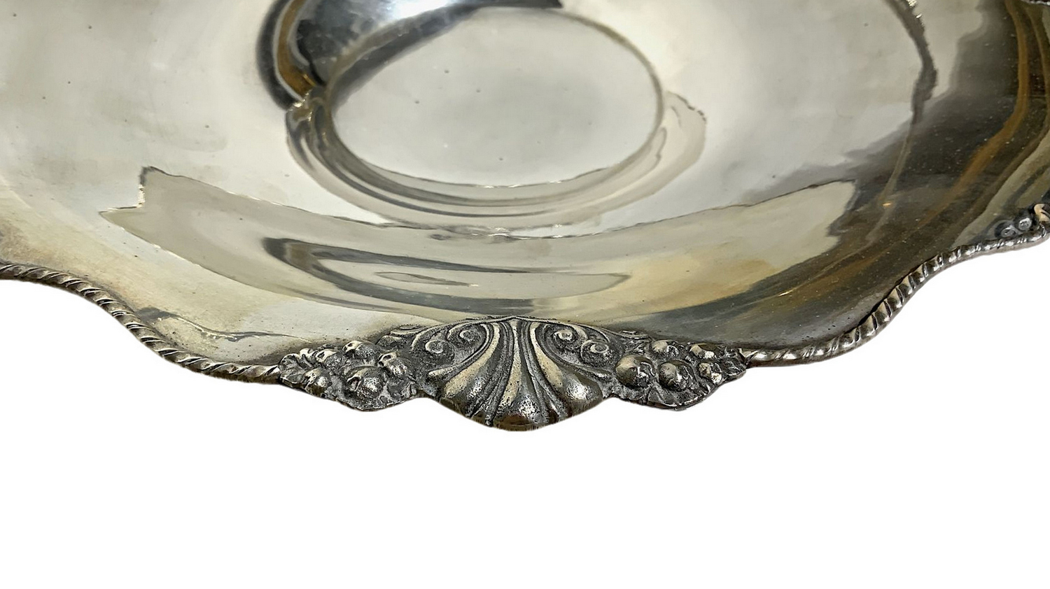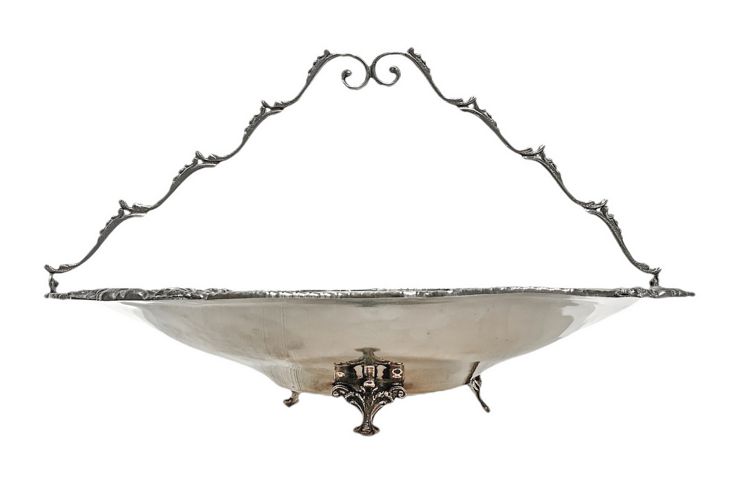 Centrotavola con manico in argento. H cm 7, con manico cm 17, larghezza cm.29. Decorazioni al bordo ed al manico gr. 648
