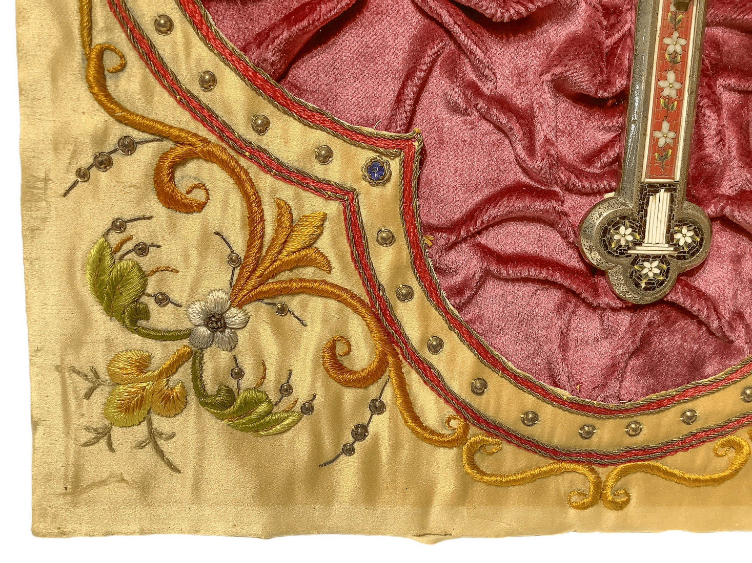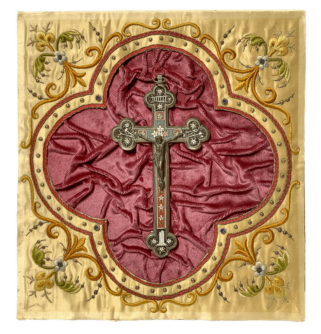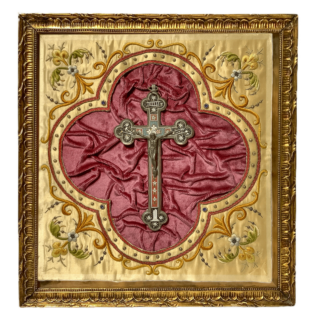 Crocifisso in bacheca di metallo argentato con tessere di vetro a mosaico....