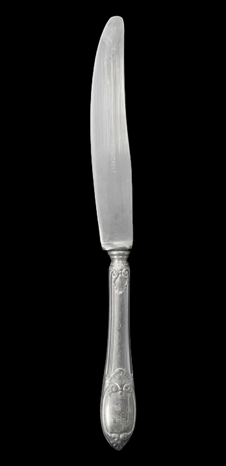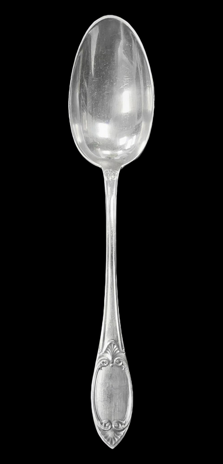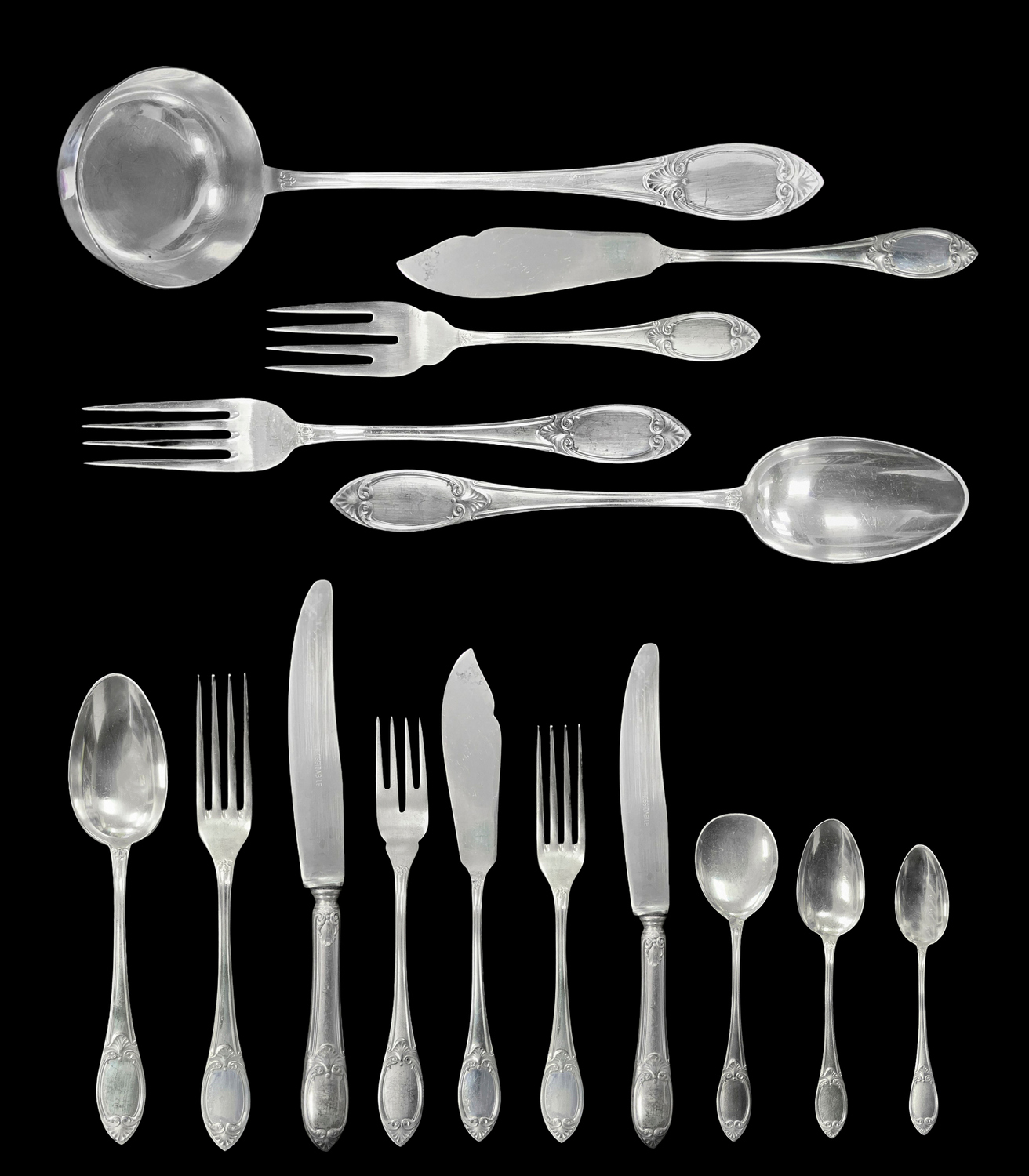 Servizio di posate in argento, Freni. Composto da: 24 forchette grandi (Kg 1.7), 12 cucchiai grandi (Gr 945), 12 forchette pesce (Gr 530), 12 coltelli pesce (Gr 630), 11 forchette frutta (Gr 430), 12 cucchiaini da caffè, 12 cucchiaini da tè, 12 cucchiaini da dolce (peso complessivo kg 1), 12 coltelli grandi, 12 coltelli frutta più cinque pezzi da portata (Gr 750)