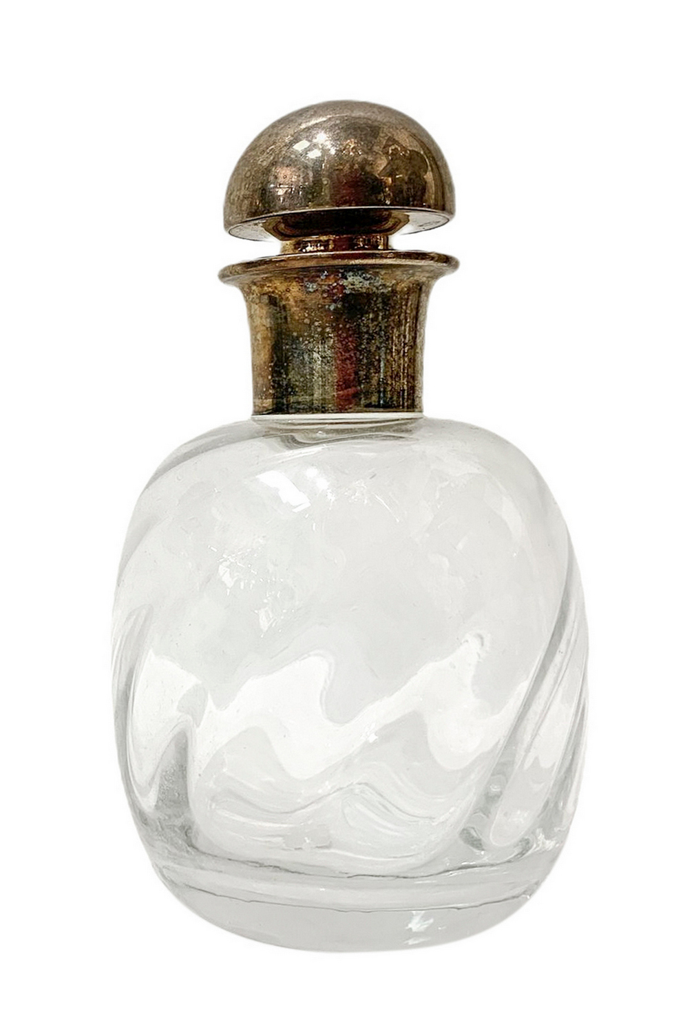 Coppia di bottiglie in vetro cordonato con tappo in metallo argentato. H cm 23. Produzione Italia. Italia,