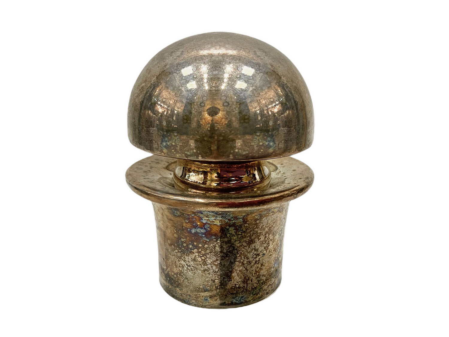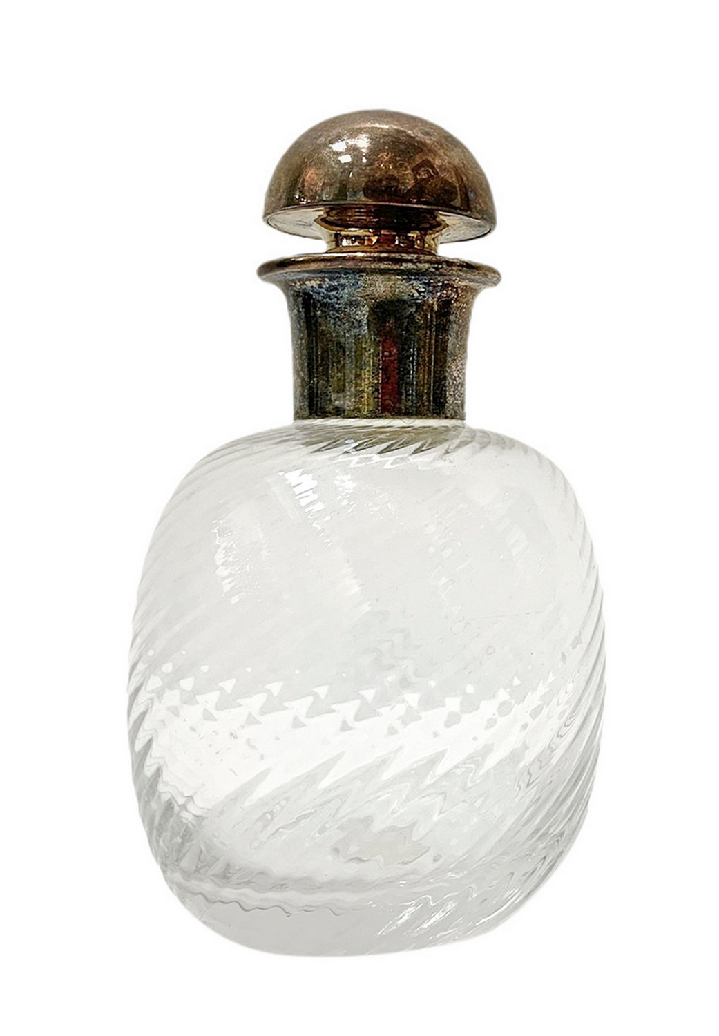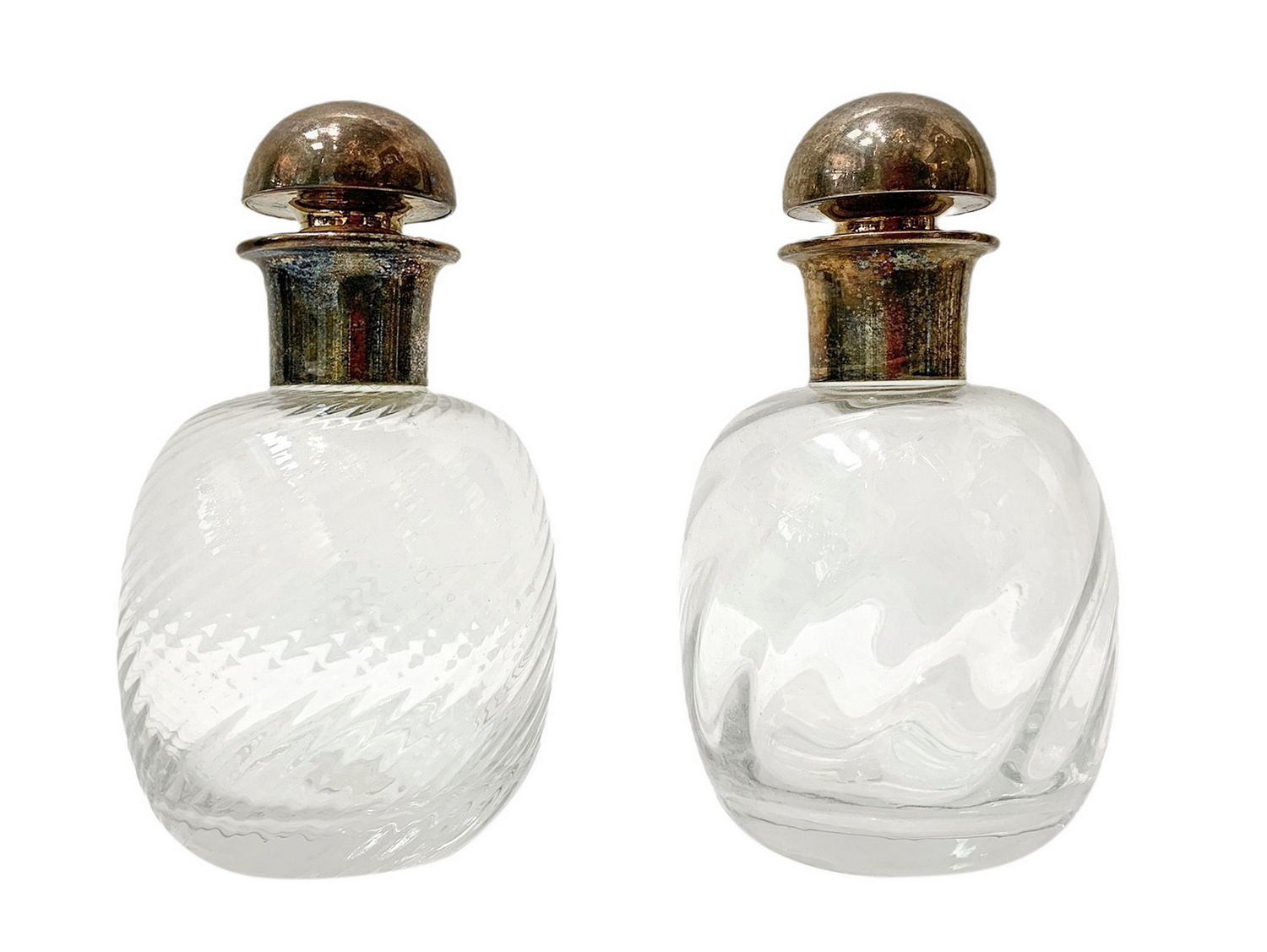Coppia di bottiglie in vetro cordonato con tappo in metallo argentato. H cm...