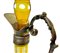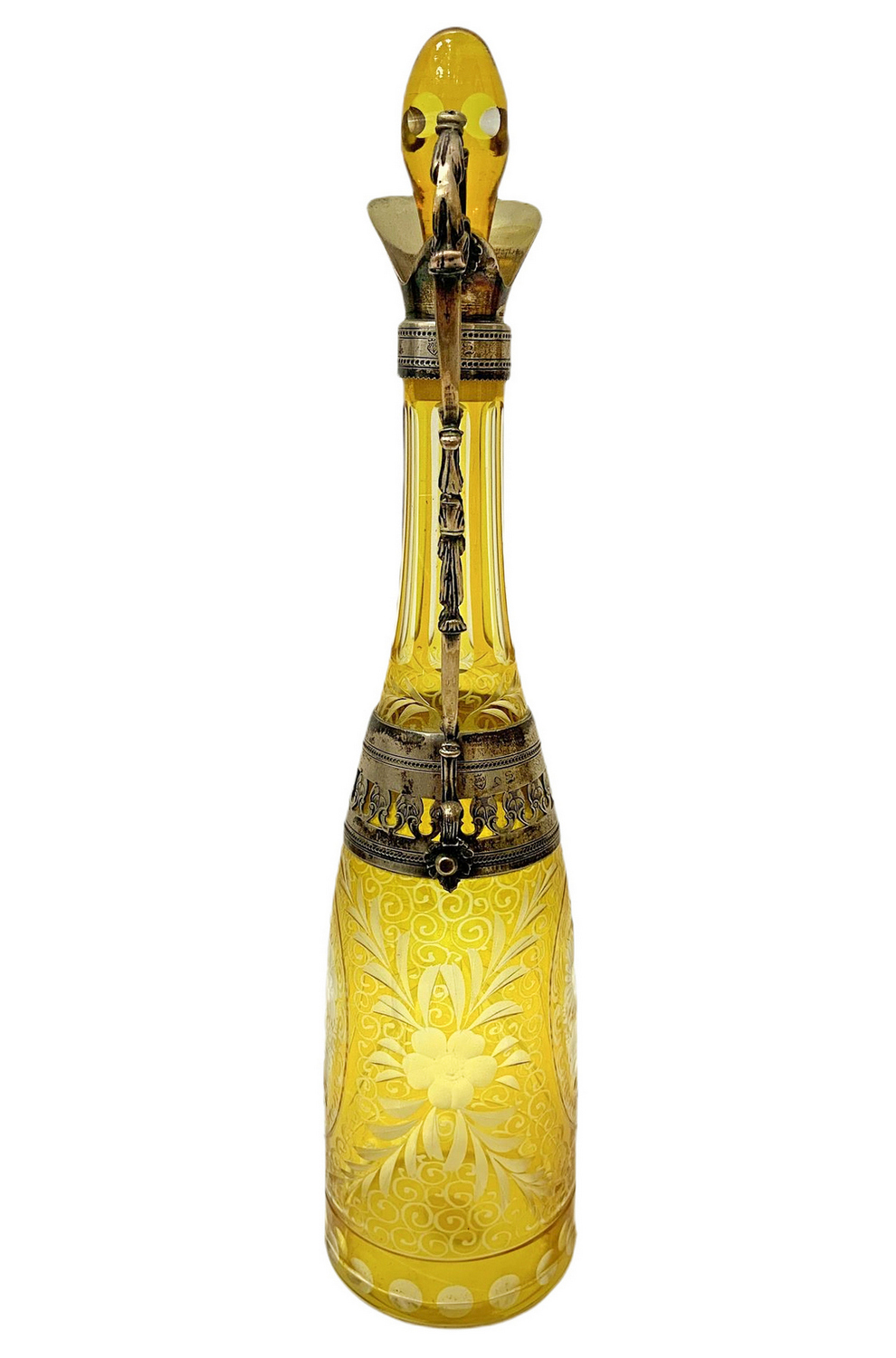 Bottiglia in vetro molato di Boemia nei toni del giallo con dettagli in argento.