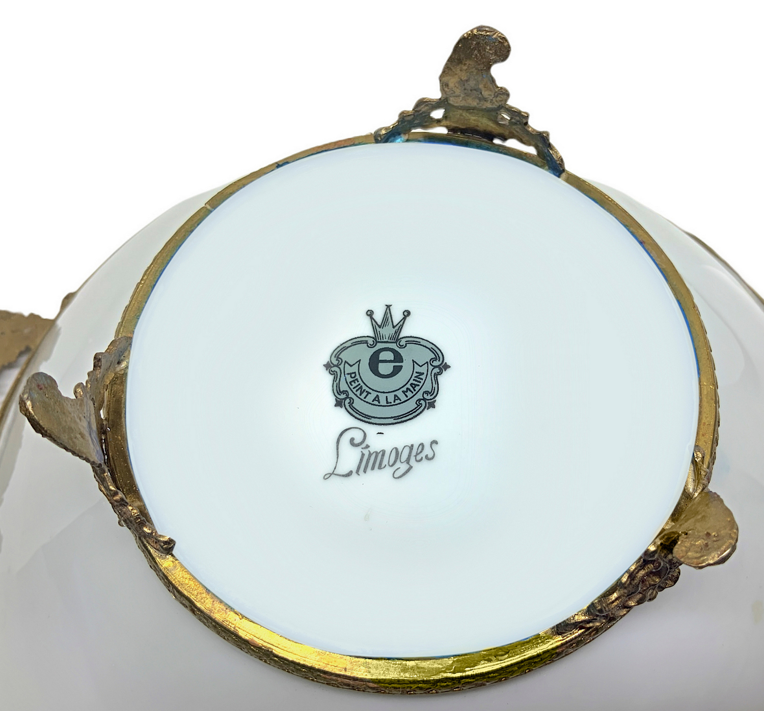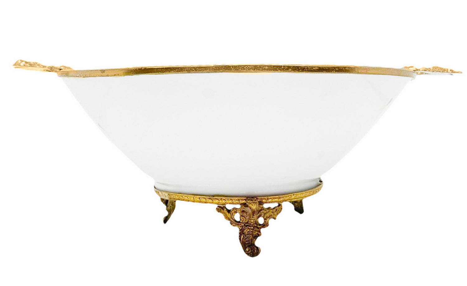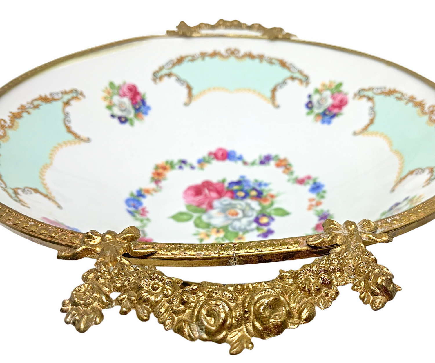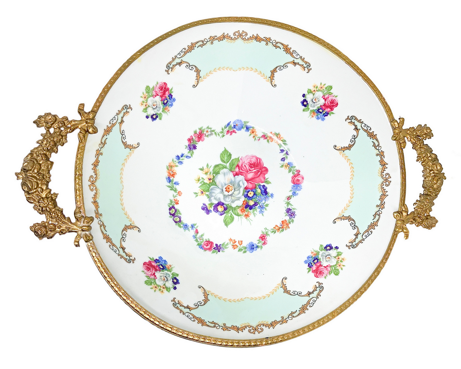 Centrotavola in porcellana decorata a mano con decorazioni floreali con manici realizzati in ottone. H cm 9,8 Cm 30x23