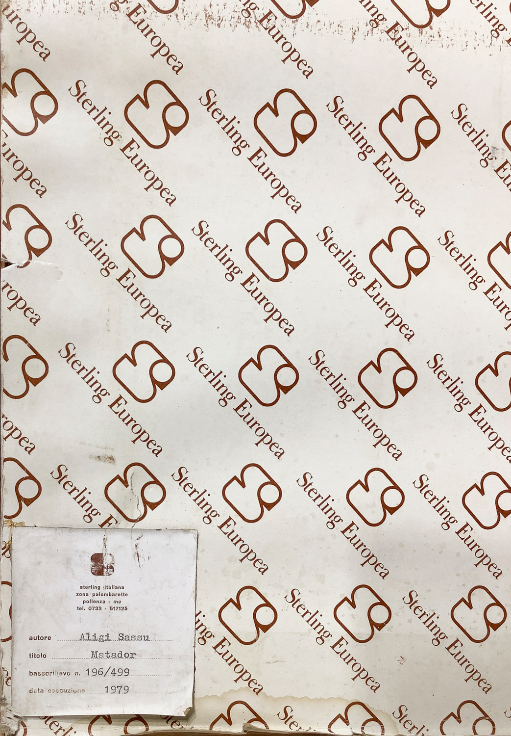 Bassorilievo di Aligi Sassu(Milano 1912-Pollenca 2000) su lastra di argento 925/1000. placcato in oro 24kt raffigurante matador-uomo con toro, firmato in basso a destra Sassu, multiplo di 196/499.
