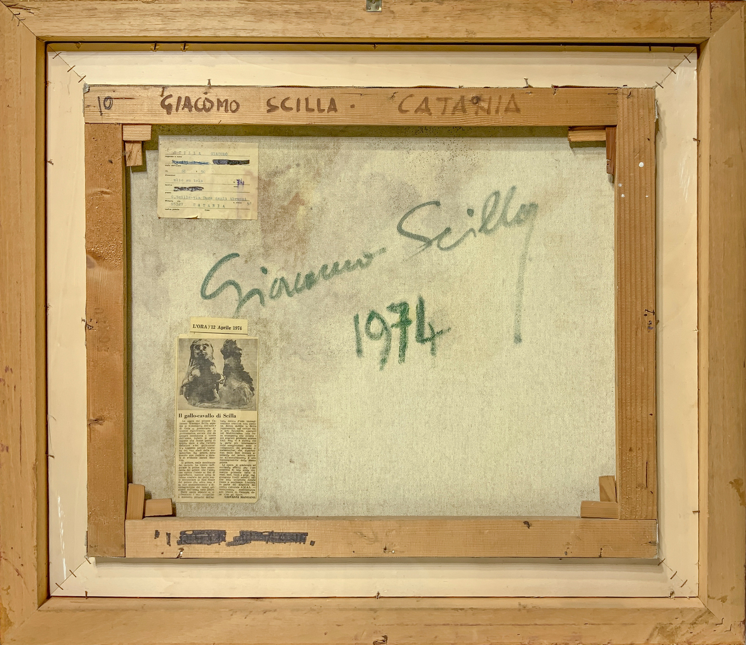Lot 421 | Dipinto ad olio su tela raffigurante “Il gallo di Scilla“,1974, firmato in...