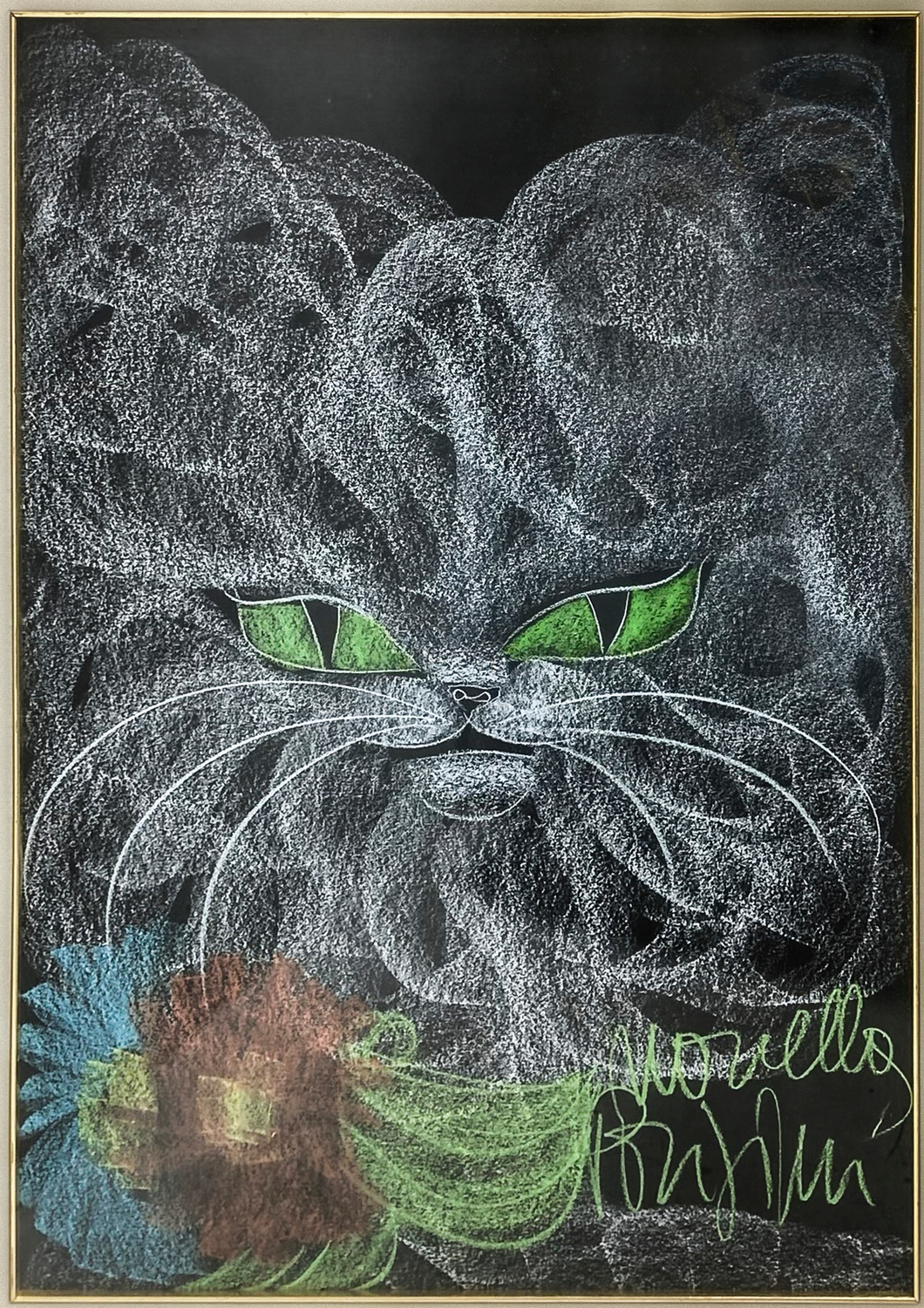 Dipinto a pastello raffigurante gatto con fiori, firmato in basso a destra Novella Parigini.