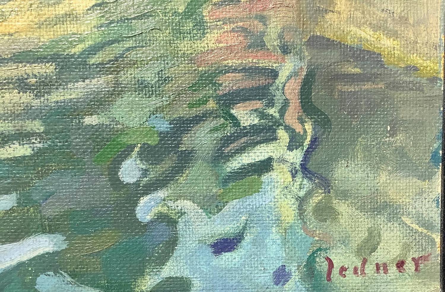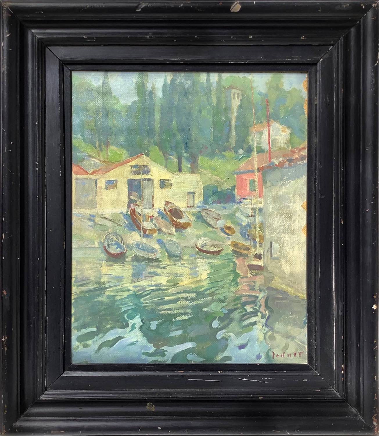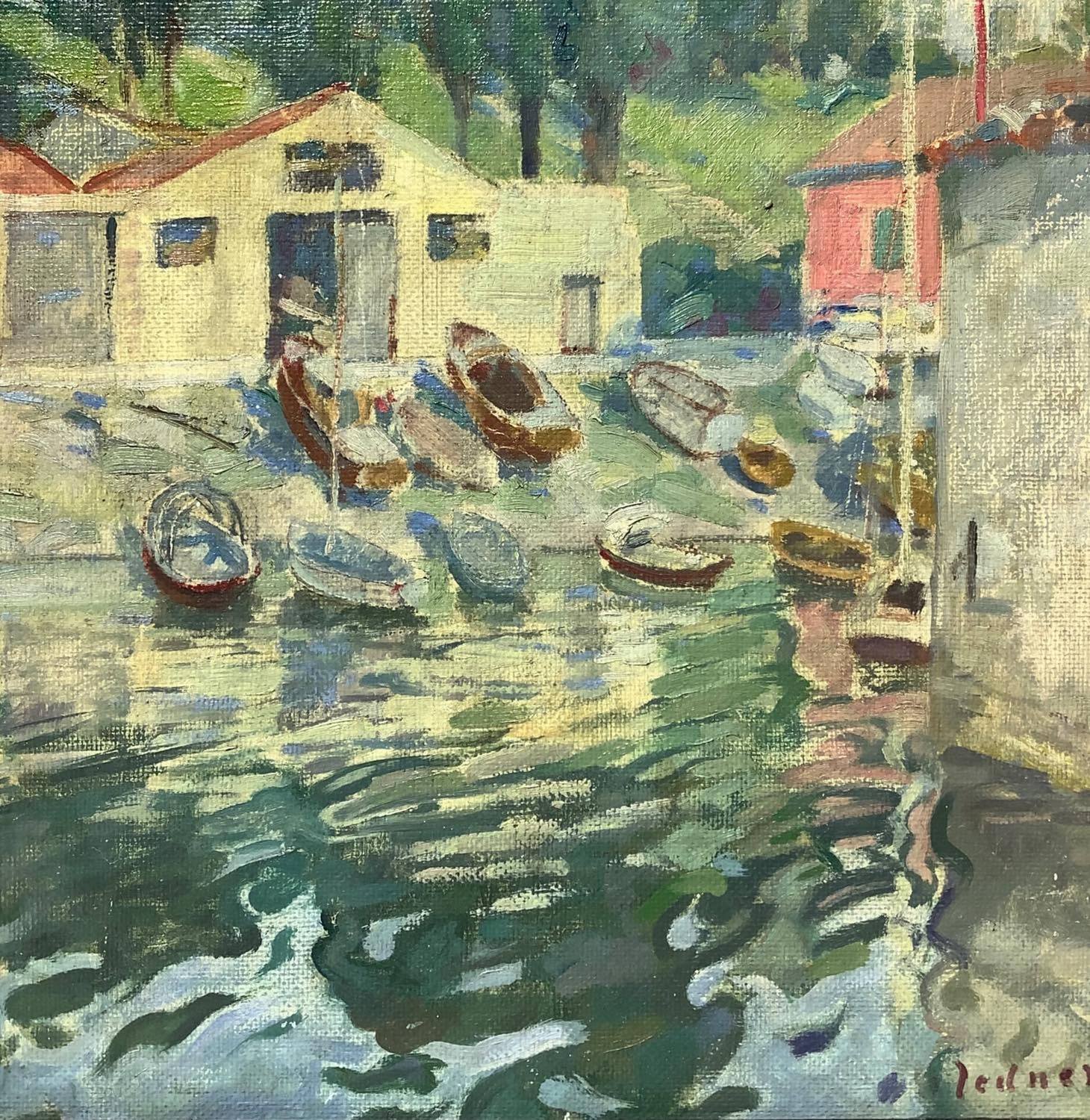 Dipinto ad olio su masonite raffigurante paesaggio fluviale con barche e case. firmato in basso a destra Ledner.