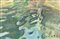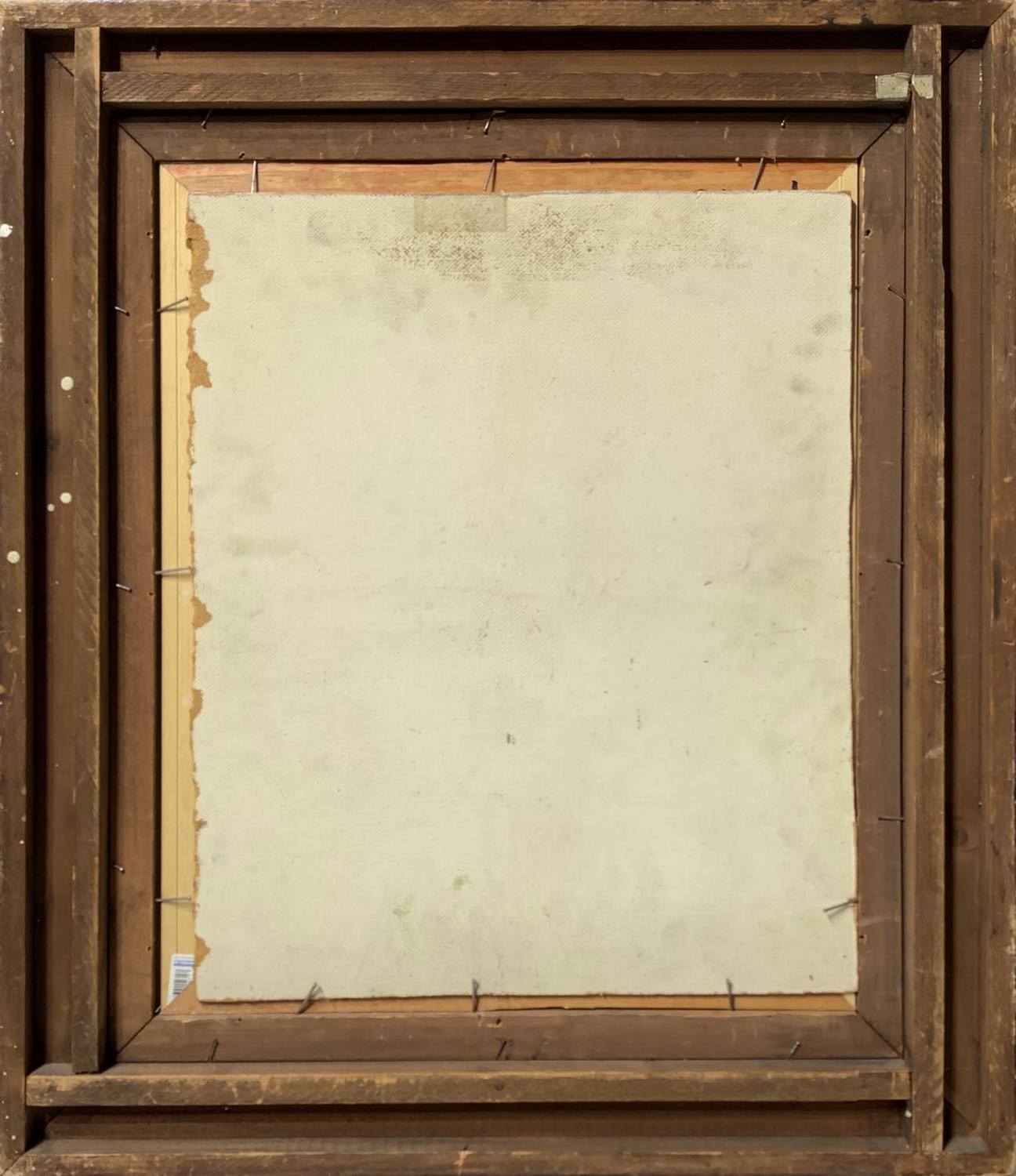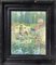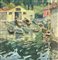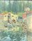 Dipinto ad olio su masonite raffigurante paesaggio fluviale con barche e...