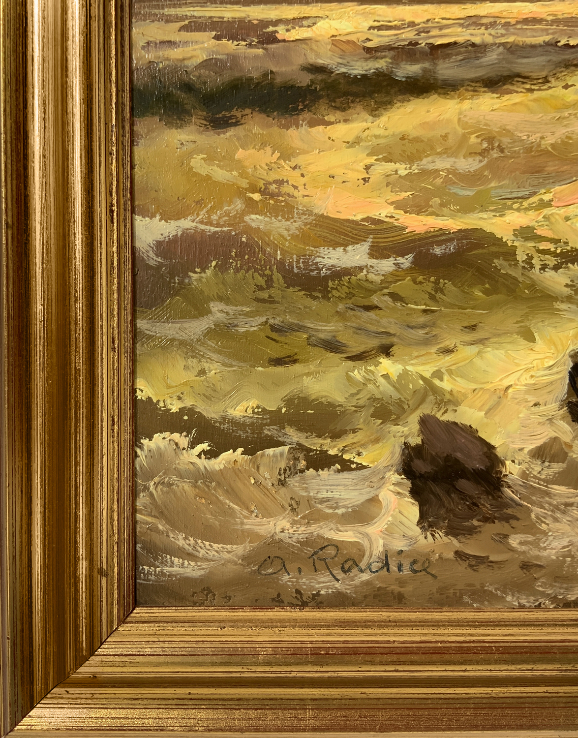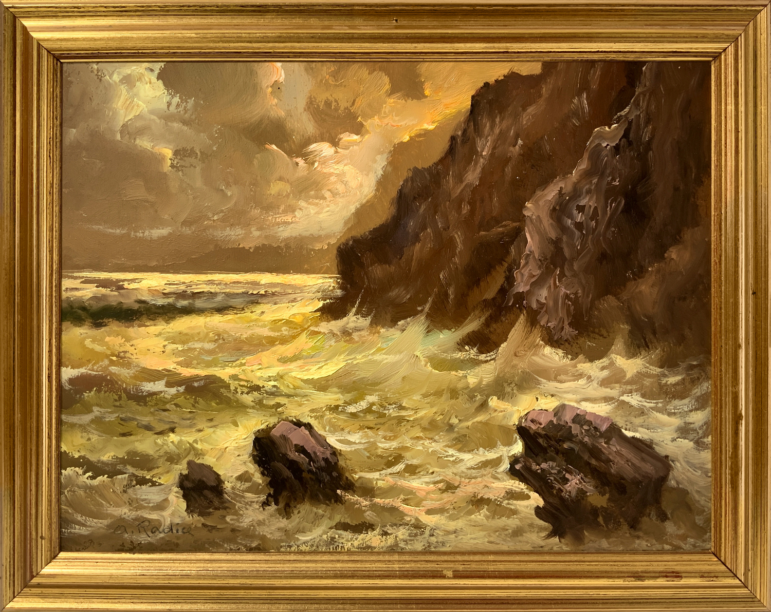 Dipinto ad olio su tavoletta raffigurante scogliera con mare agitato, firmato A. Radice.