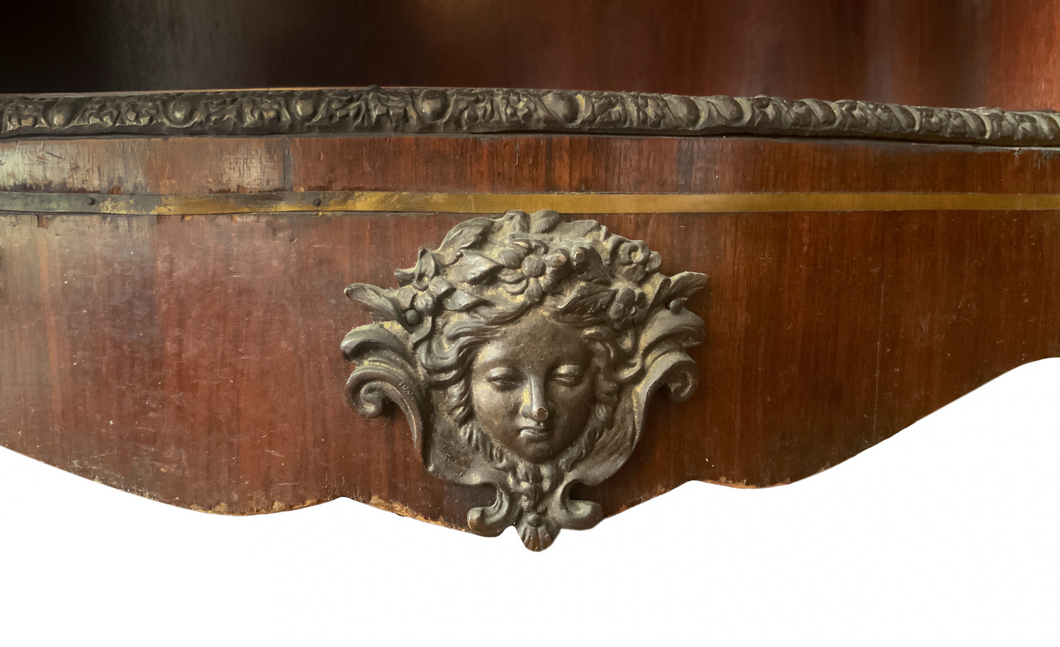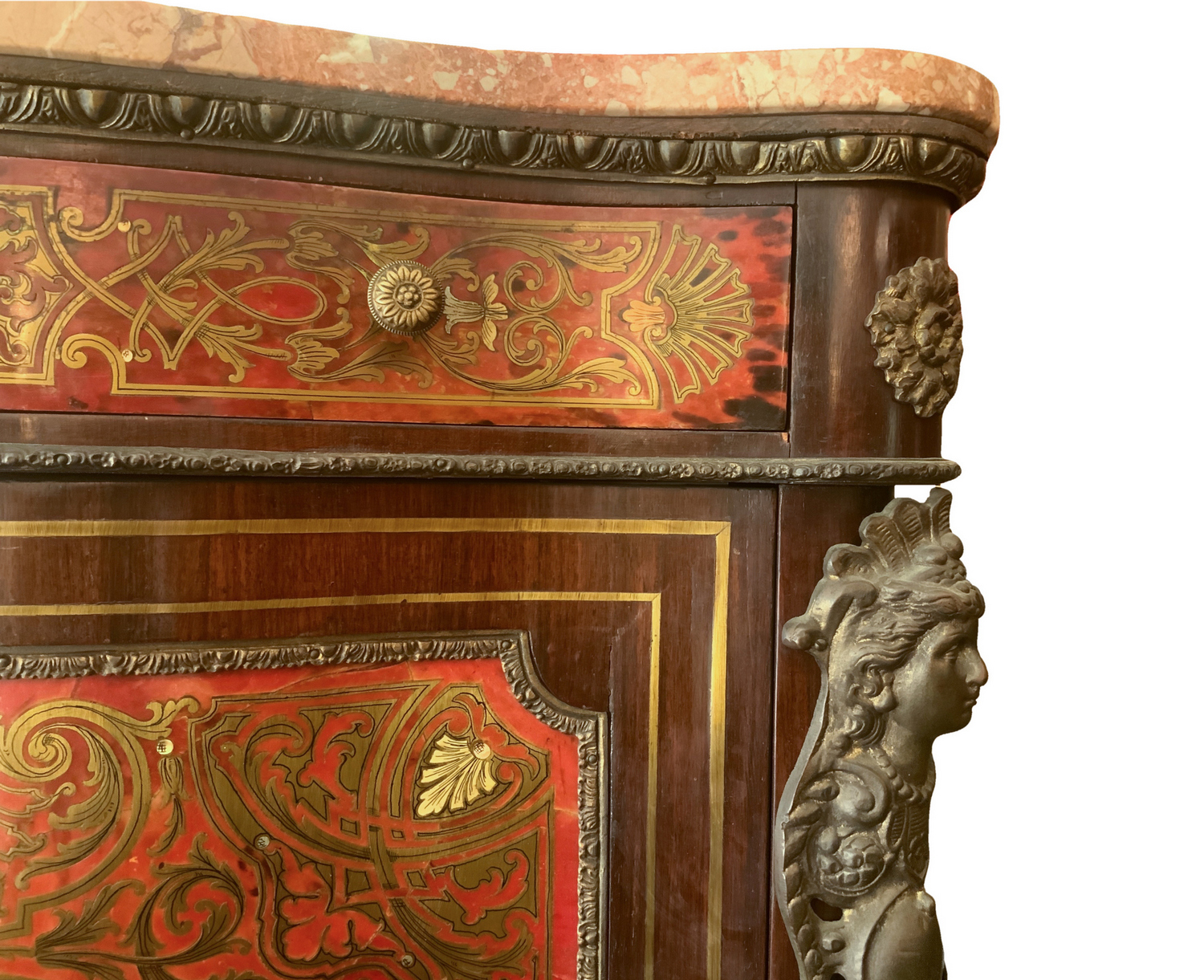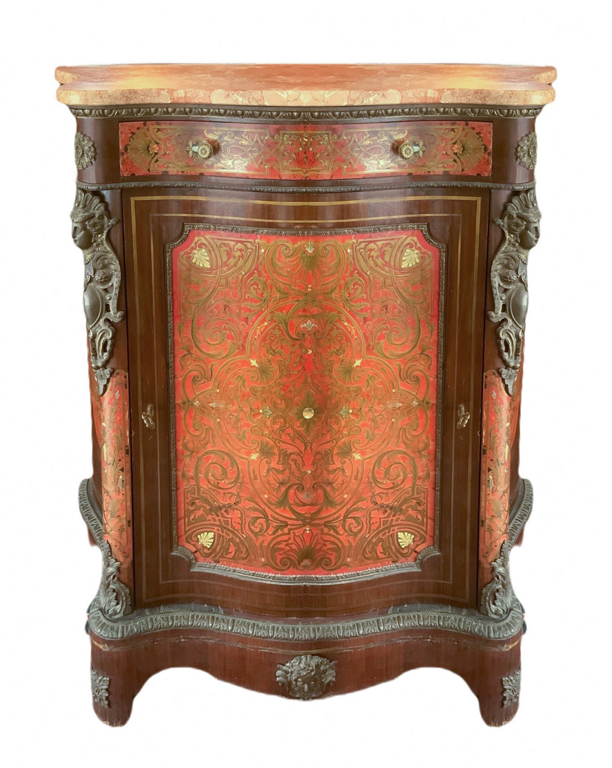 Etagere stile Boule, marmo al piano cassetto superiore e sportello inferiore, inizi XX secolo.