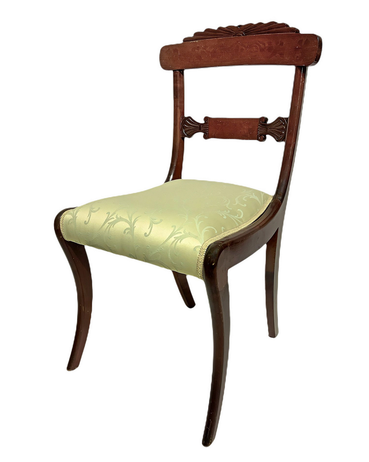 N. 6 sedie con spalliera intarsiata, piede a sciabola, inizi XX secolo. H cm 87.