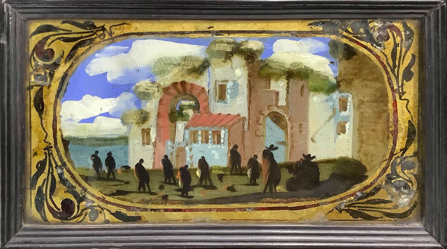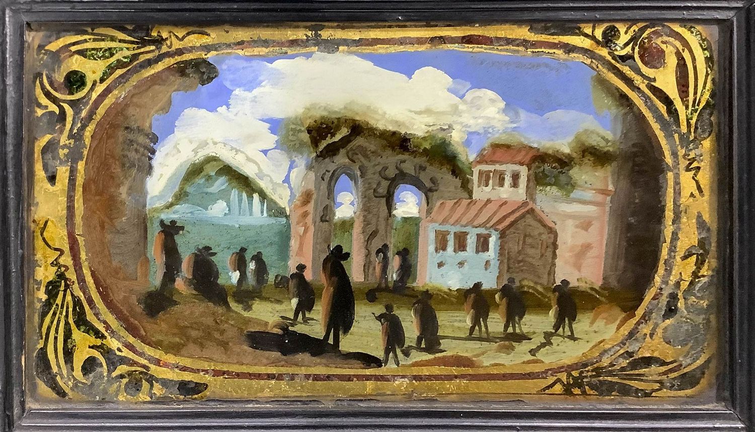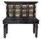Monetiere in legno nero ebanizzato a due corpi. XVIII/ XIX secolo,Avente come base tavolo in legno ebanizzato, 12 formelle ai cassetti di pittura su vetro raff. paesaggi con architetture.