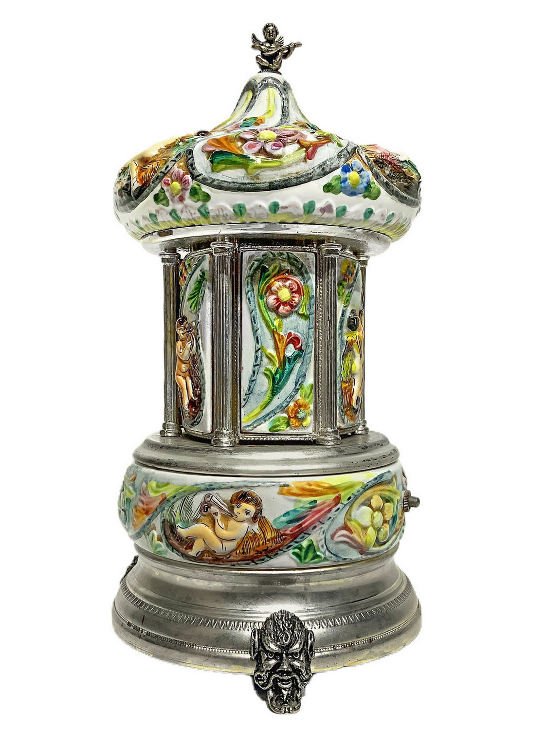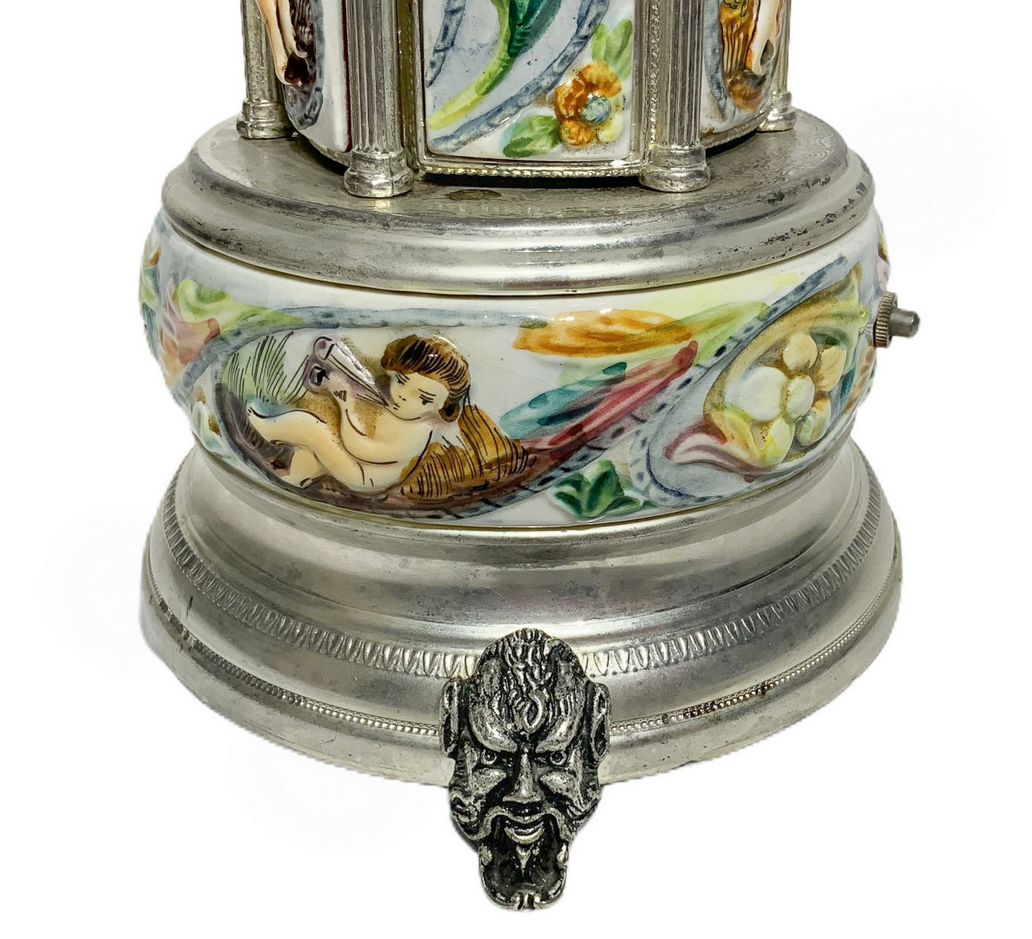Carillon portasigarette a pagoda. in maiolica decorata con puttini e metallo argentato anni 40/50