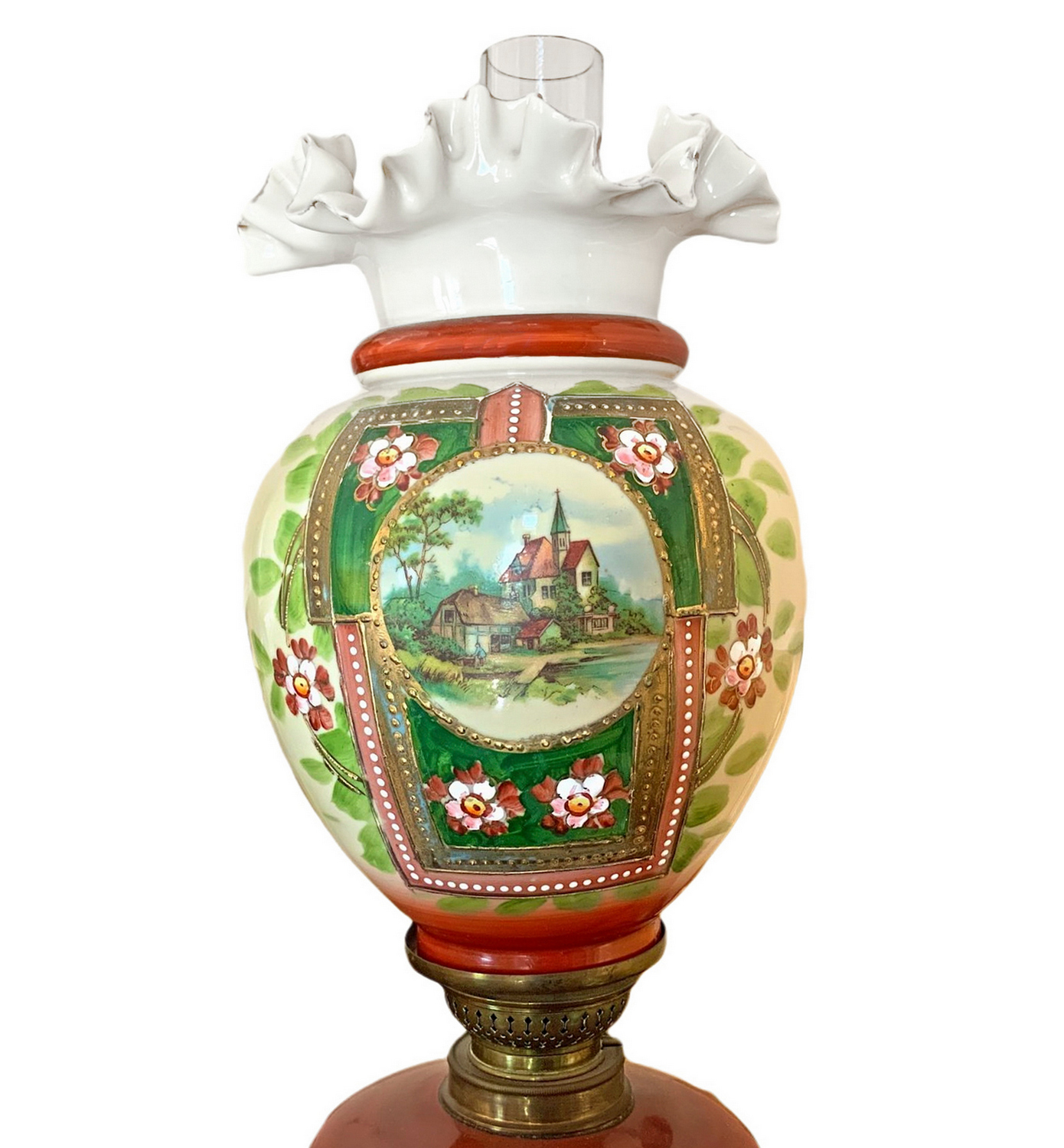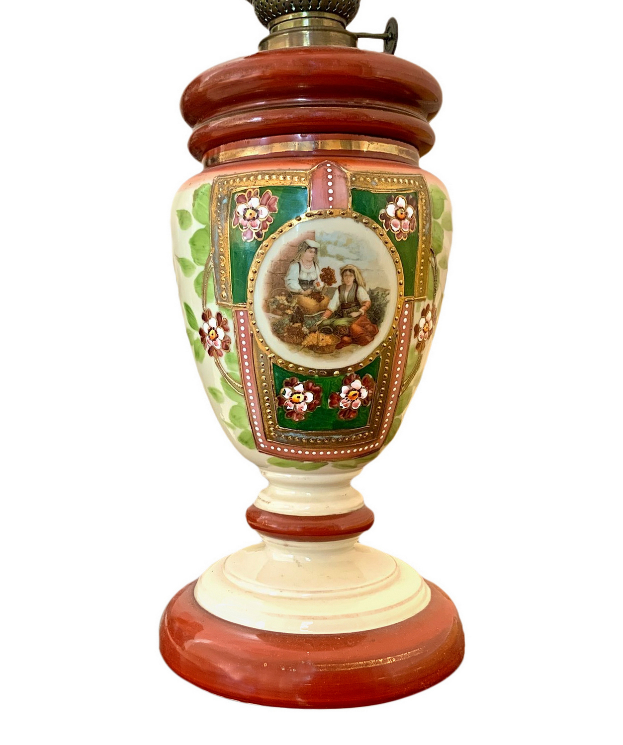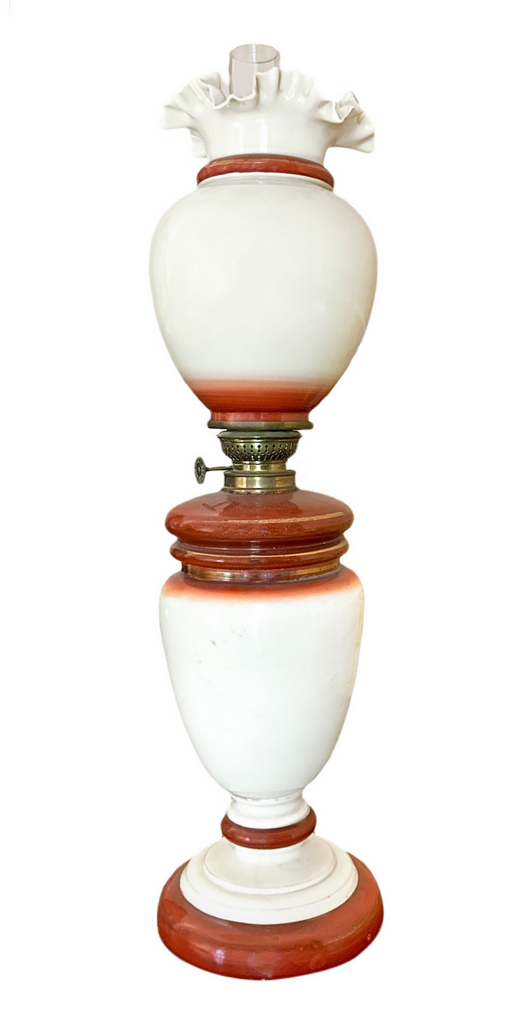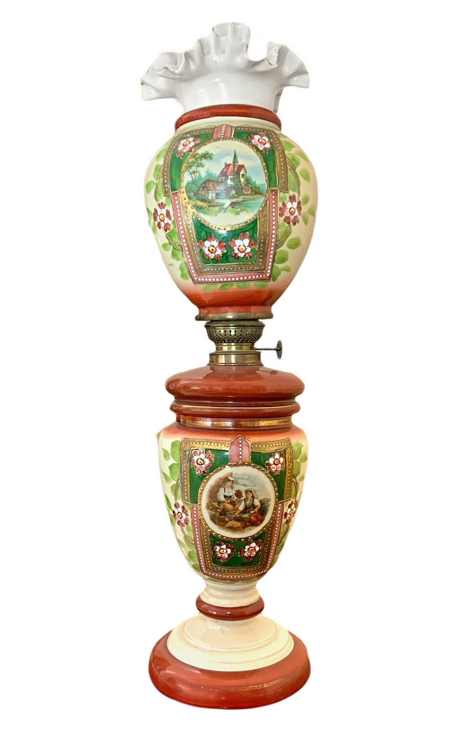 Lume a petrolio in opaline color beige, decorato a mano, fine XIX secolo.