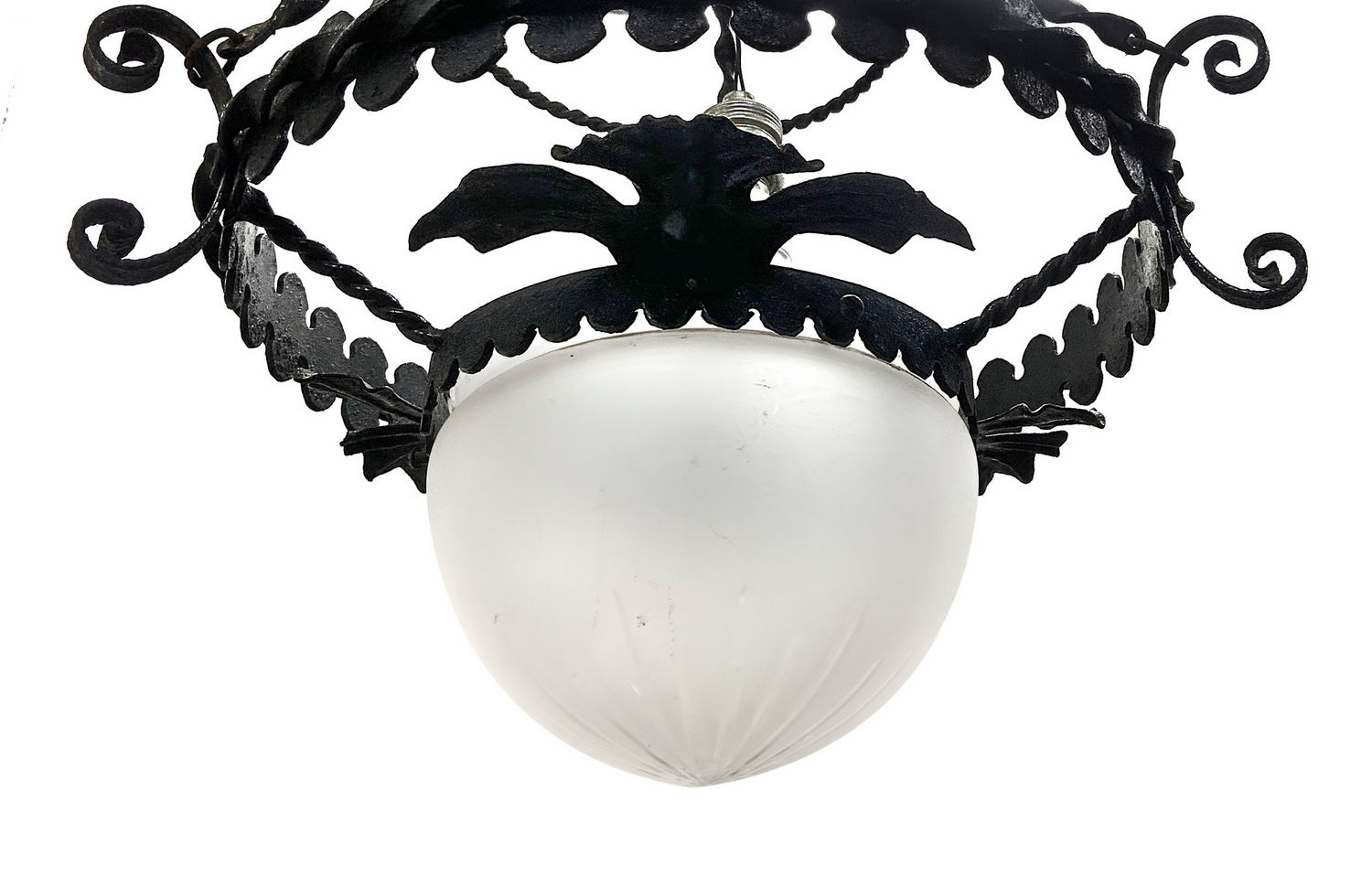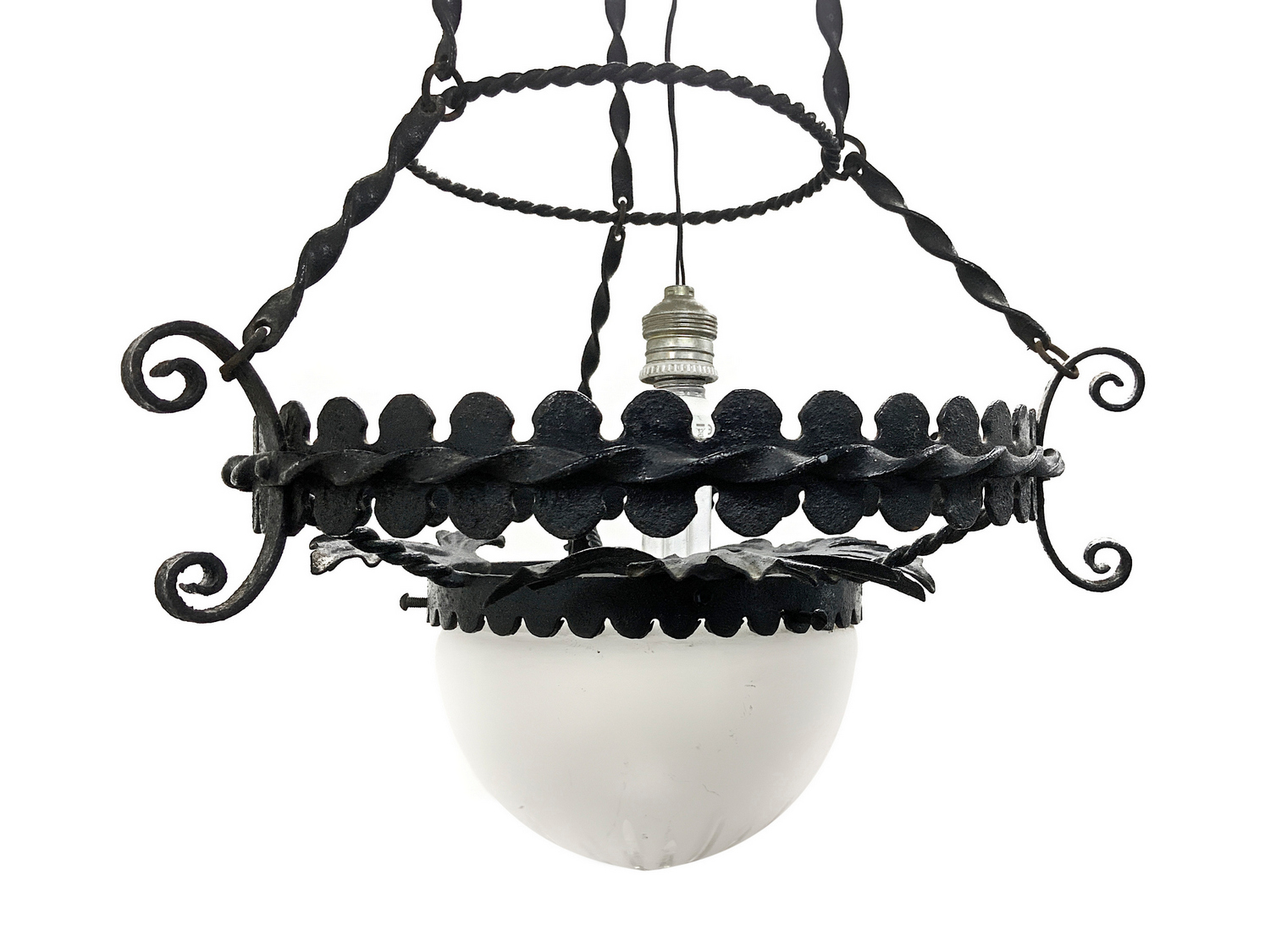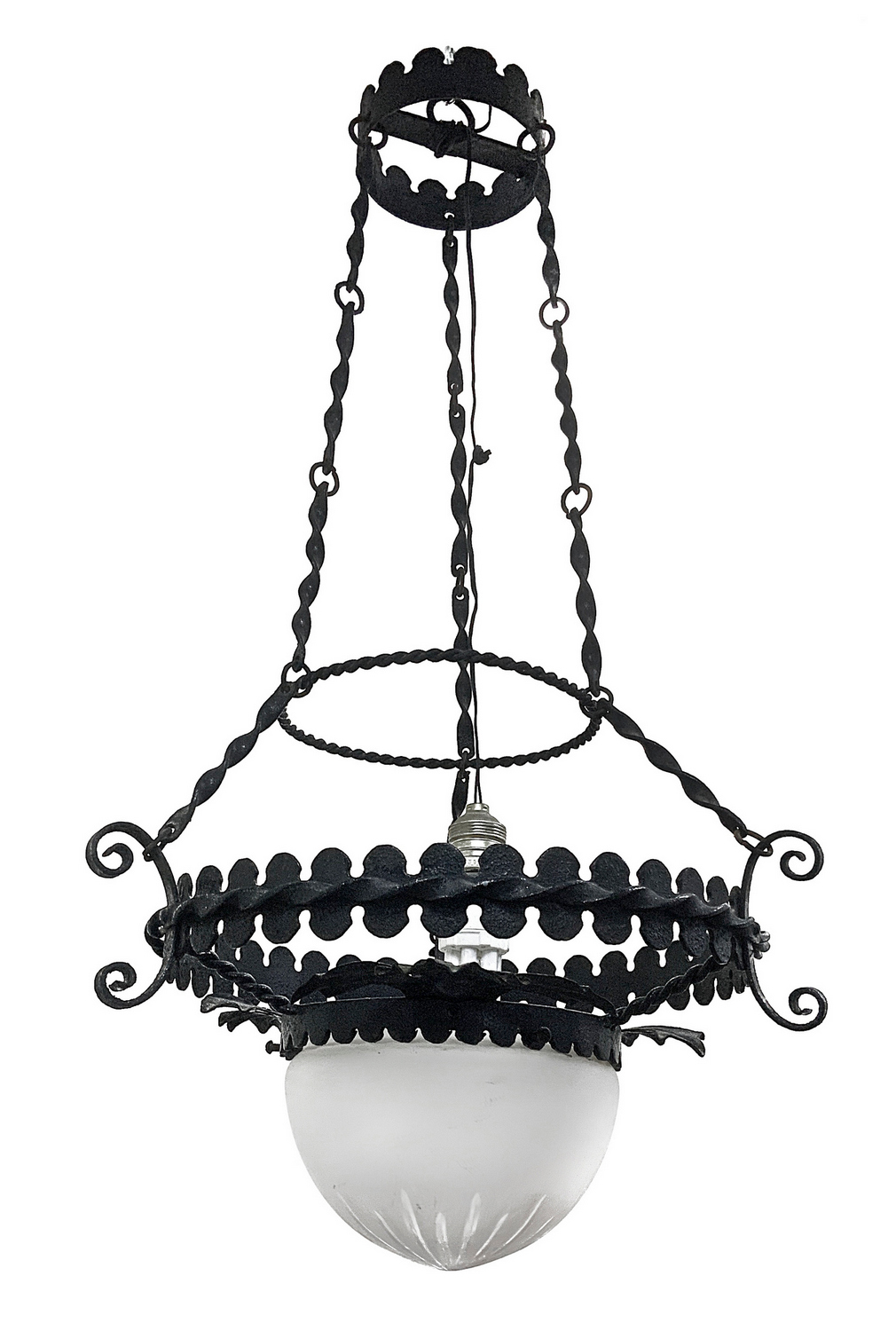 Lampadario in ferro battuto con coppa in vetro, fine XIX secolo. Fine XIX secolo,