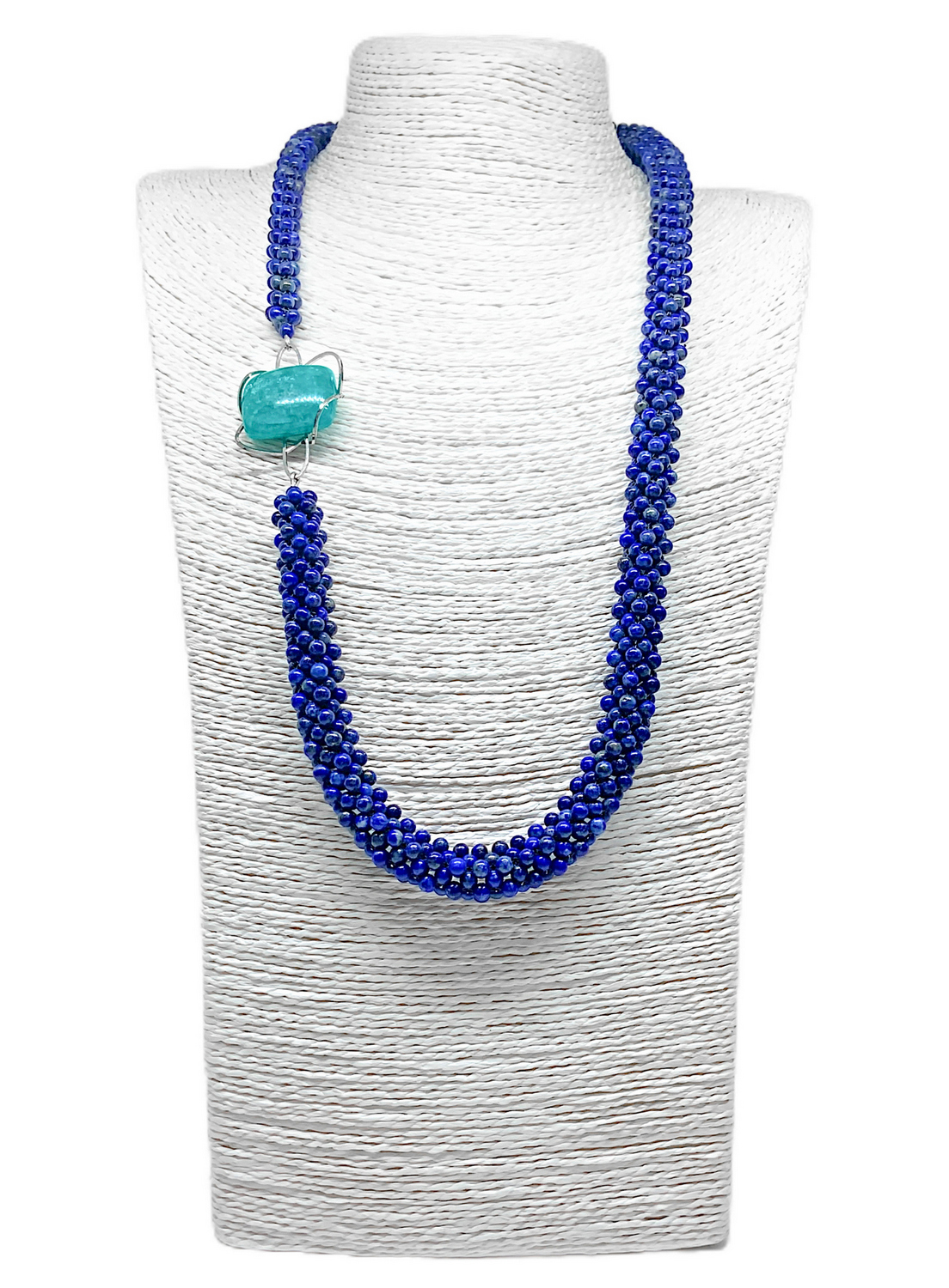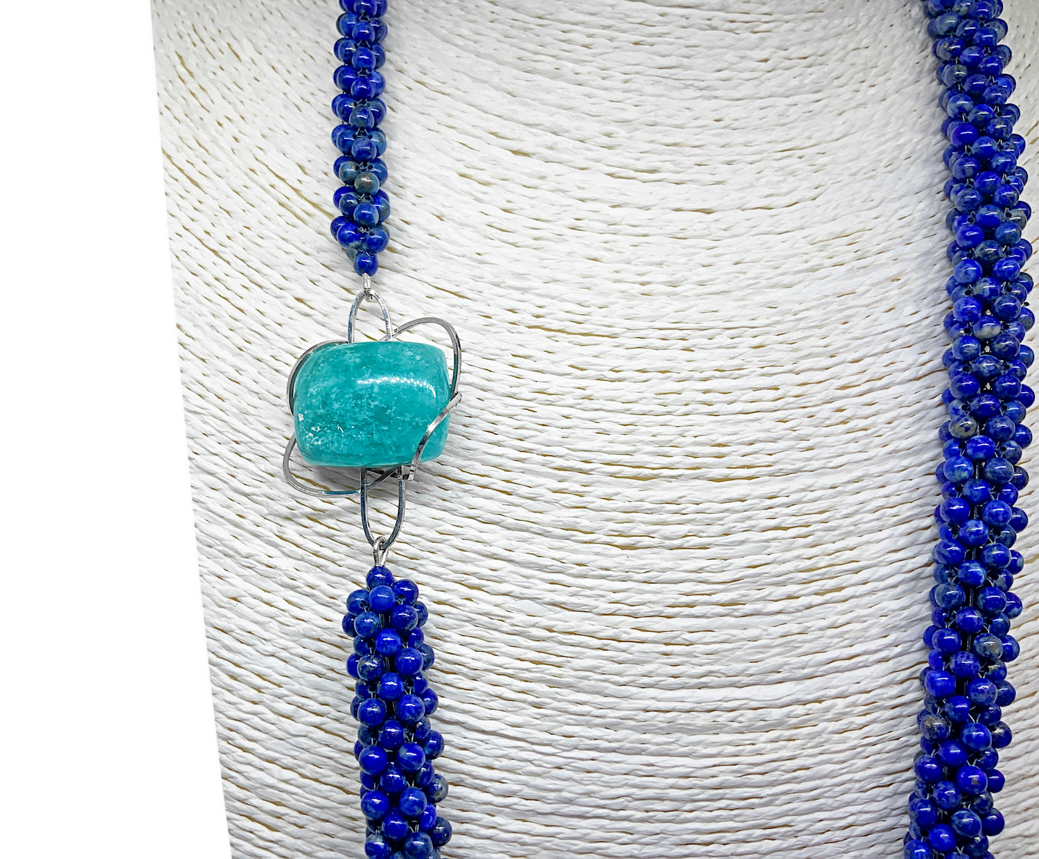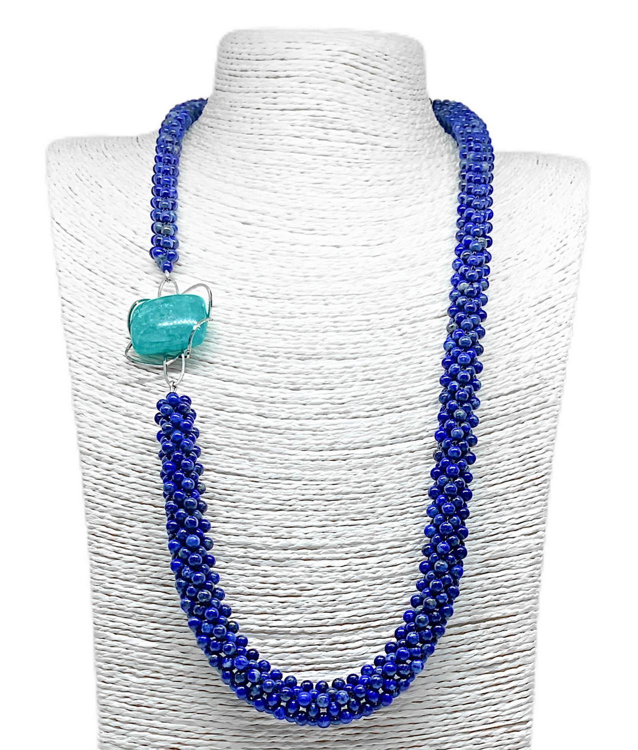 Collana intrecciata. di LAPIS LAZULI a struttura interna in Acciaio, con centrale in LARIMAR VERDE (PECTOLITE), chiusura Argento.