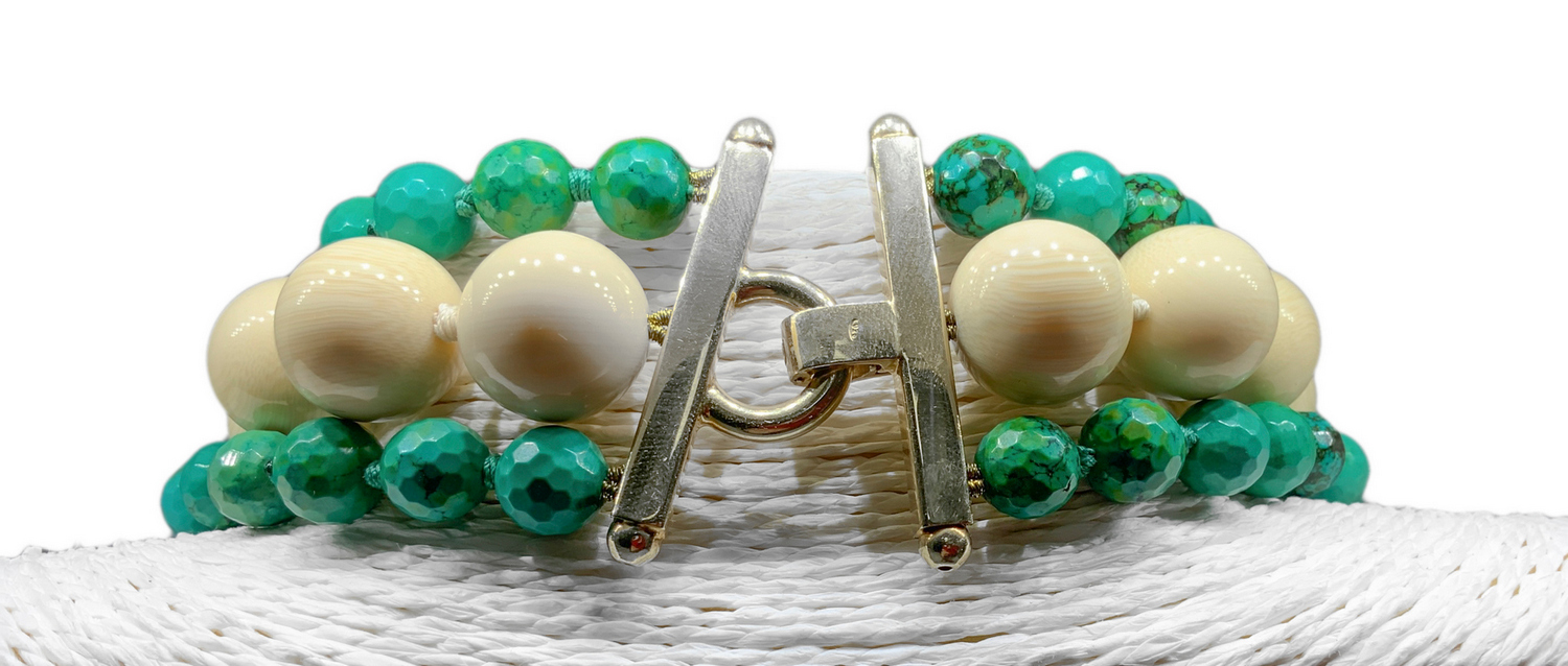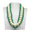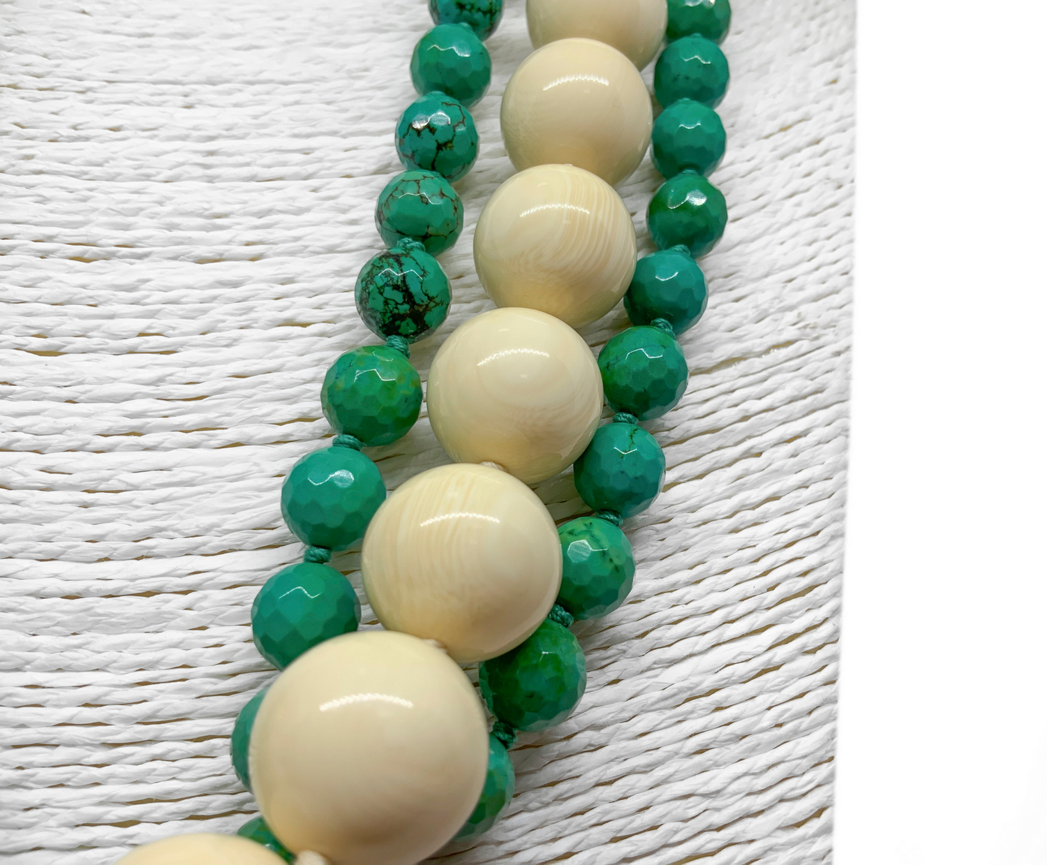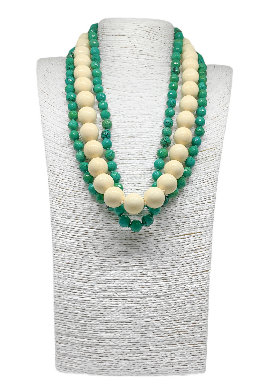 Collana tre fili, uno PASTA di OSSO mm 19, più due di CRISOPRASIO sfere sfaccettate (verde) mm 11. Chiusura in argento laccato oro.