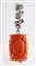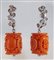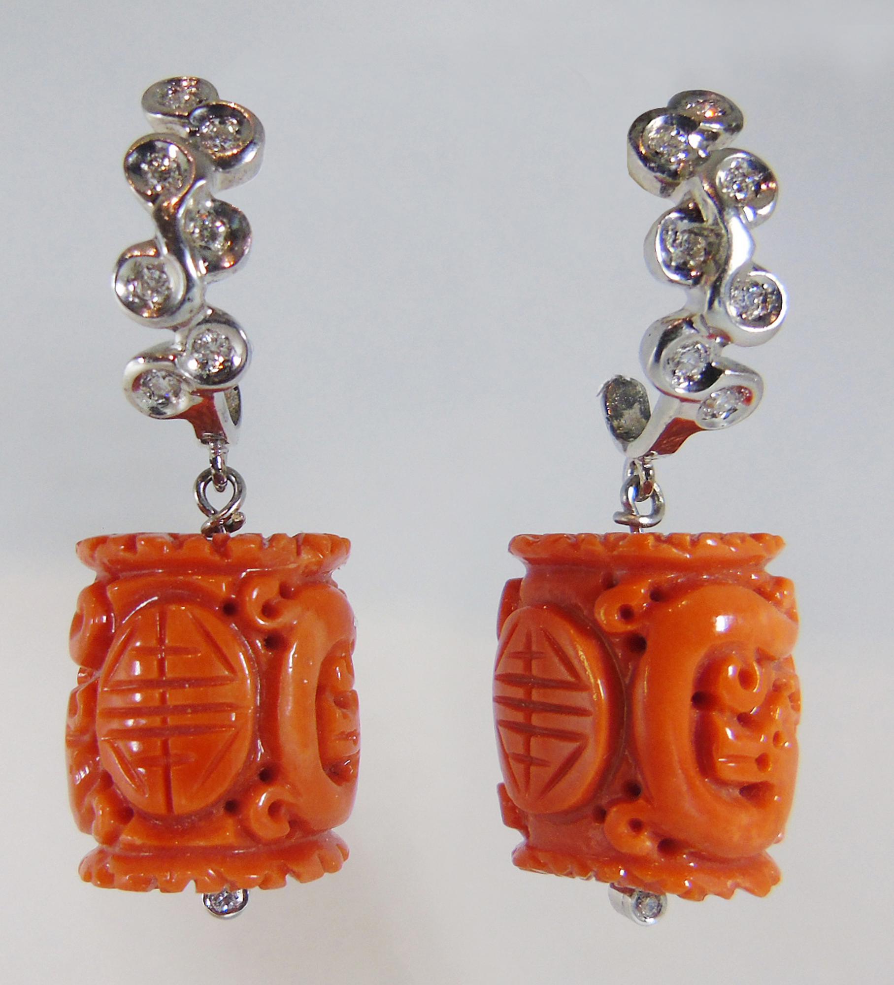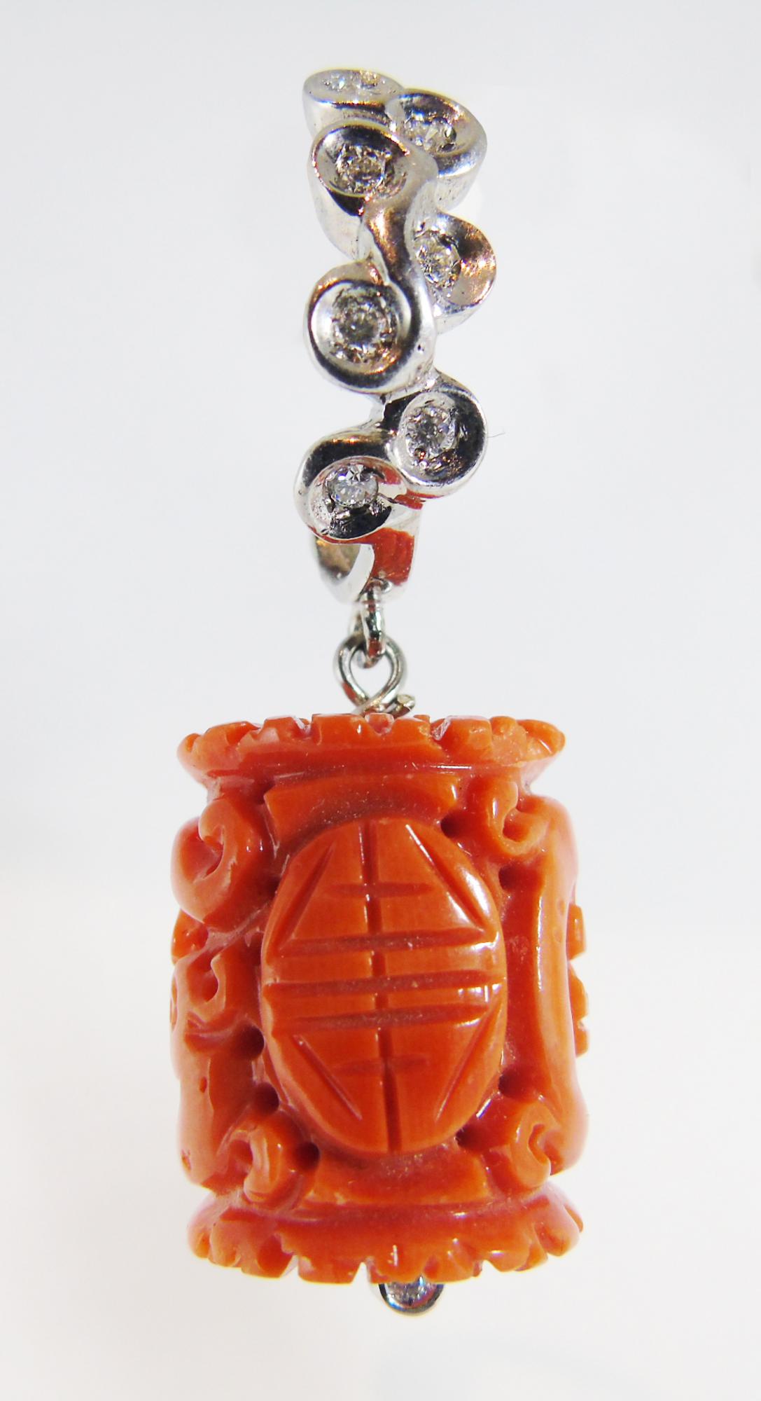 Orecchini in oro bianco 18kt, gr.9,80, a bauletto, corallo Momo Giapponese inciso e diamanti per ct. 0,14 circa.