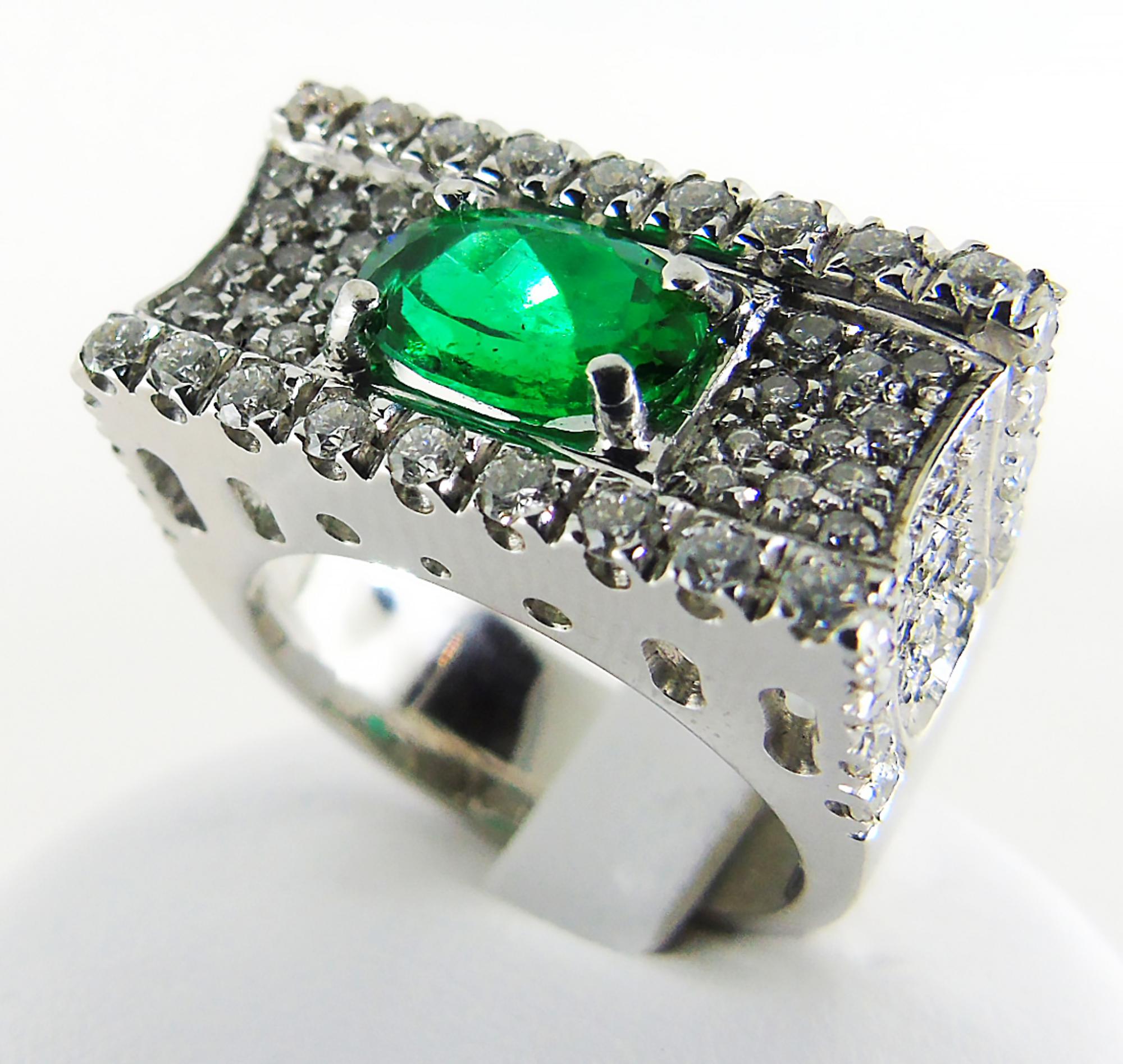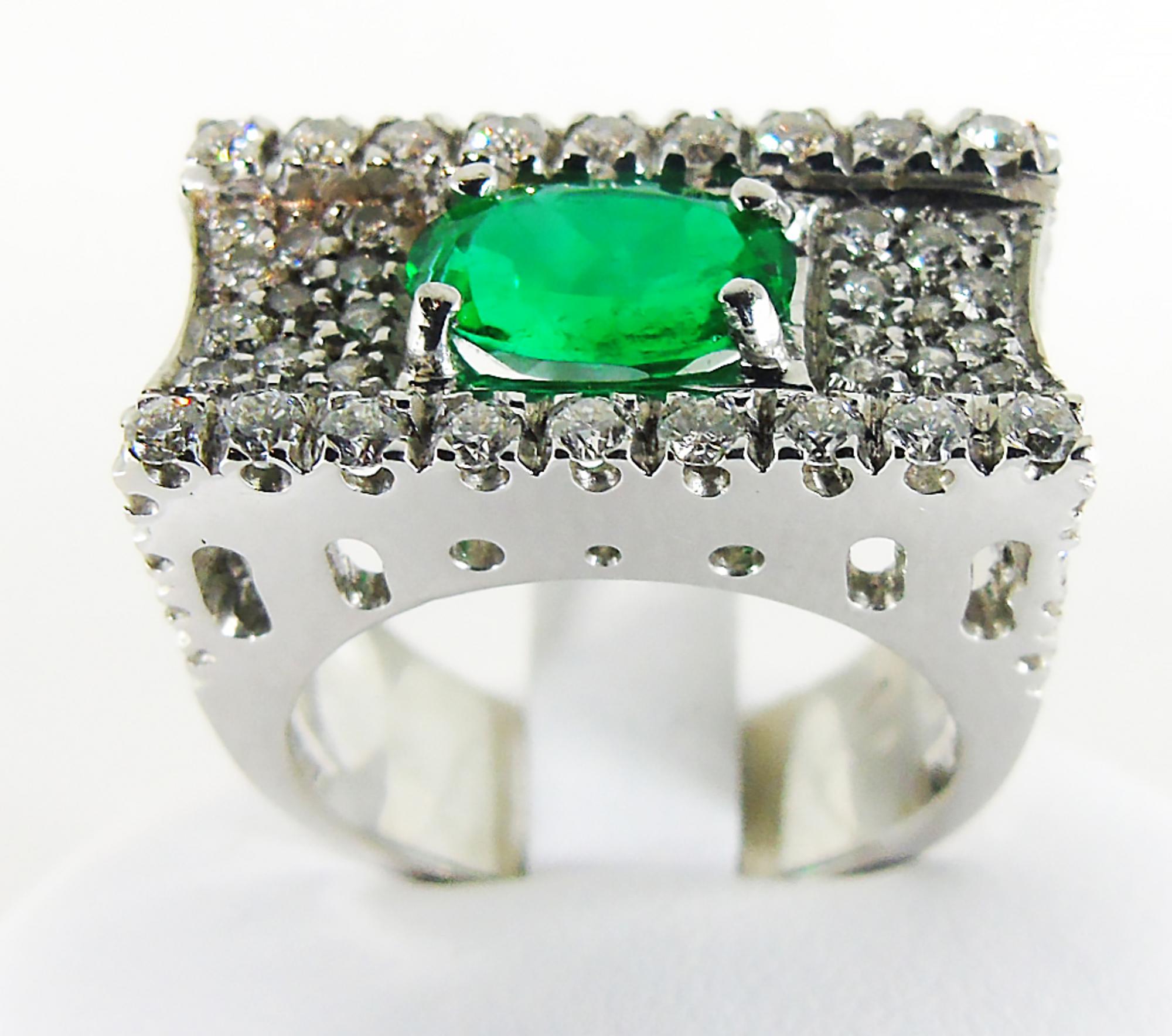 in oro bianco 18 kt, 14,30 gr. con smeraldo naturale colombiano di ct. 1,49 circa e brillanti.