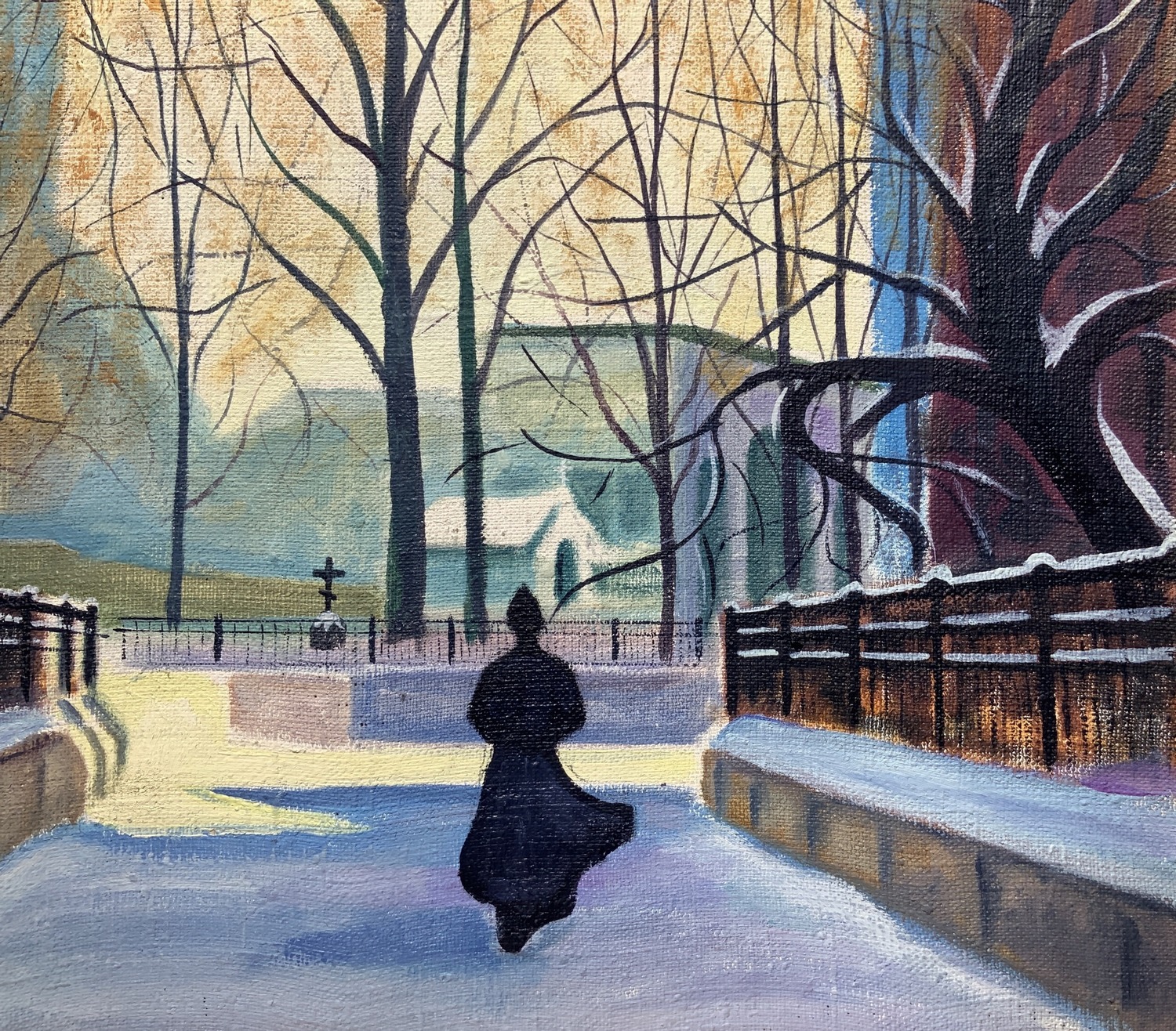 Pittura ad olio su tela raffigurante. "Monastero russo", firmato in basso a sinistra e sul retro e datato 1905. cm 70x65, in telaio 100 x 86 cm
