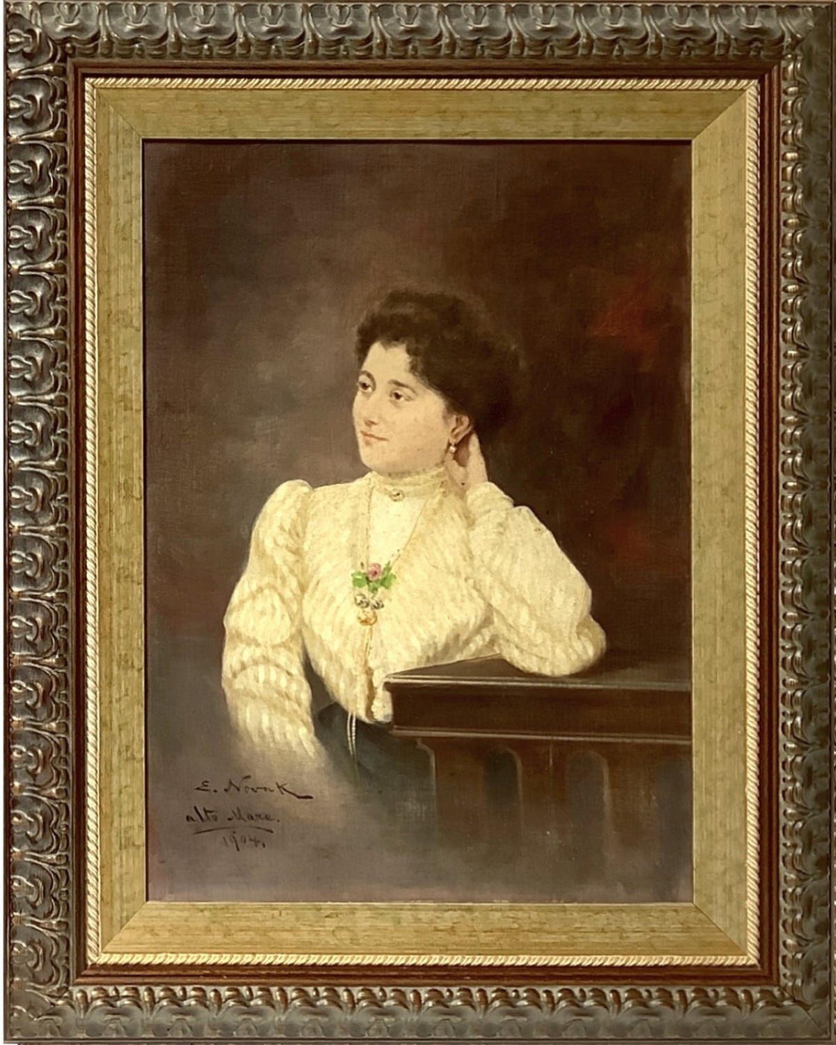 Pittura ad olio su tela applicata a cartone raffigurante la donna, firmato in basso a sinistra E. Nowak. 1904, "alto mare" e datato 1904.