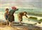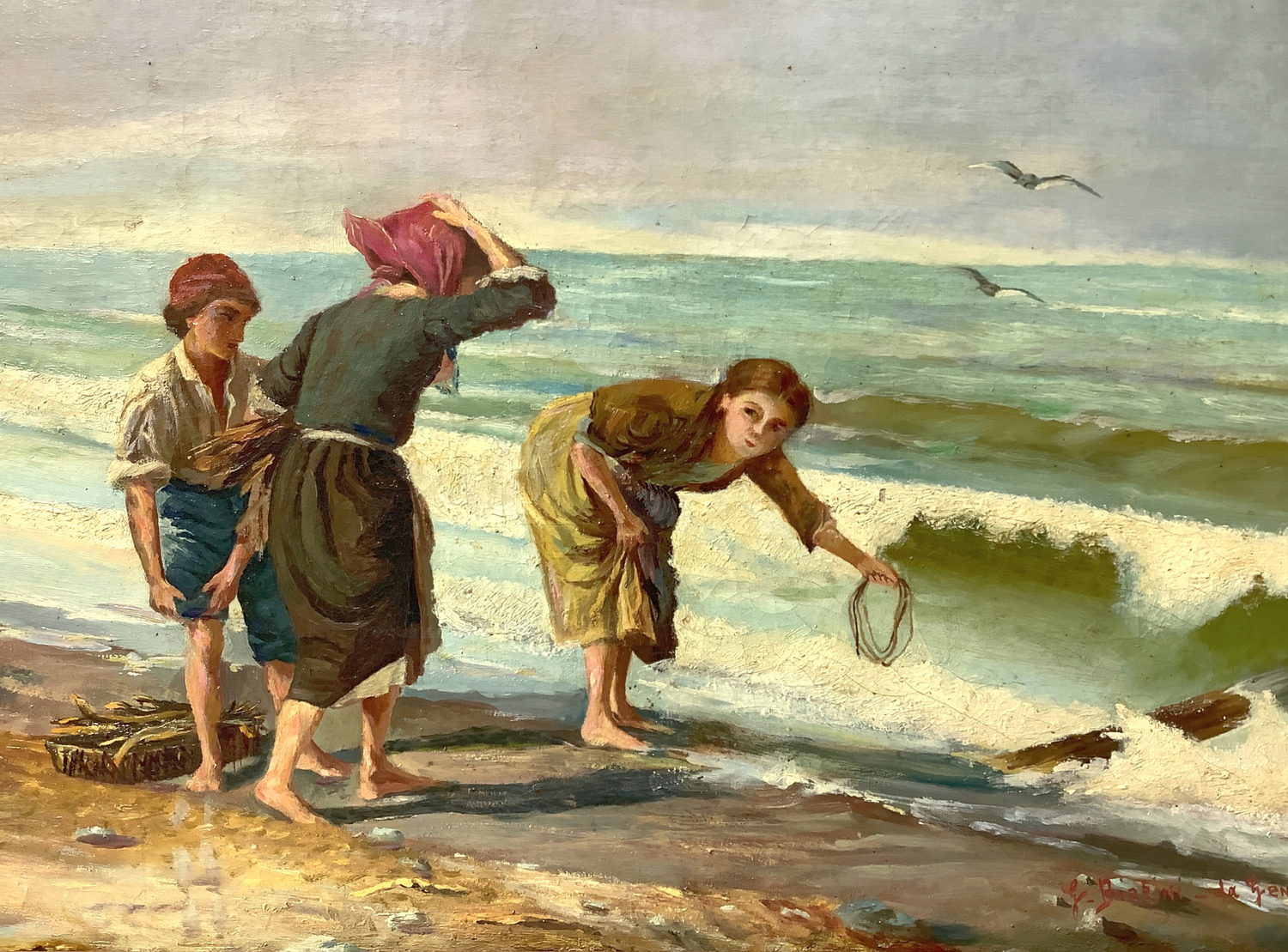 Pittura a olio su tela raffigurante le donne in riva al mare. 1905, firmato in basso a destra G. Biagini da Genova e datato 1905.