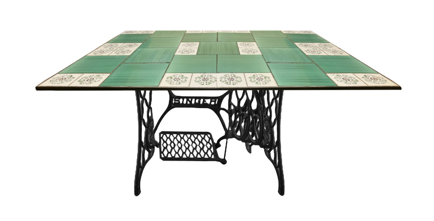 Tavolo rettangolare con piastrelle in maiolica e cantante di base in ferro. H...
