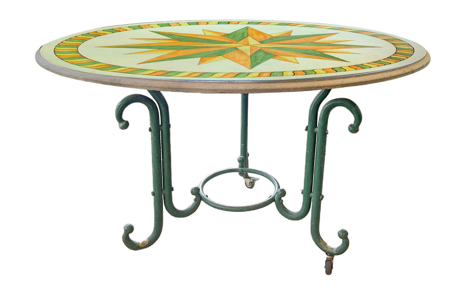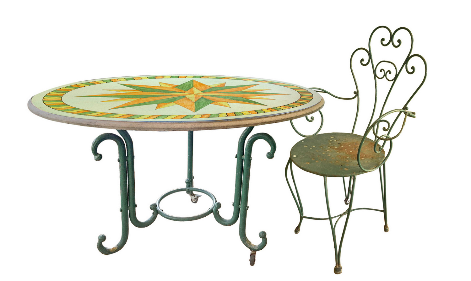 Tavolo rotondo in pietra lavica e 4 sedie. Ceramica policroma decorata con venti rosa. Quattro sedie in ferro battuto. Misure da tavolo da 80 cm, diametro da 120 cm. Manca una ruota