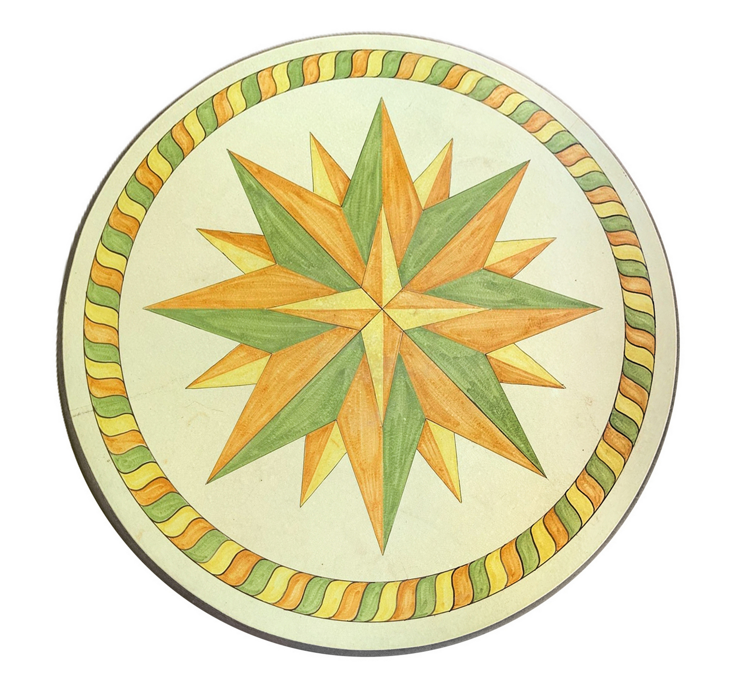 Tavolo rotondo in pietra lavica e 4 sedie. Ceramica policroma decorata con...