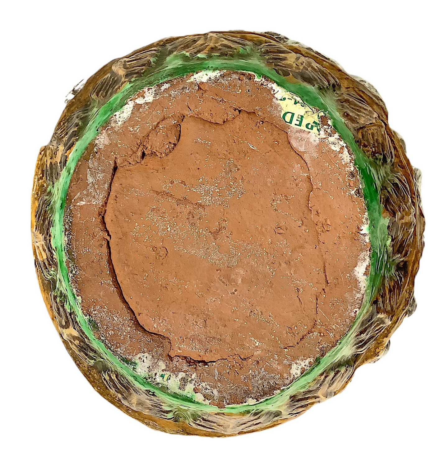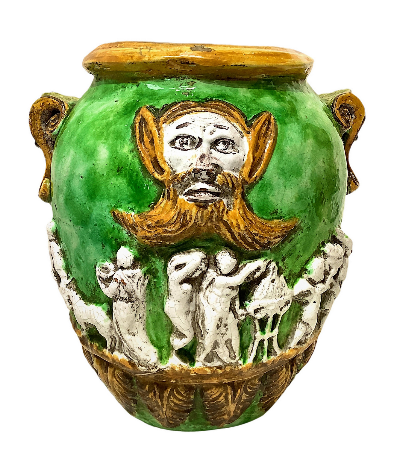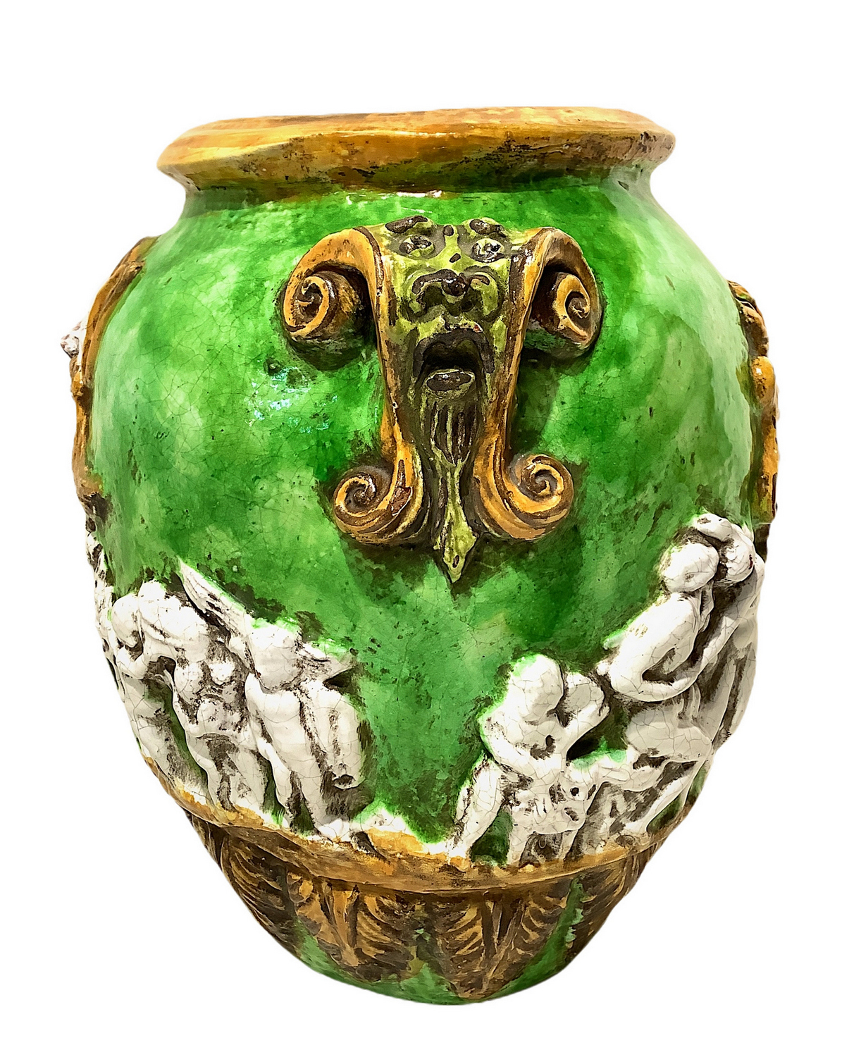 Lot 513 | Cachepot in maiolica verde e gialla con figure bianche di bassorilievo....