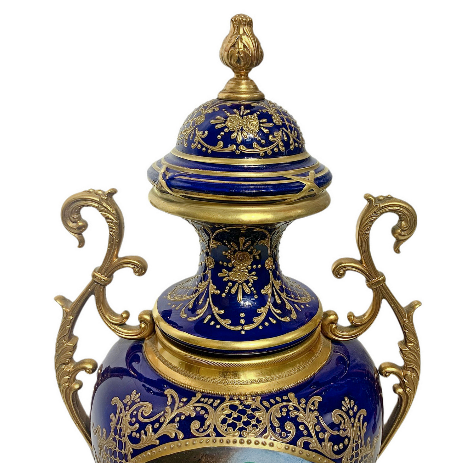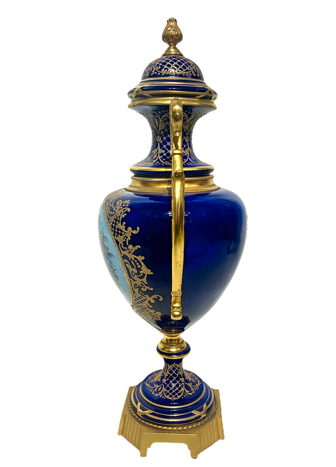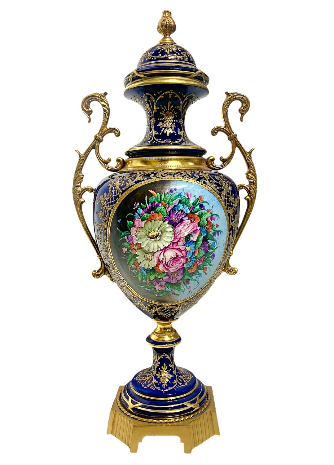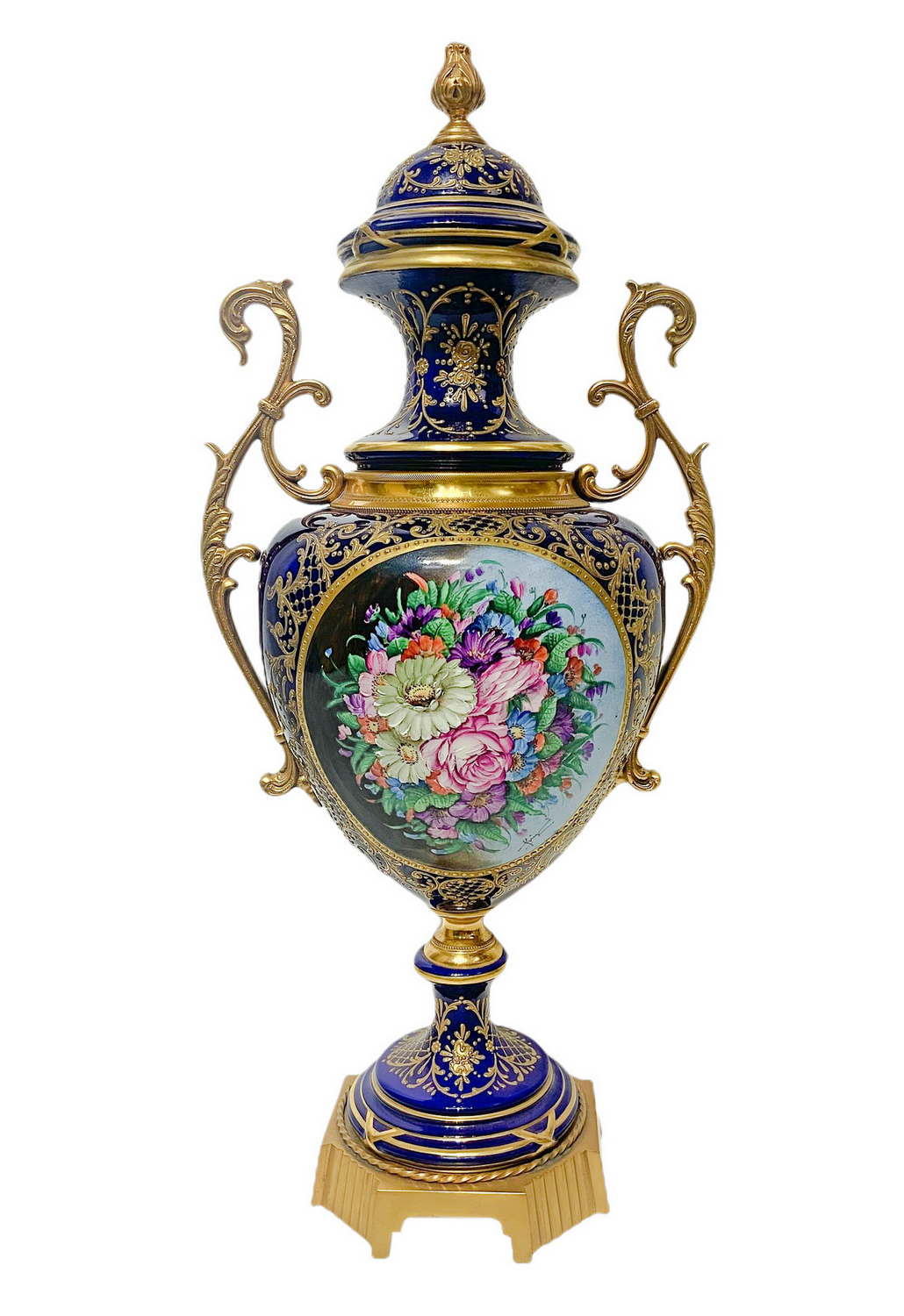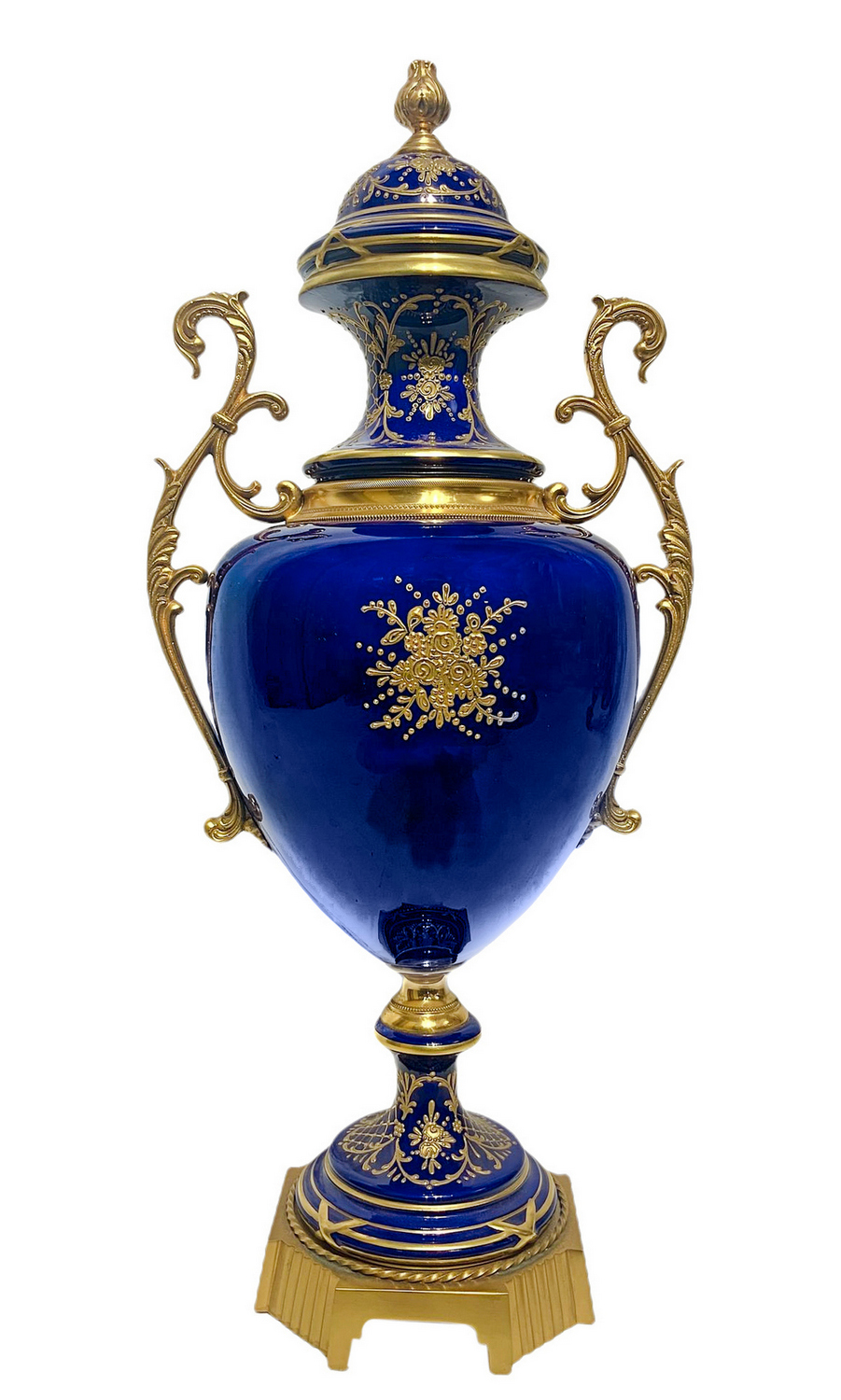 Vaso in porcellana, sevres stile, in colore blu con manici dorati e decorazioni floreali. H cm 61.