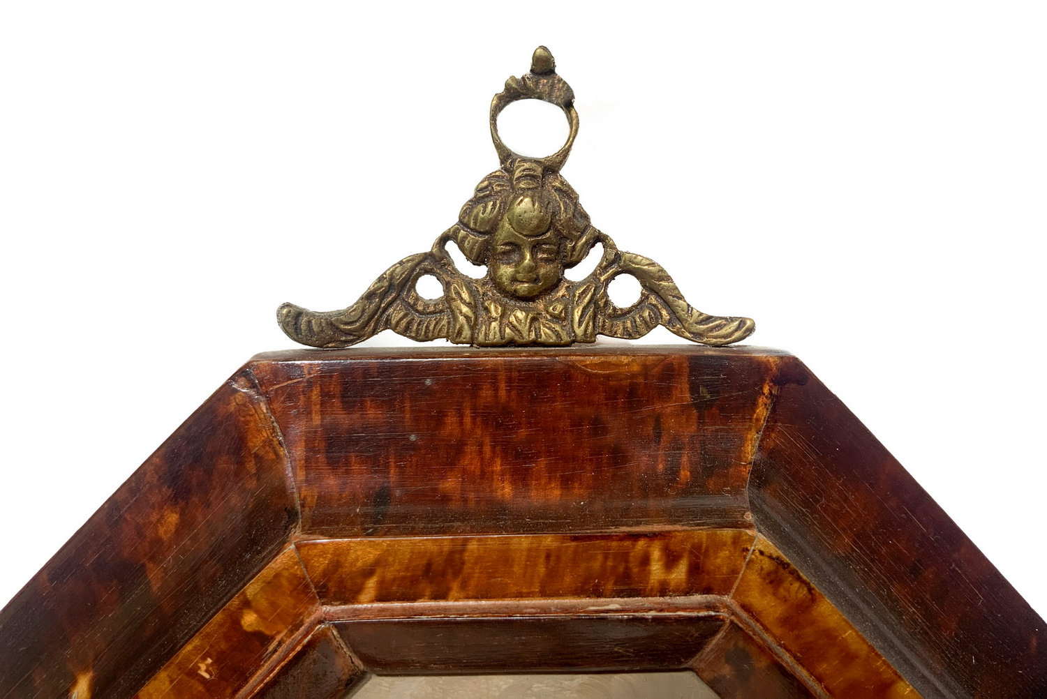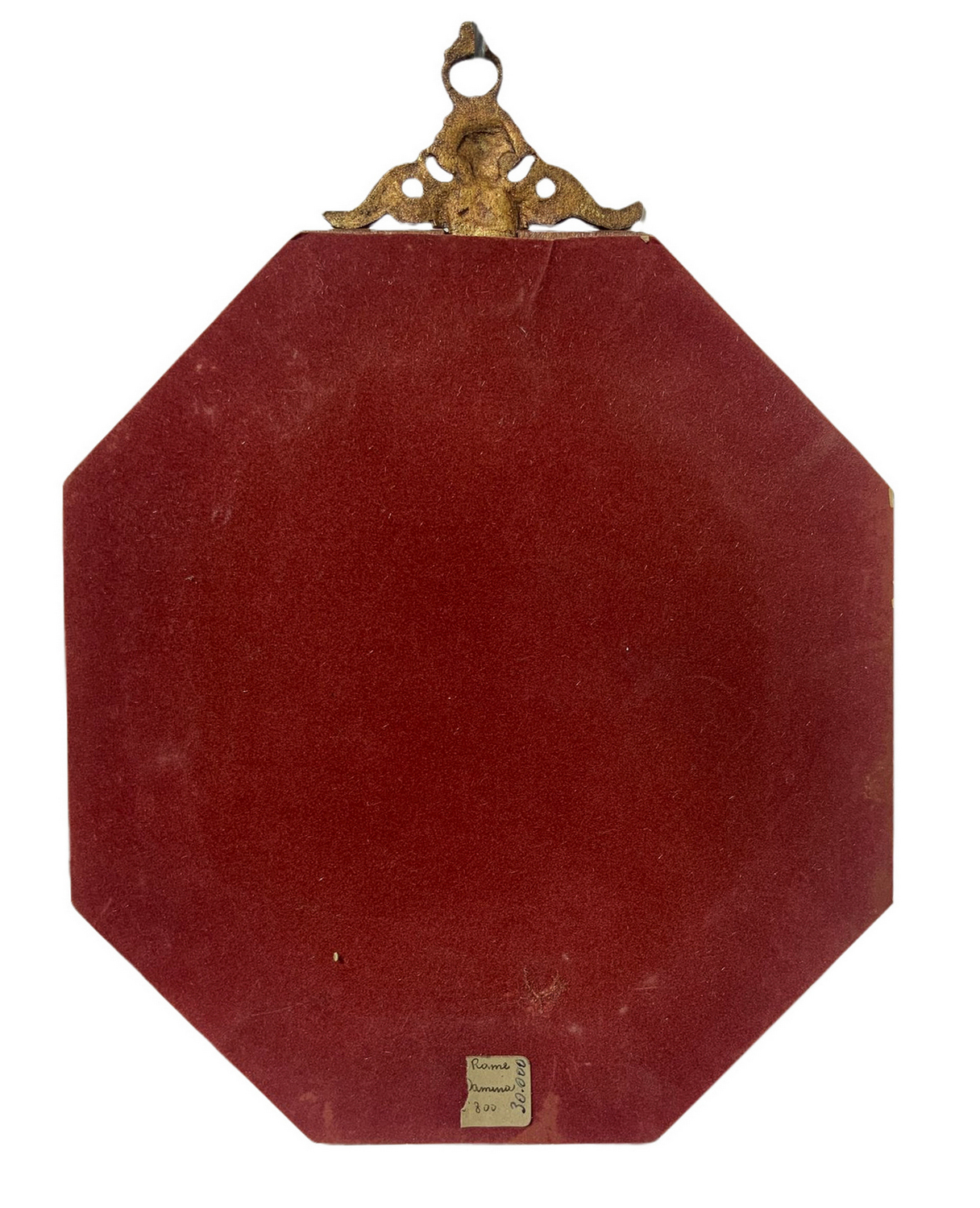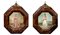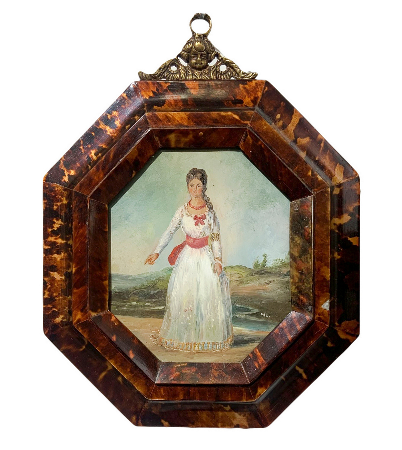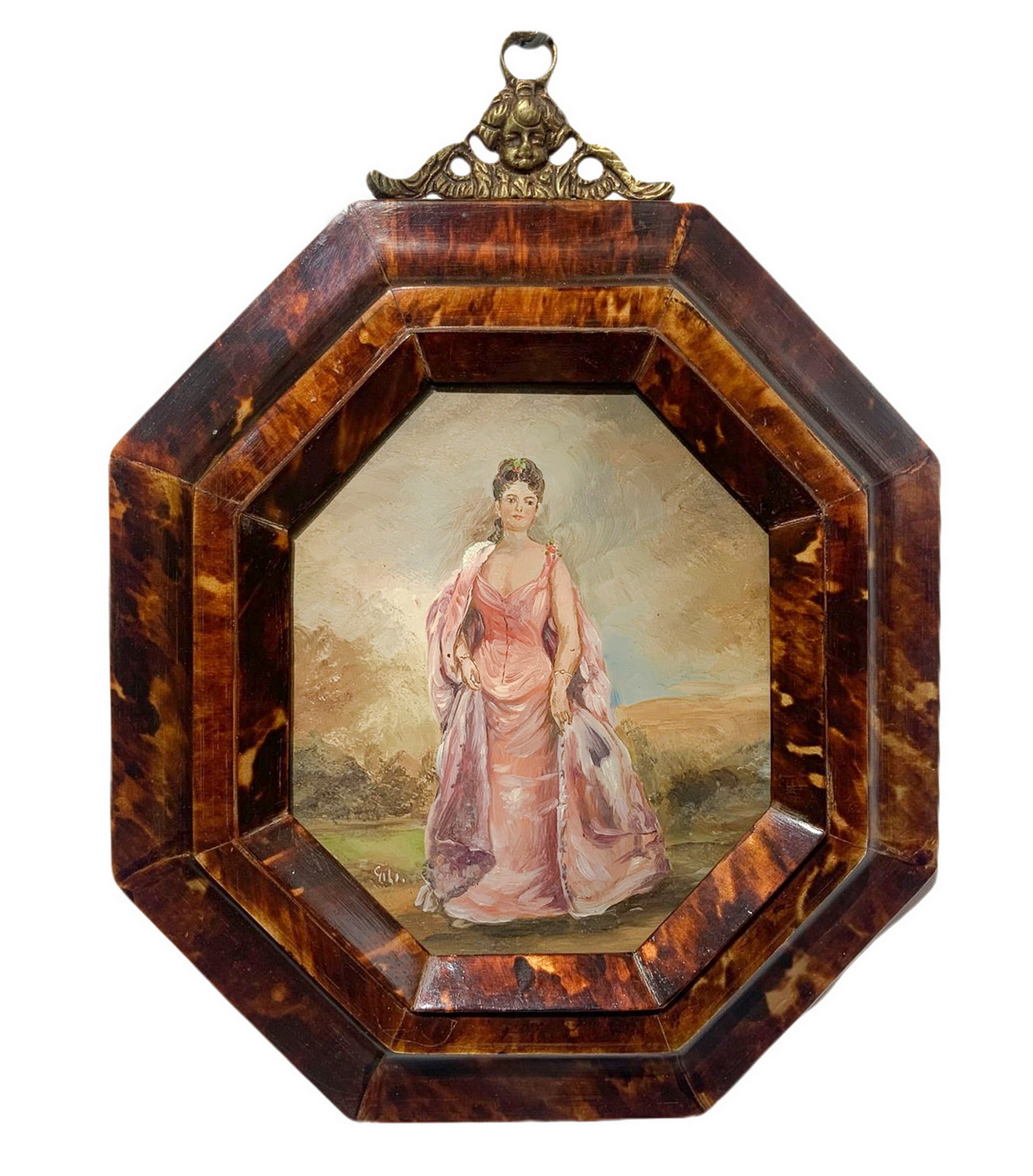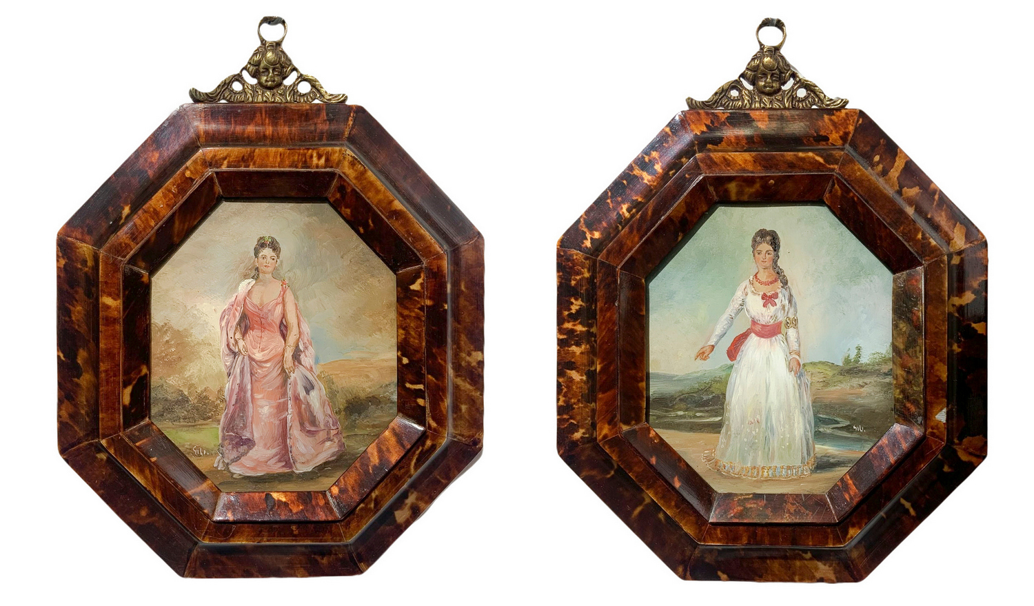 Paio di piccoli dipinti raffiguranti personaggi femminili, in cornici ottagonali in tartaruga. XX secolo, primo 20 ° secolo. H cm 25 x 19