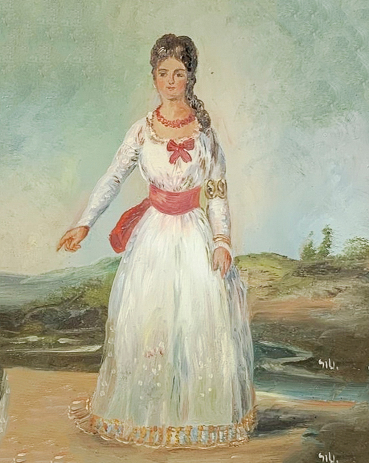 Paio di piccoli dipinti raffiguranti personaggi femminili, in cornici...