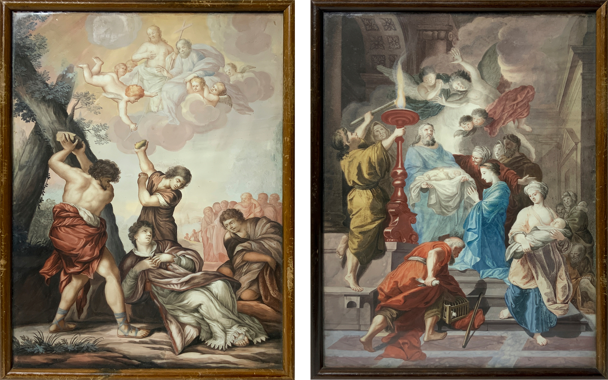 Coppia di dipinti su pergamena raffiguranti " Martirio di Santo Stefano" e "Martirio di Santo Stefano"