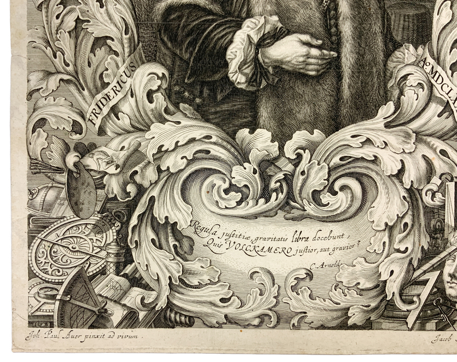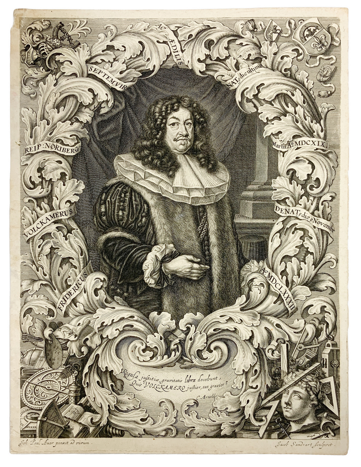Stampa il modulo della prima metà del 1600. Germania, raffigurante "Fridericus Volckamerus, Reip. Norimberg Septemvir Aedilis, NAT. Die last Martii Mdcxix, Denat 9 Die Novembr A. MDClxxii"