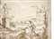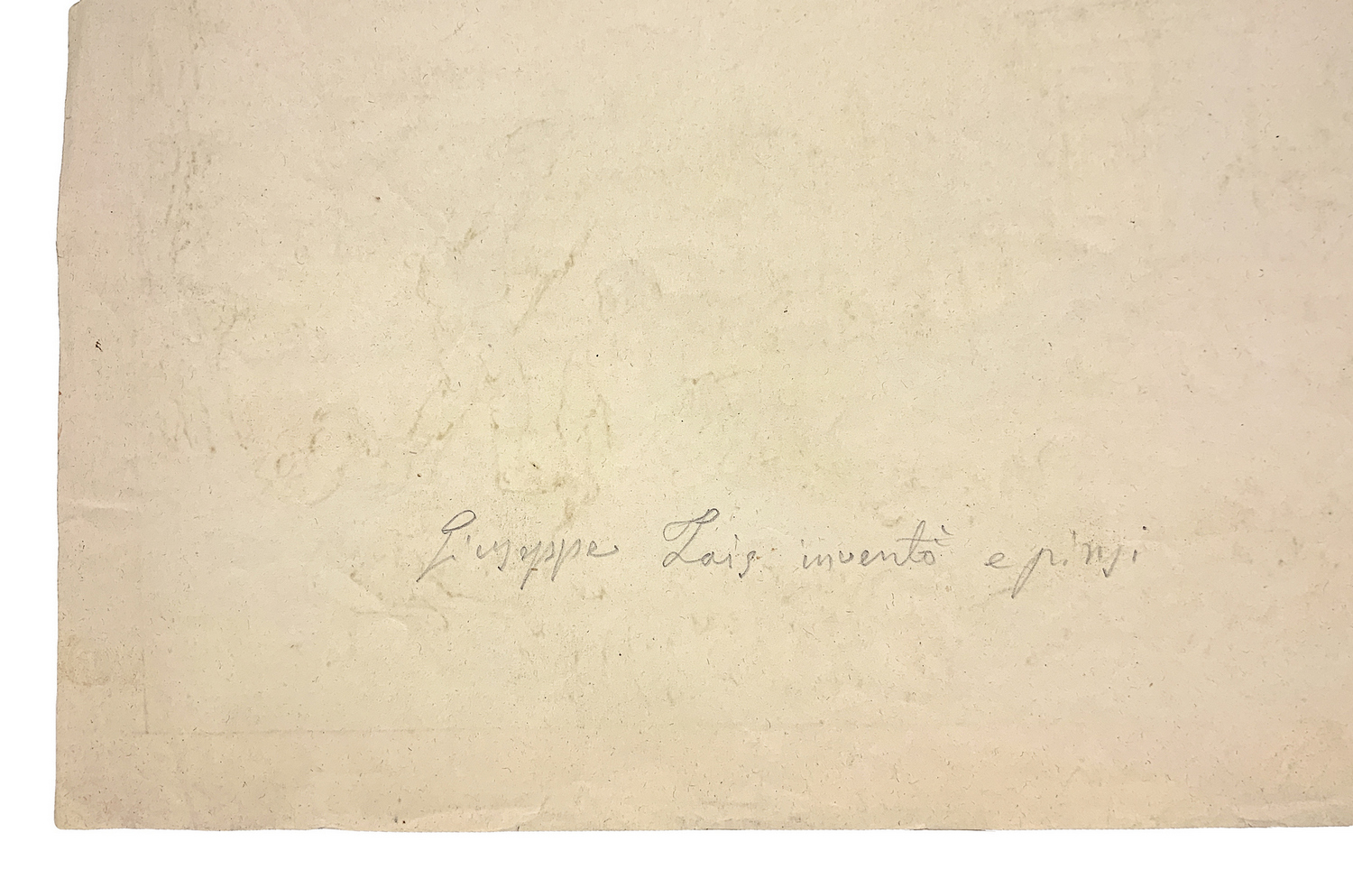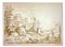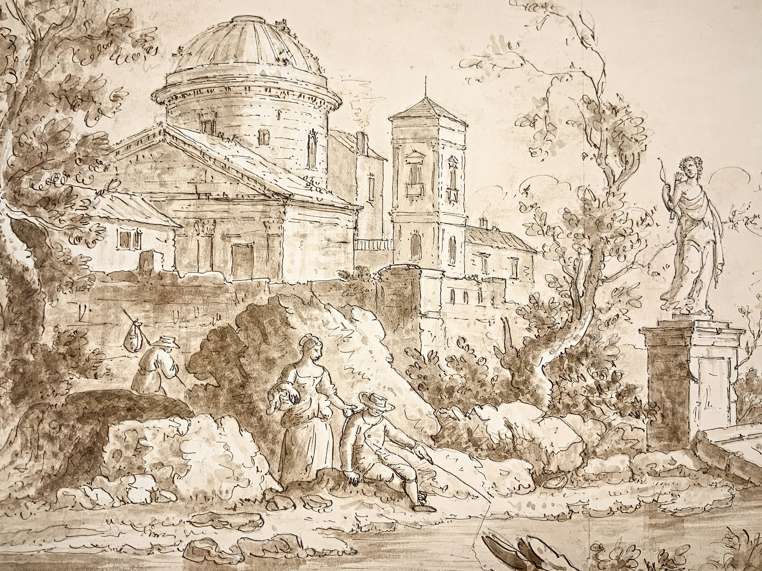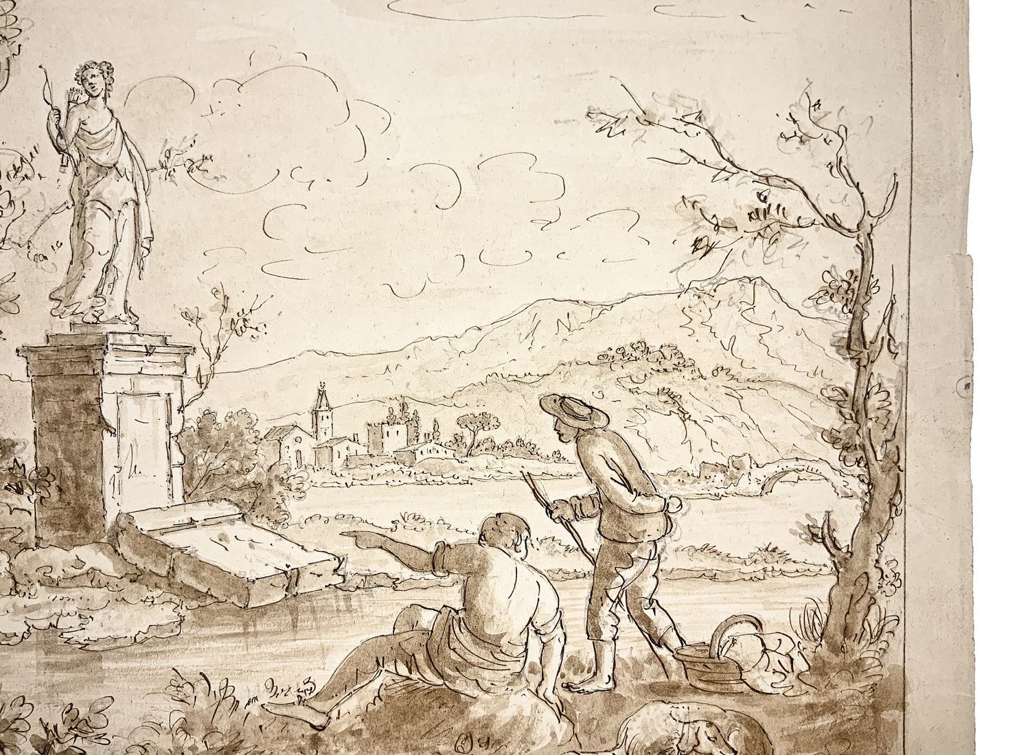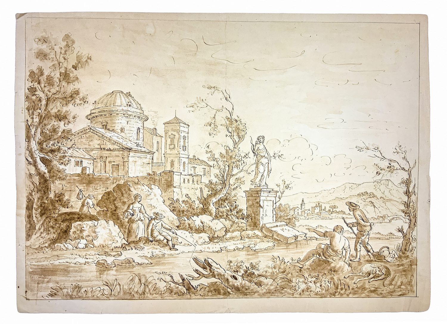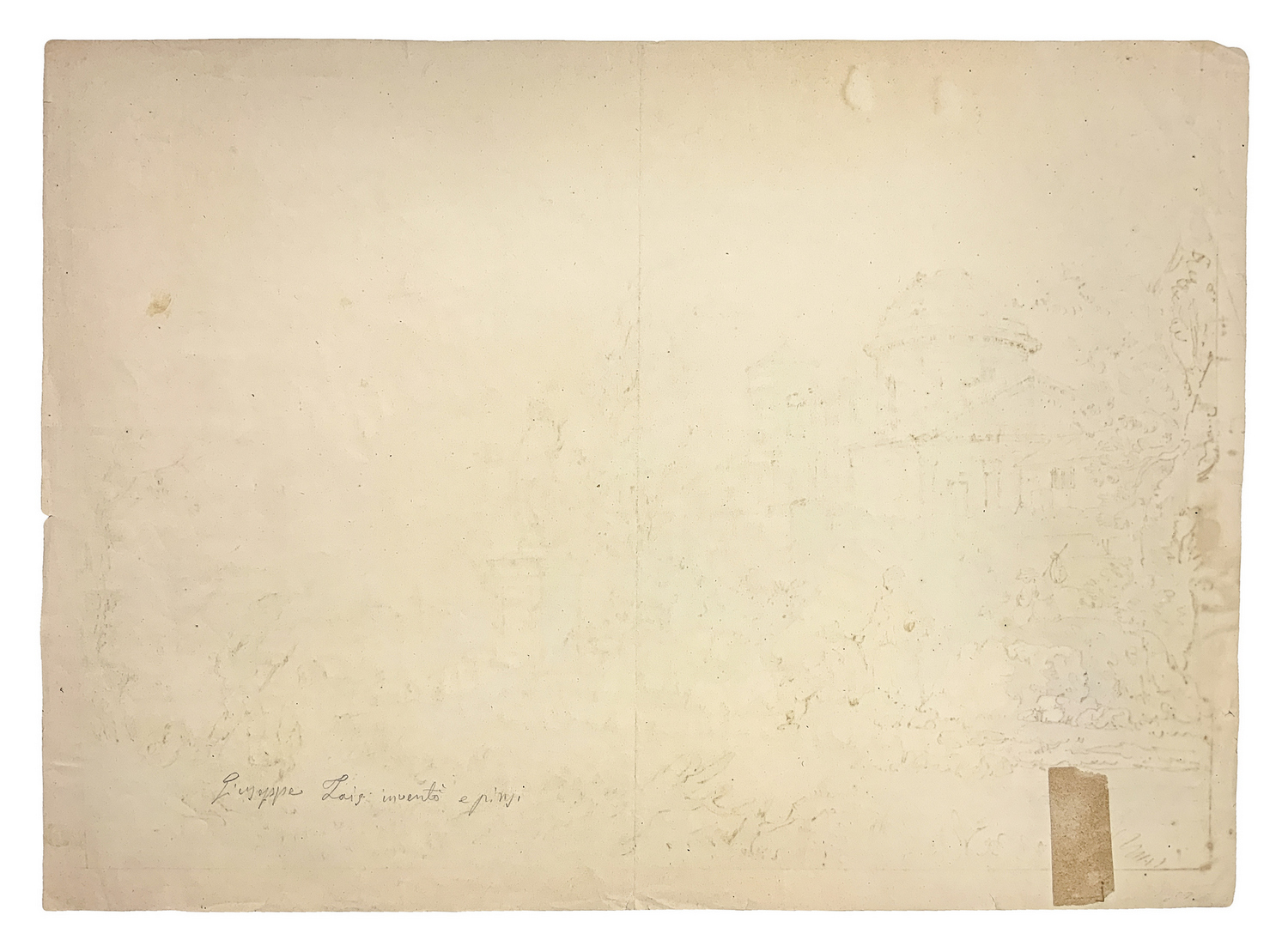 Disegno, acquerello marrone inchiostro sulla carta di Berred raffigurante il paesaggio del fiume sui fori romani. XIX secolo, con architettura antica. Sul retro scritto a matita "Giuseppe Zais Inventò e Pins"