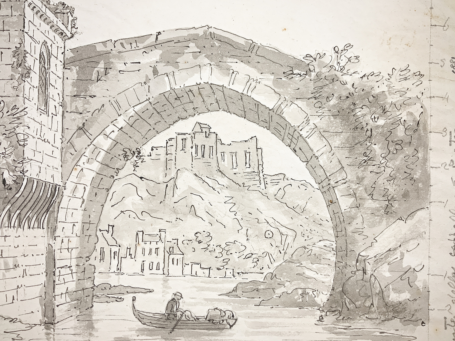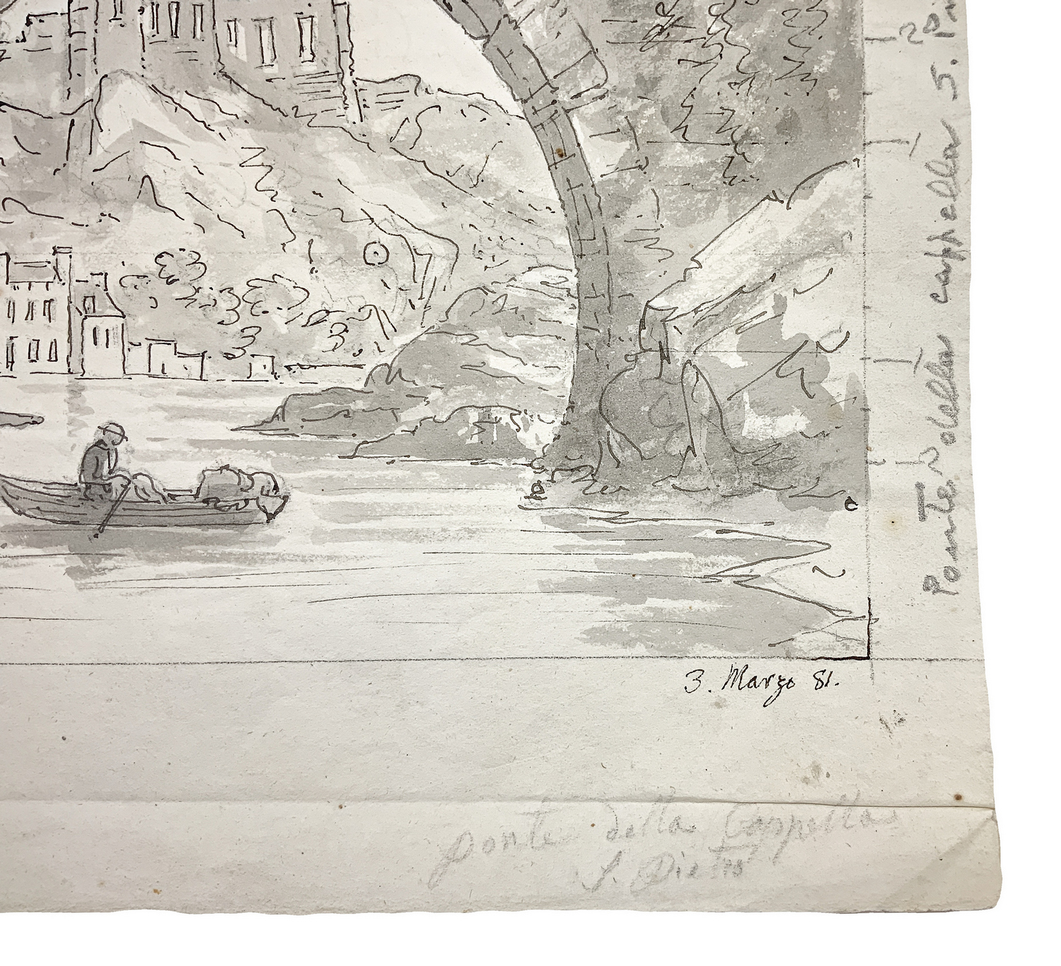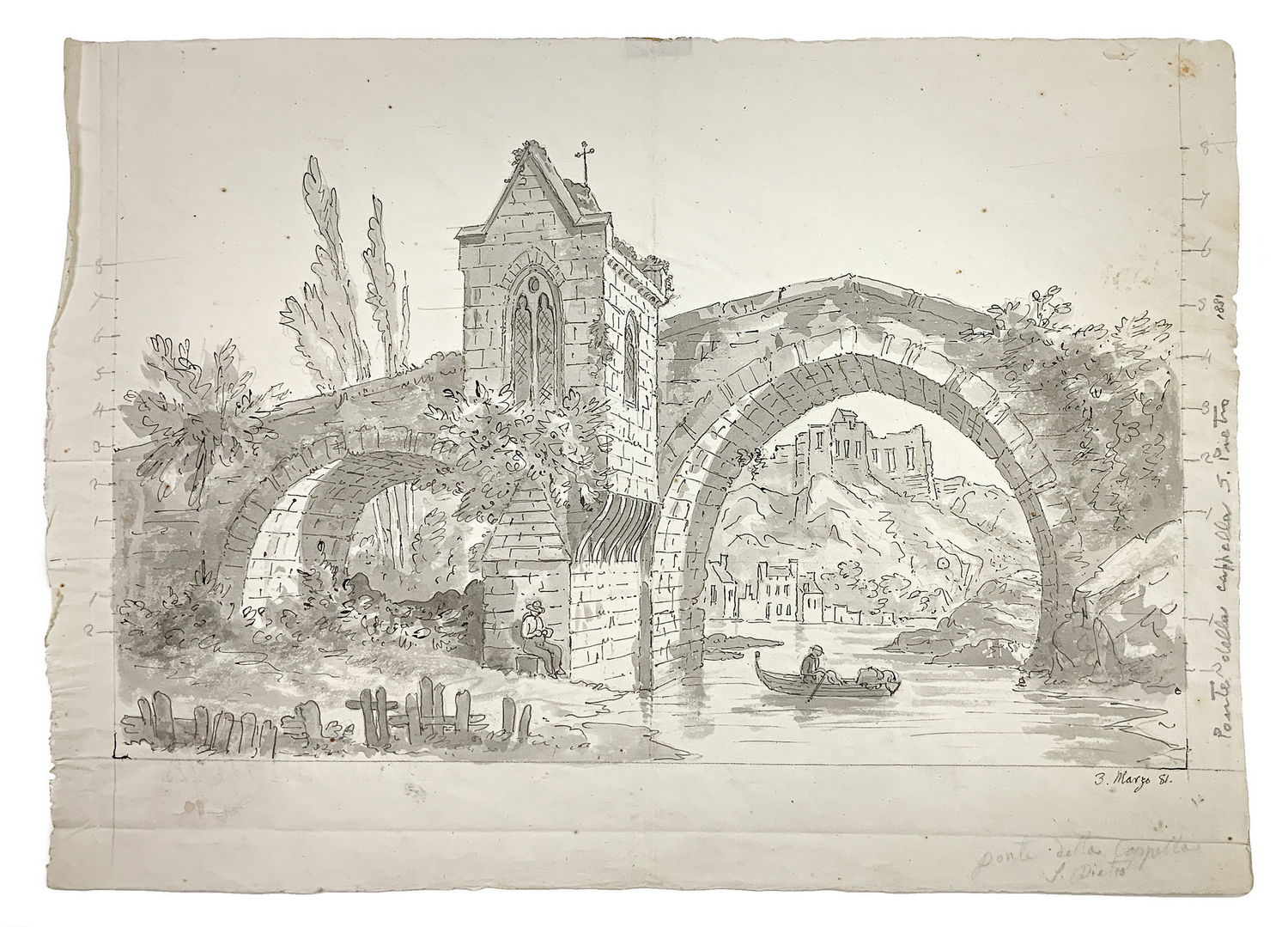 Disegno, acquerello grigio inchiostro raffigurante il ponte della cappella, St. Pietro. Datato in basso a destra 3 marzo '81