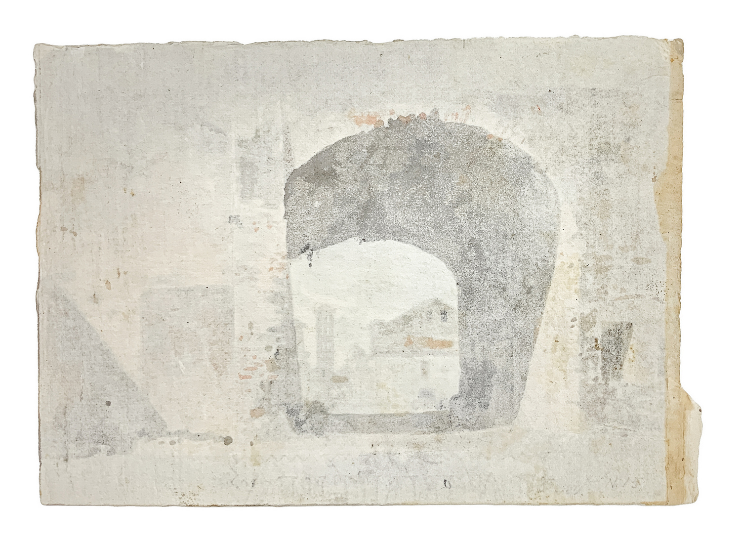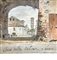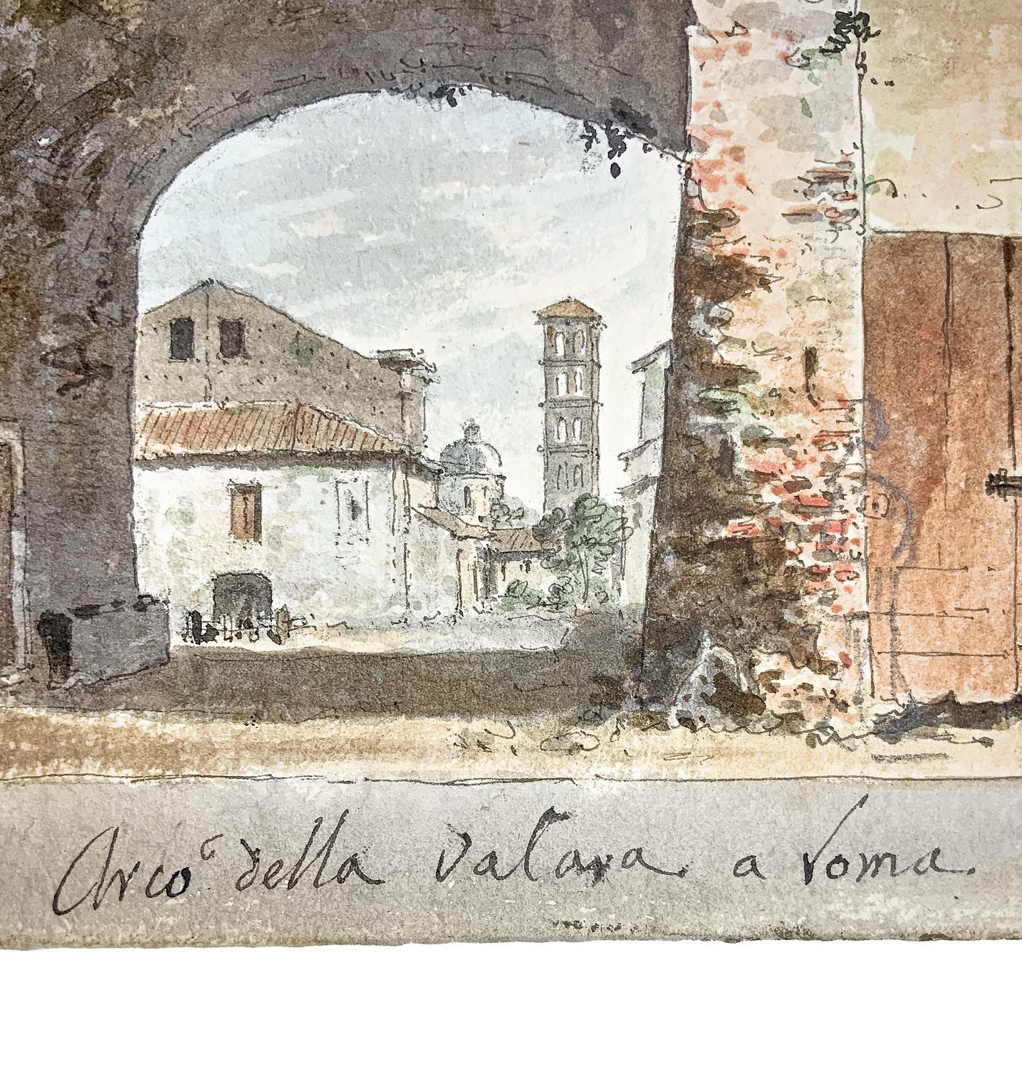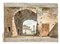 Disegno ad acquerello in porcellana e matita policroma raffigurante Arco della Valona a Roma. Scritto in basso a destra Arco della Valona a Roma.