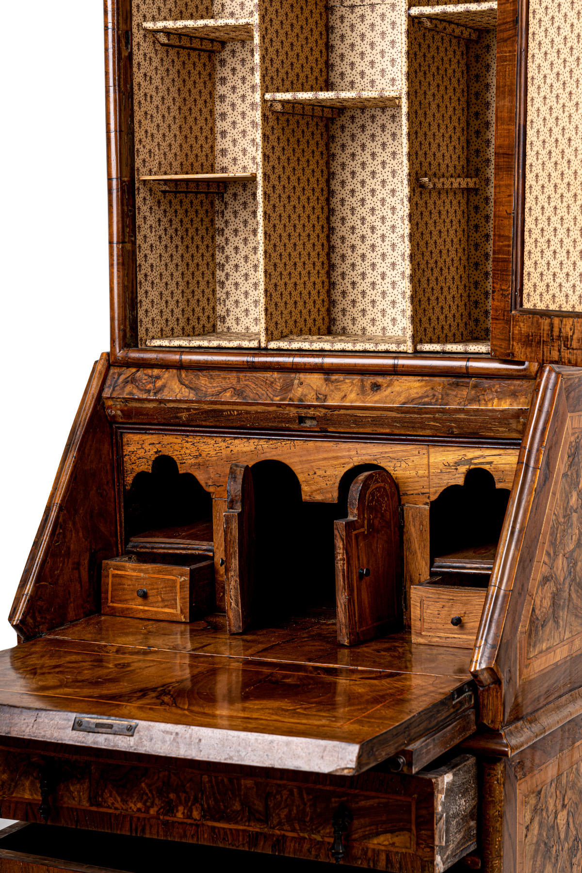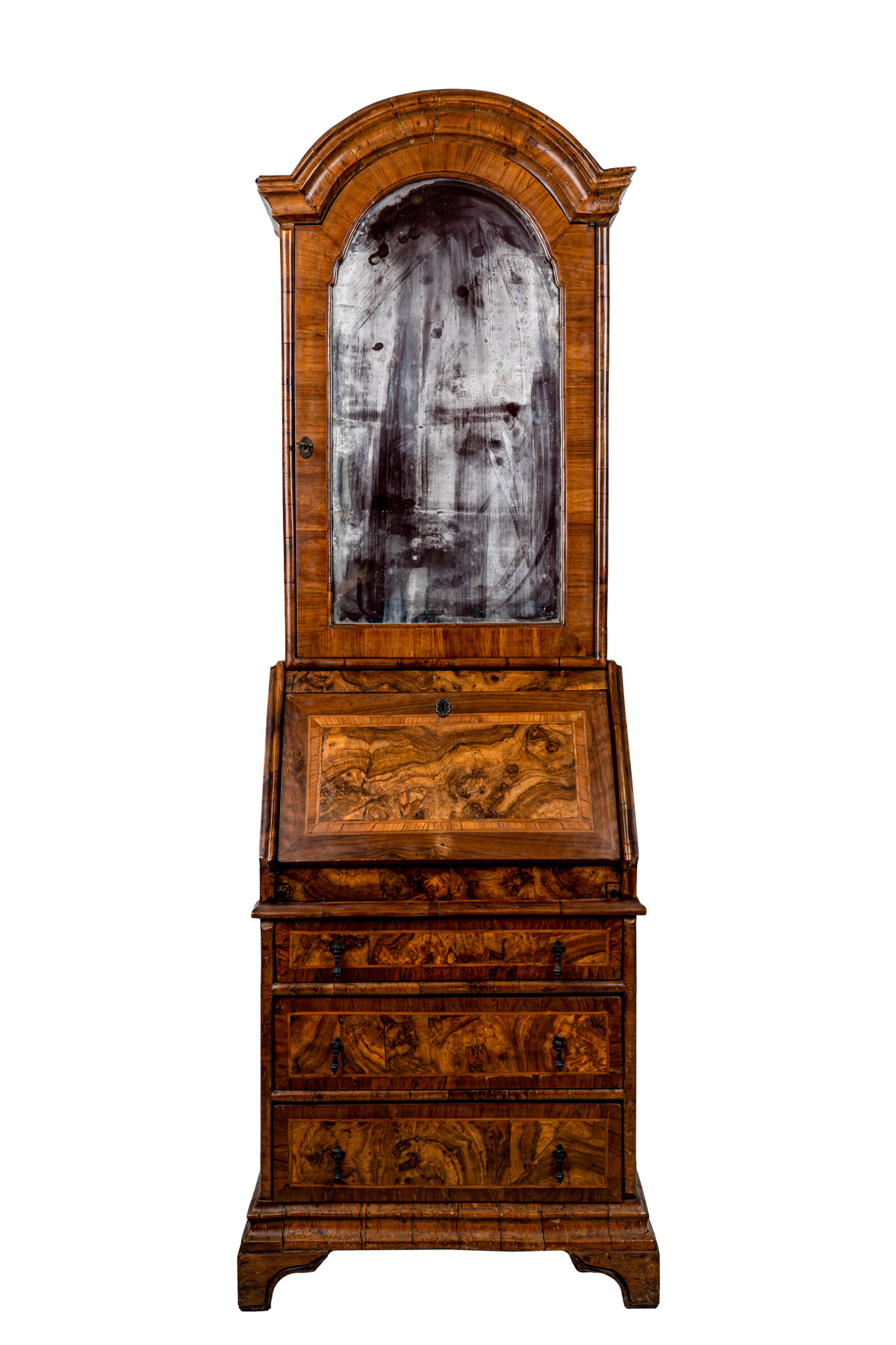 corpo superiore centinato con uno sportello a specchio, corpo inferiore con sportello a ribalta e scarabattolo interno con cassettini, vani a giorno e due sportelli, tre cassetti sottostanti, base modanata, piedi a mensola