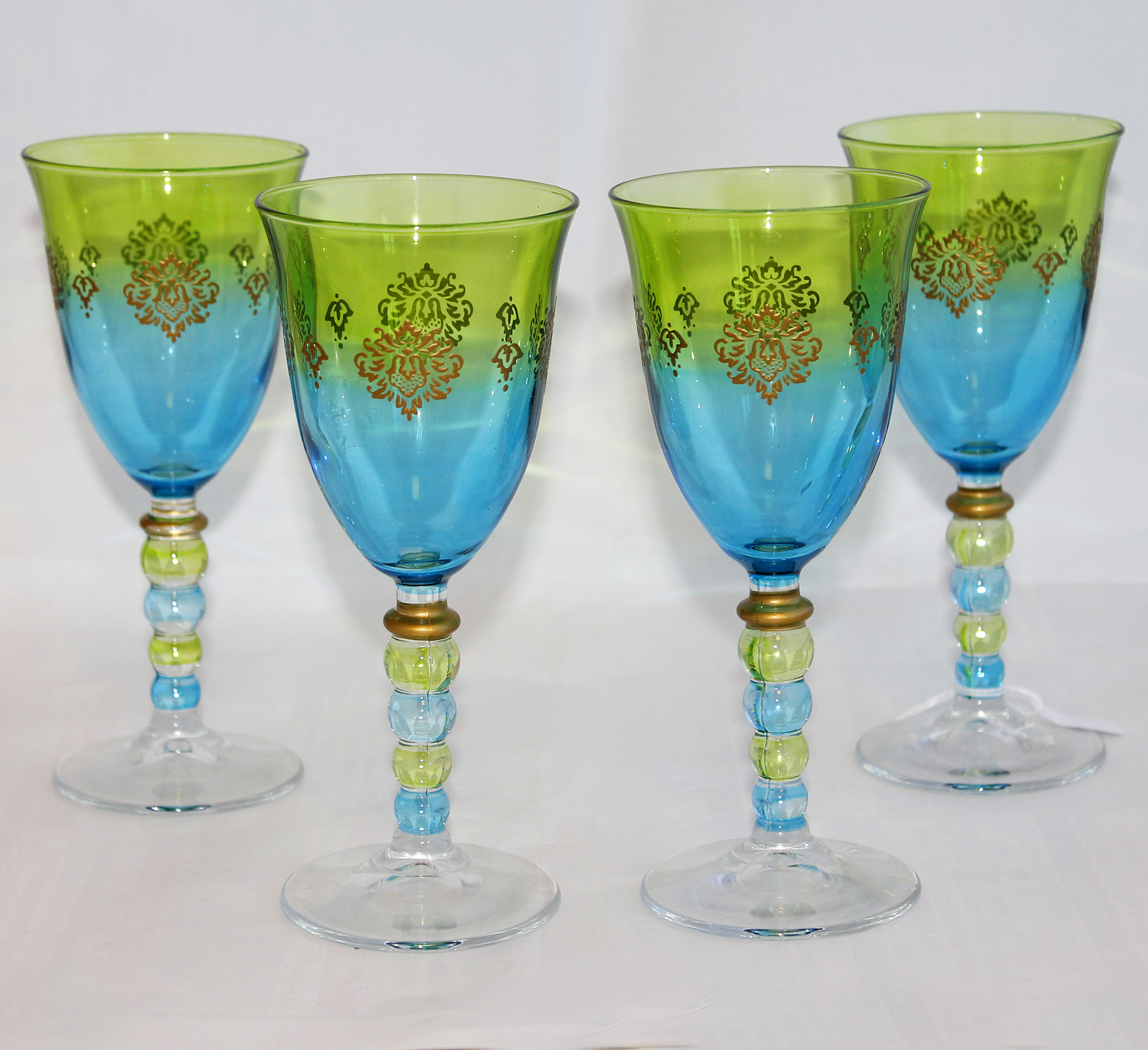 in vetro colorato nei toni del blu e del verde, decori dorati