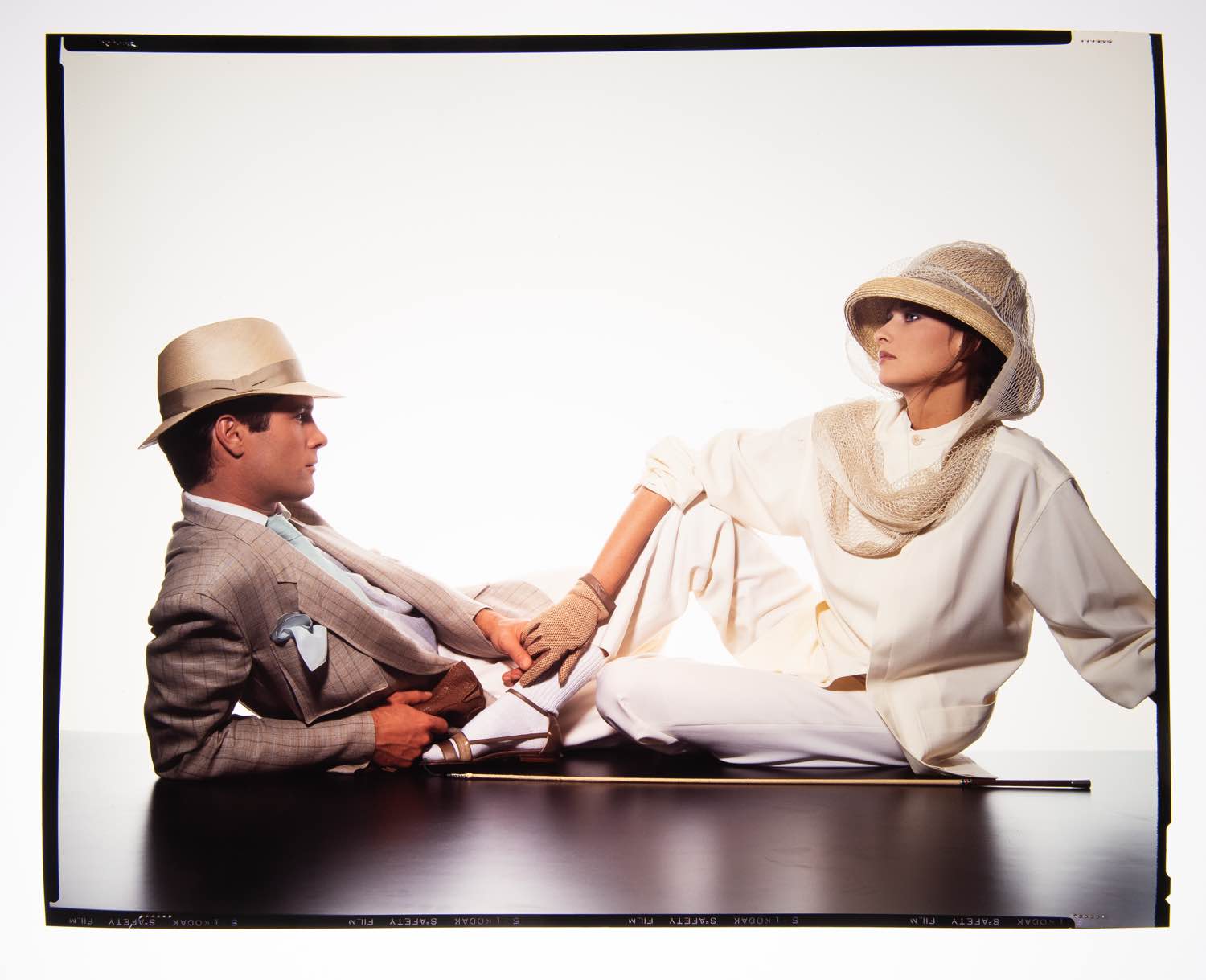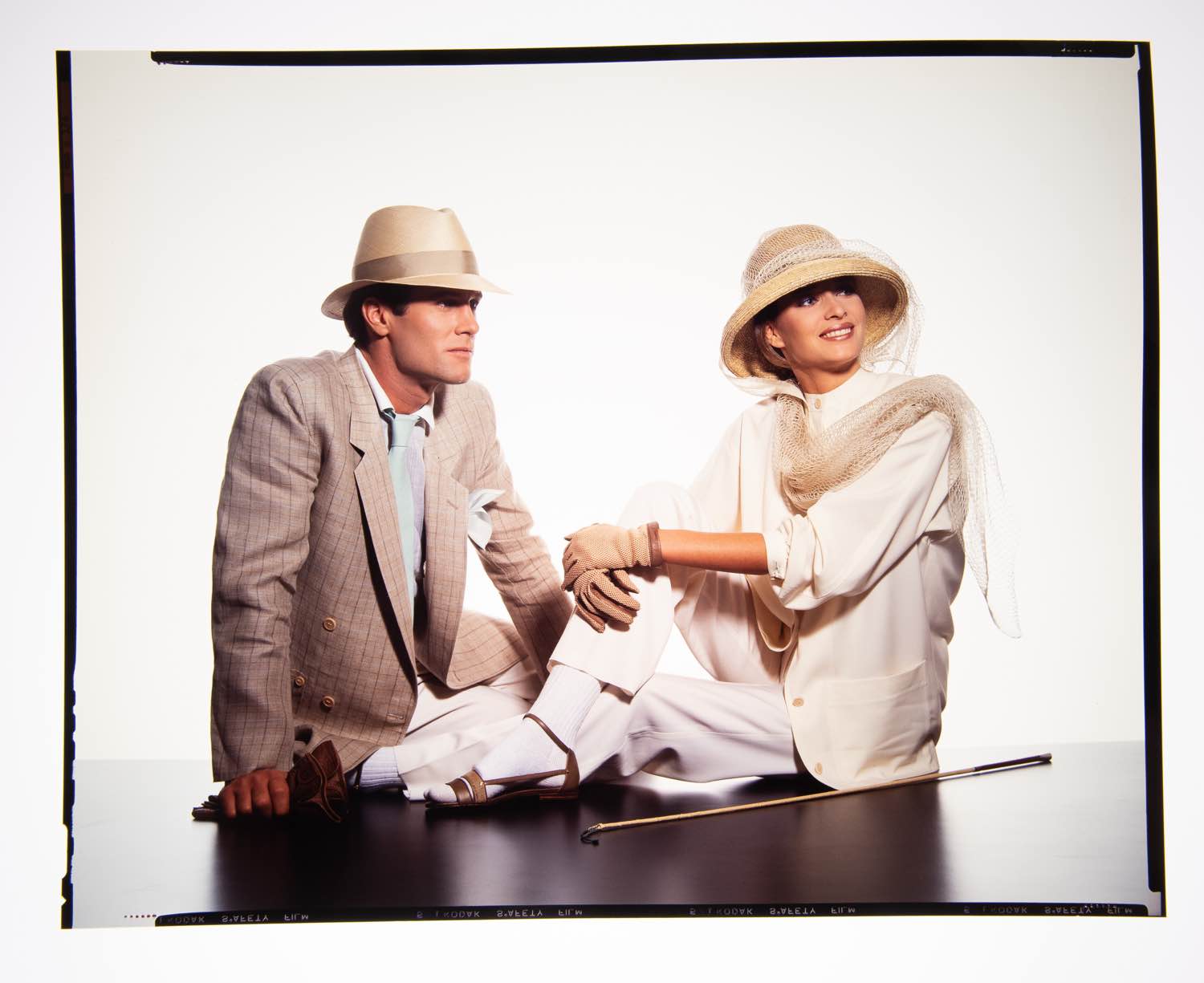 Irving Penn (Plainfield, 1917 - New York, 2009) per catalogo Gucci P/E 1983, foto lei e lui safari - 2 lastre fotografiche - set n.1, cm 25x20 Usure e segni del tempo. Provenienza: Collezione Nando Miglio.