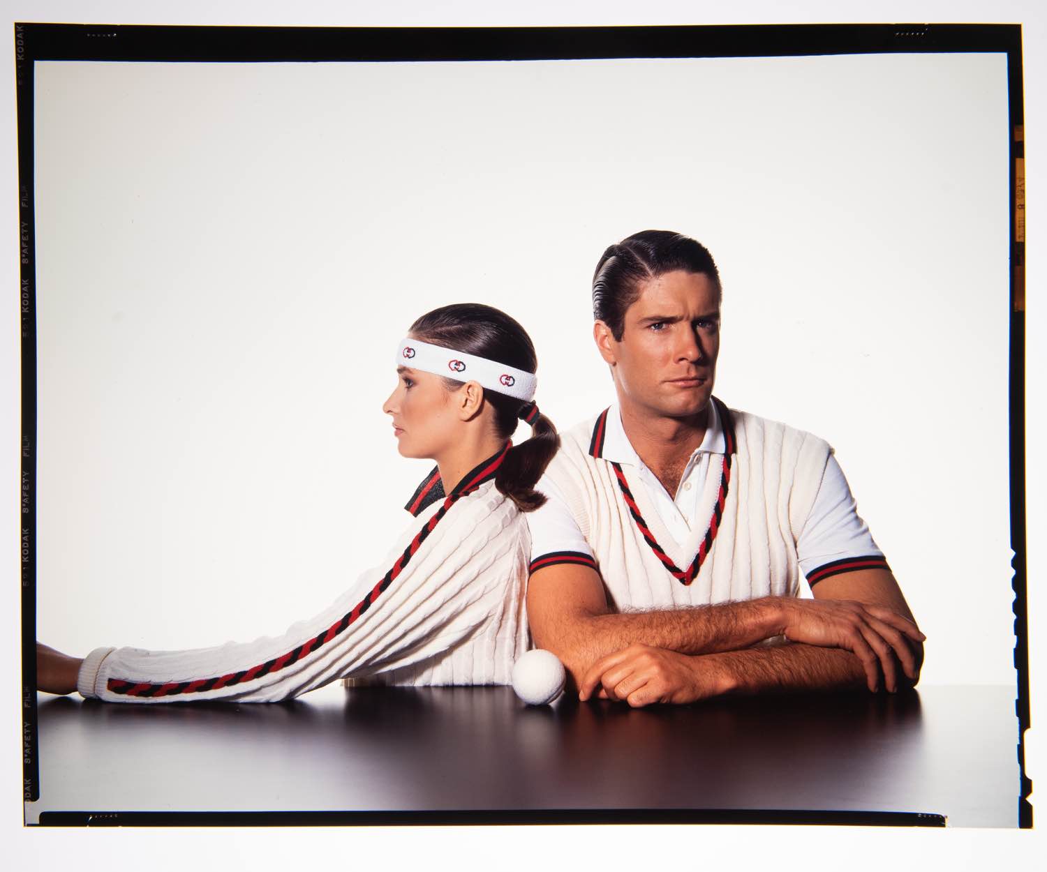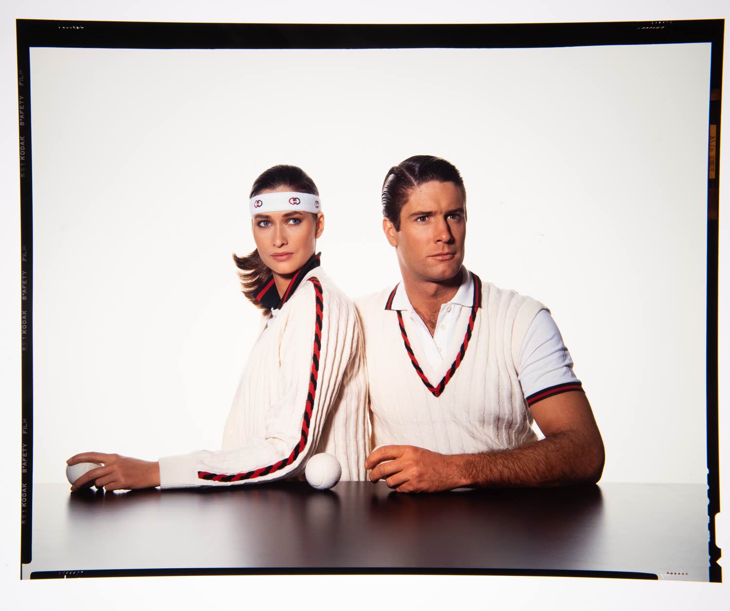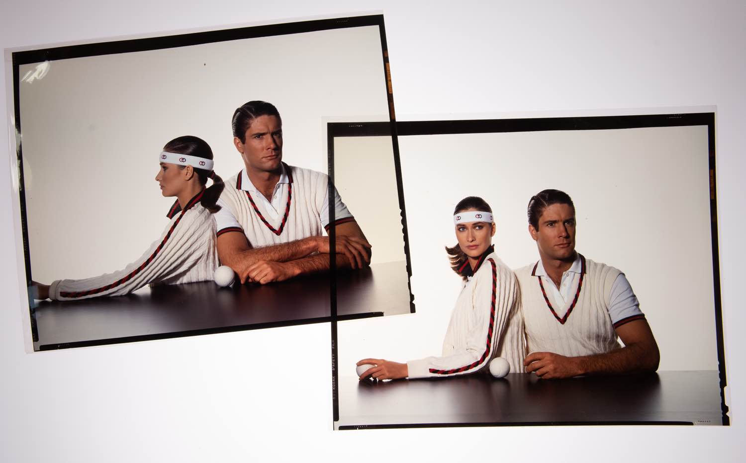 Irving Penn (Plainfield, 1917 - New York, 2009) per catalogo Gucci P/E 1983, foto due modelli in abiti da tennis - 2 lastre fotografiche - set n.12, cm 25x20 Usure e segni del tempo. Provenienza: Collezione Nando Miglio.