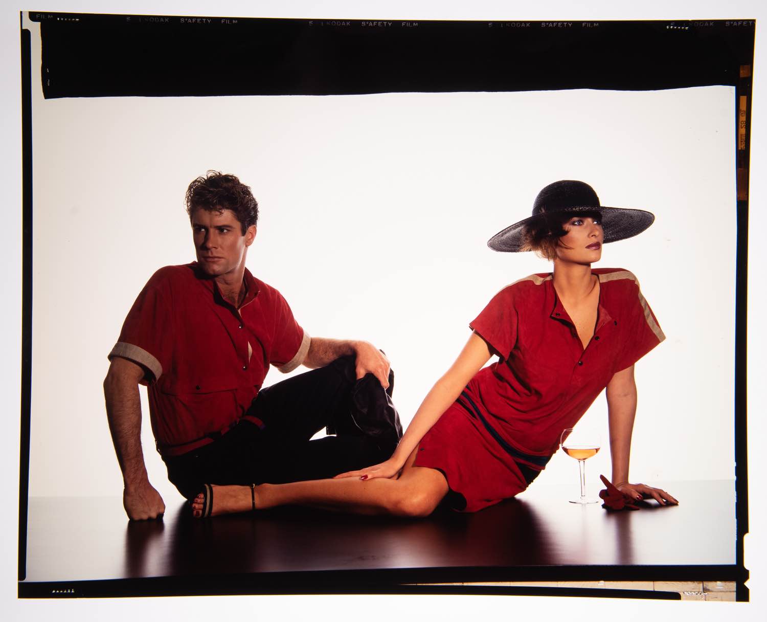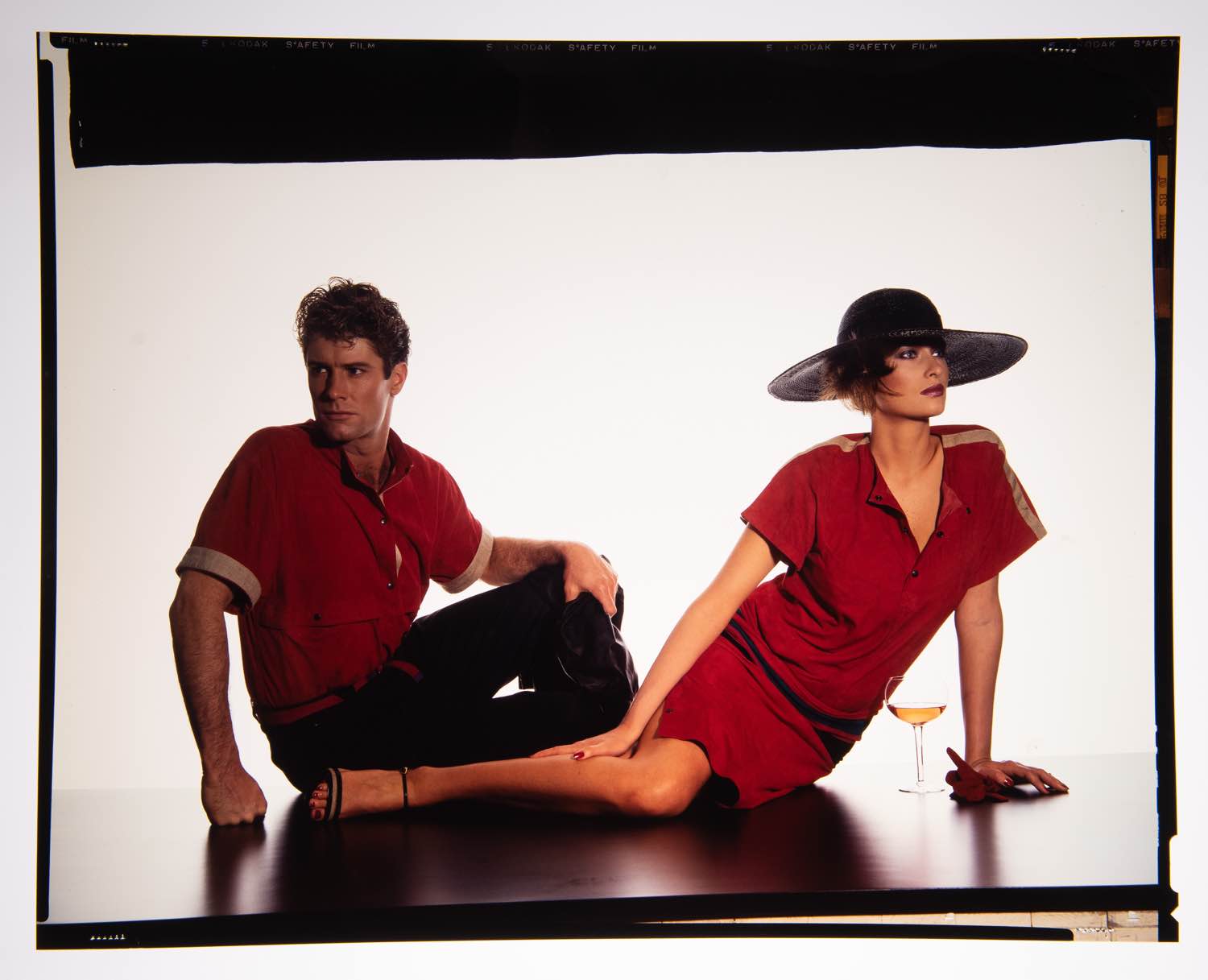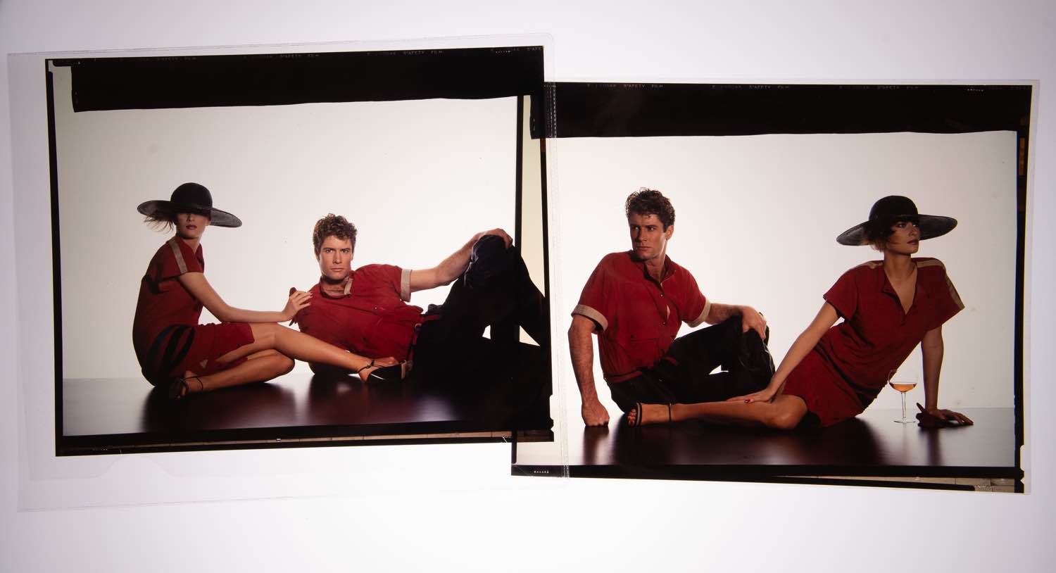 Irving Penn (Plainfield, 1917 - New York, 2009) per catalogo Gucci P/E 1983, foto lei con cappello nero e lui con camicia rossa - 2 lastre fotografiche - set n.15, cm 25x20 Usure e segni del tempo. Provenienza: Collezione Nando Miglio.