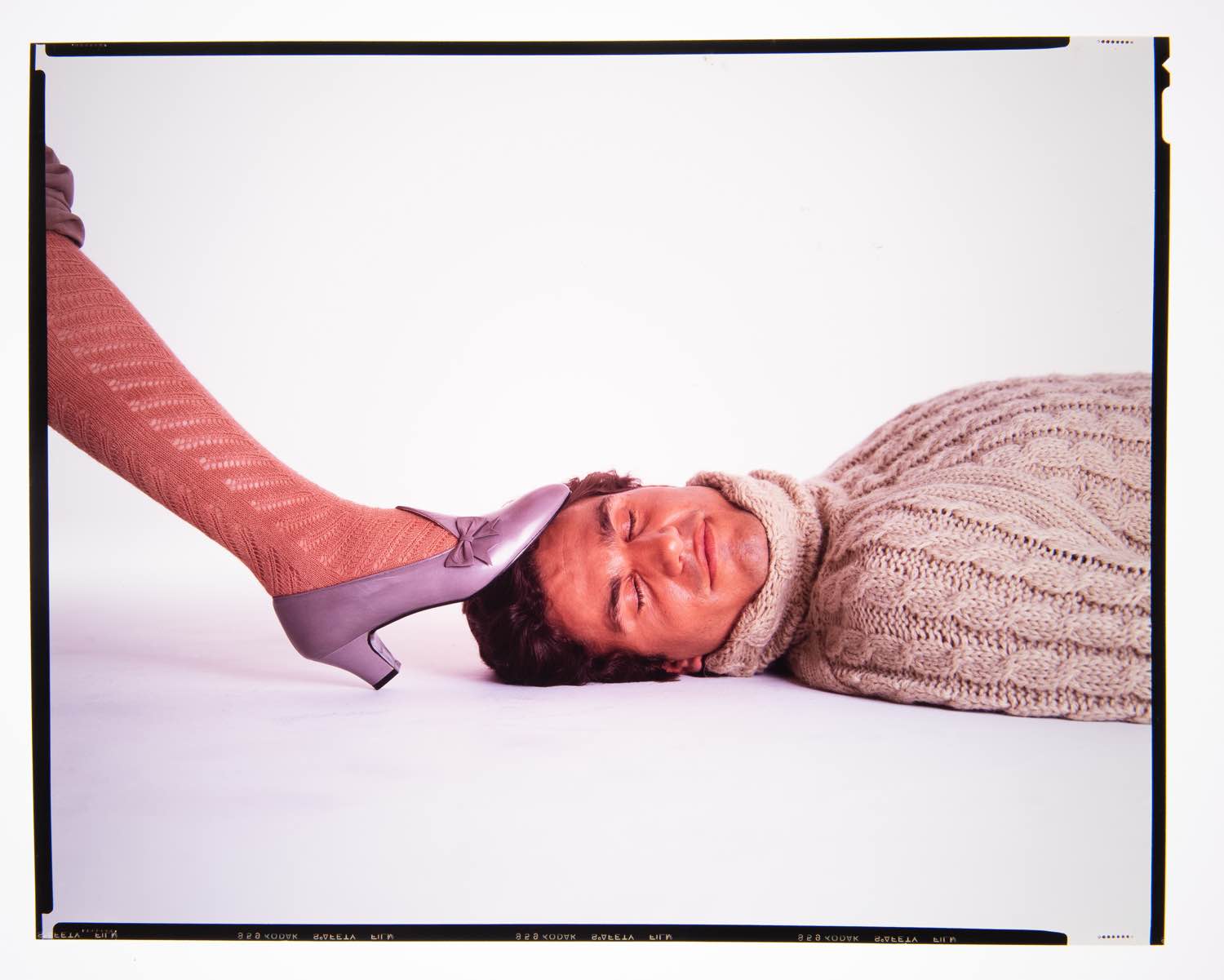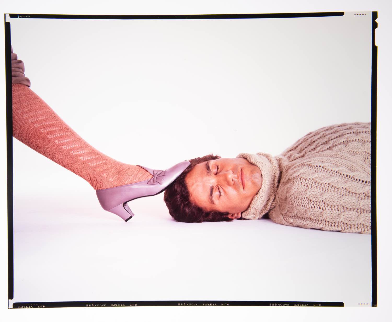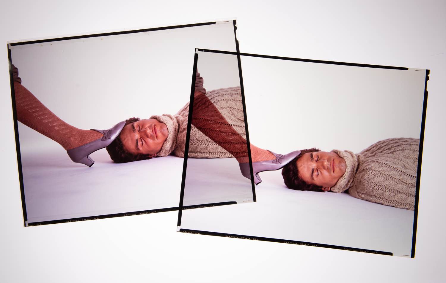 Richard Avedon (New York, 1923 - San Antonio, 2004) per Mario Valentino A/I 1980/81, foto uomo (Tony Spinelli) con scarpa in testa - 2 lastre fotografiche, cm 25x20 Usure e segni del tempo. Provenienza: Collezione Nando Miglio.