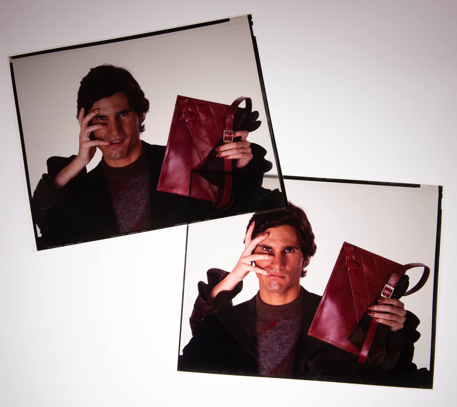 Richard Avedon (New York, 1923 - San Antonio, 2004) per Mario Valentino A/I 1980/81, foto lui (Tony Spinelli) con borsa rossa e mani di lei - 2 lastre fotografiche, cm 25x20 Usure e segni del tempo. Provenienza: Collezione Nando Miglio.