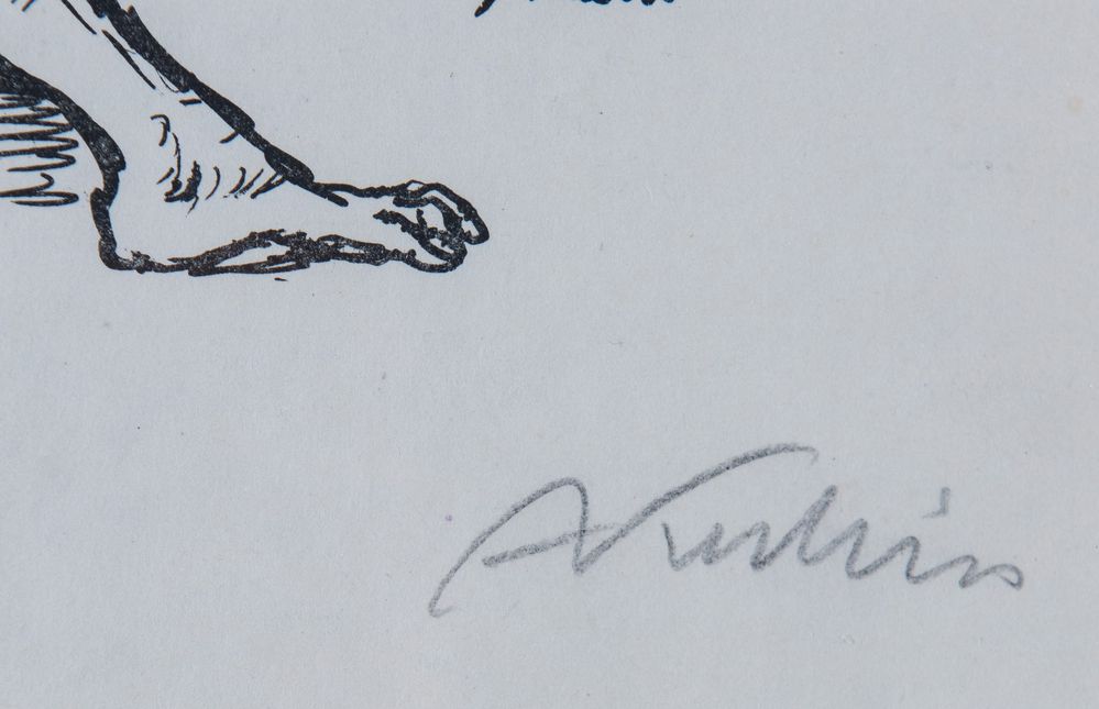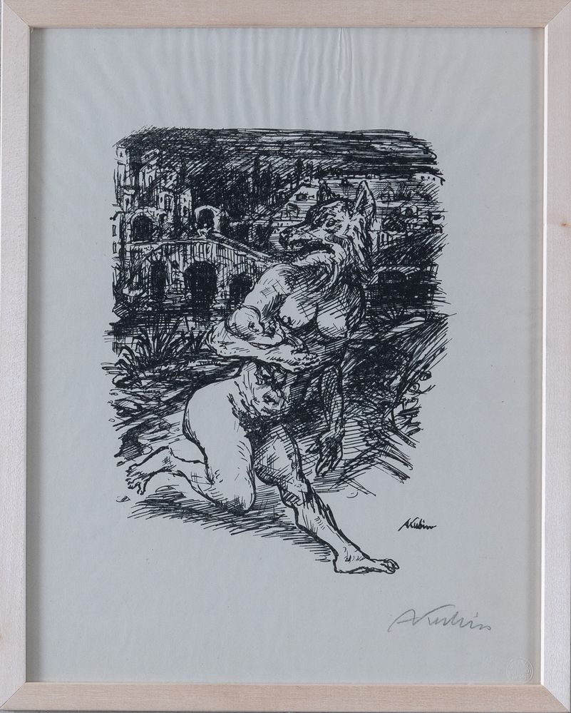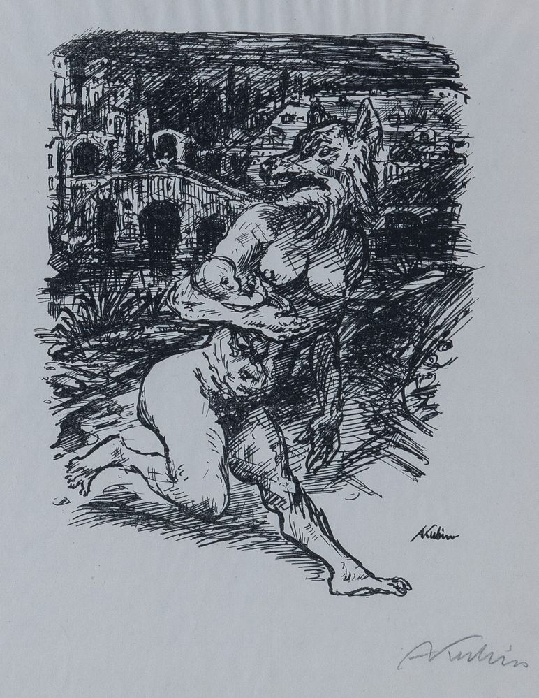ALFRED KUBIN (Cechia 1877 - Wernstein am Inn 1959) "Nudo con testa di lupa", 1923 ca. Litografia a colori su carta Giappone. Lastra: cm 24,5x19. Opera firmata in basso a destra A Kubin e timbro Libreria Prandi Reggio. Reca firma su lastra A Kubin.