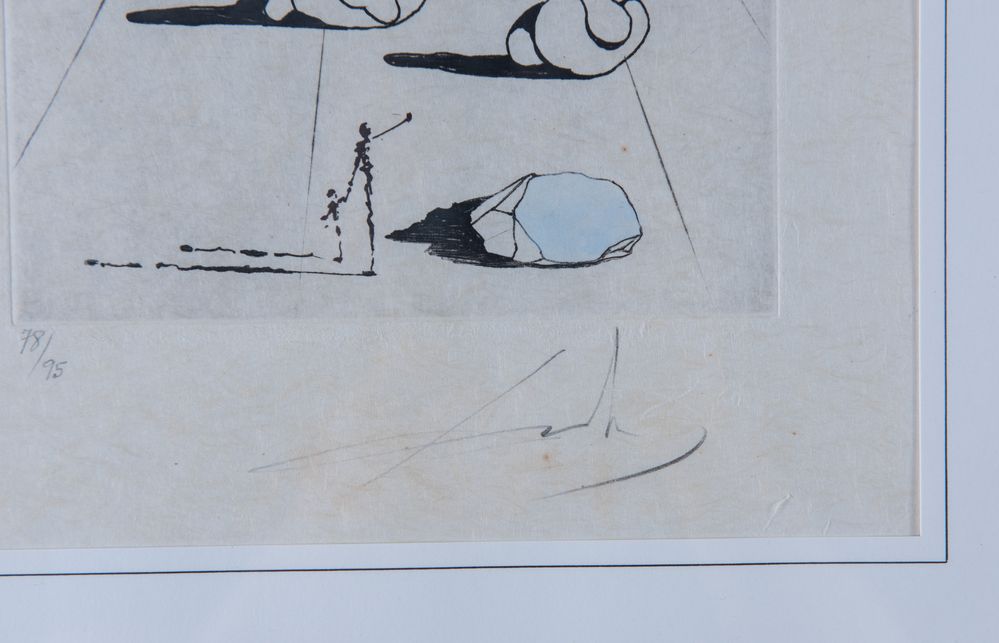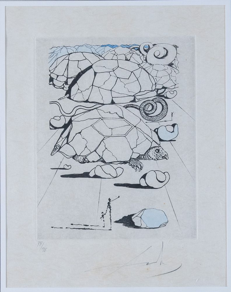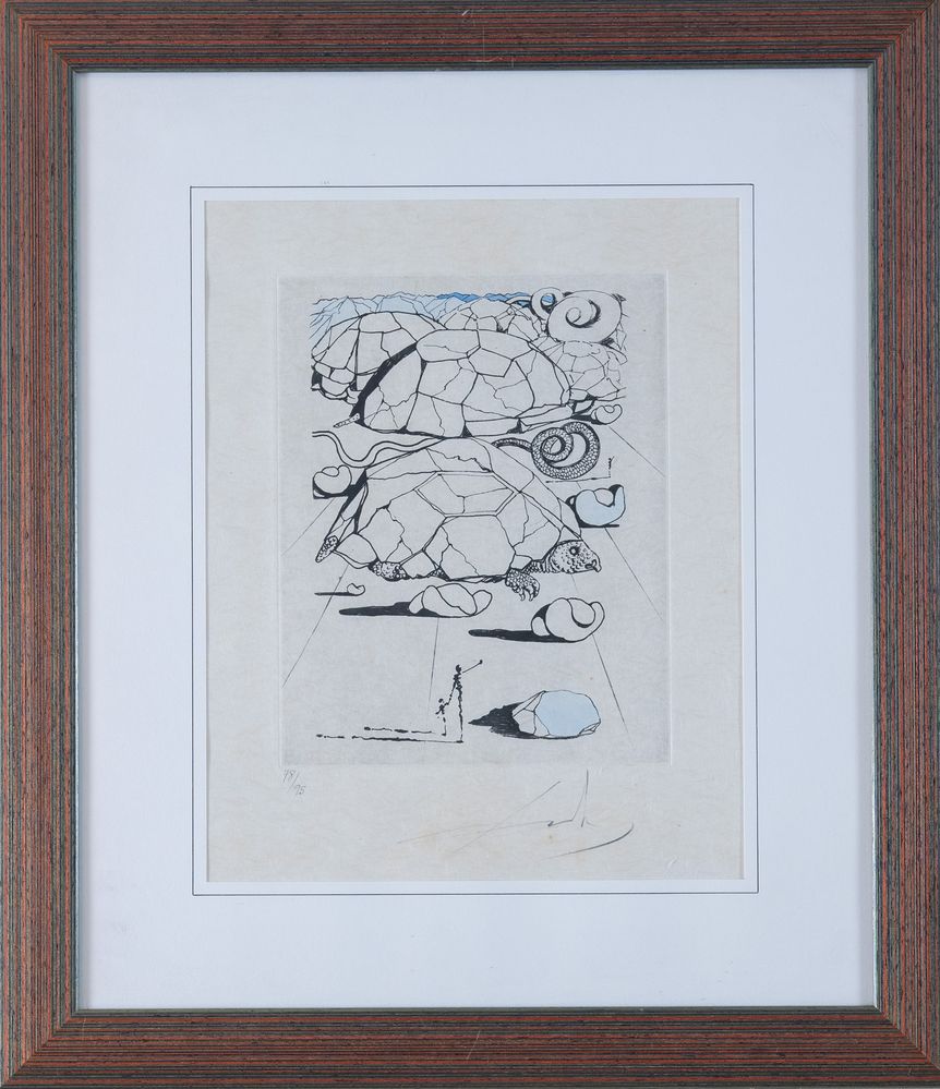 SALVADOR DALI' (Figueres, 1904 - 1989) "The Turtle Mountain". Litografia a colori su carta. Foglio: cm 32,5x25,5, Lastra: cm 23,5x18,5. Opera firmata in basso a destra e recante numero di tiratura 78/95 in basso a sinistra.