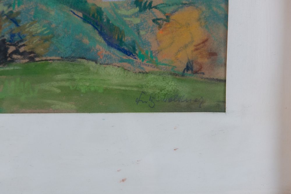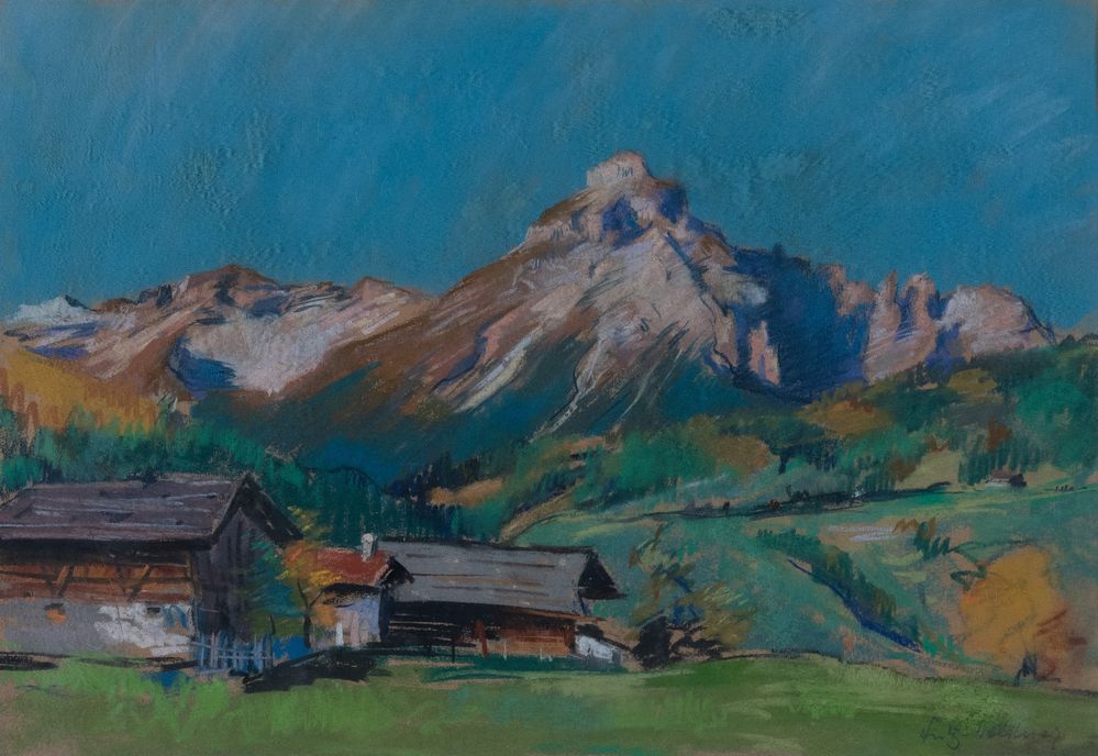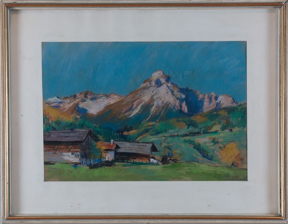 PITTORE ANONIMO ALTOATESINO del XX secolo "Paesaggio Montano". Tecnica mista su carta. Cm 35,5x50,5. Opera firmata in basso a destra con firma non decifrata.
