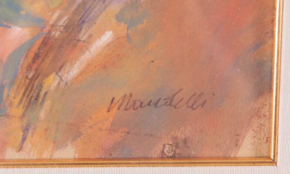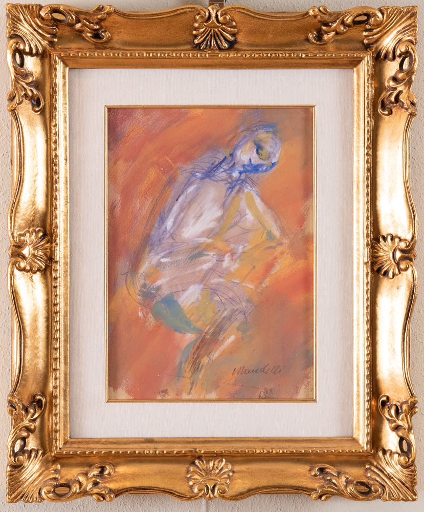 POMPILIO MANDELLI (Villarotta 1912 - Bologna 2006) "Figura", 1948. Tecnica mista su cartone. Cm 35x25. Opera firmata in basso a destra Mandelli. Al retro reca timbro collezione Brintazzoli, Bologna. Opera accompagnata da autentica su fotografia a firma dell'artista.